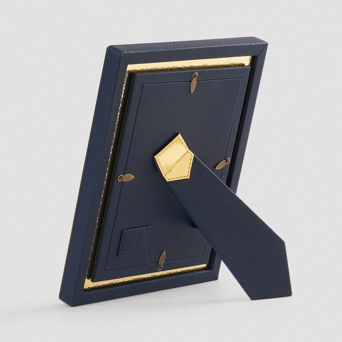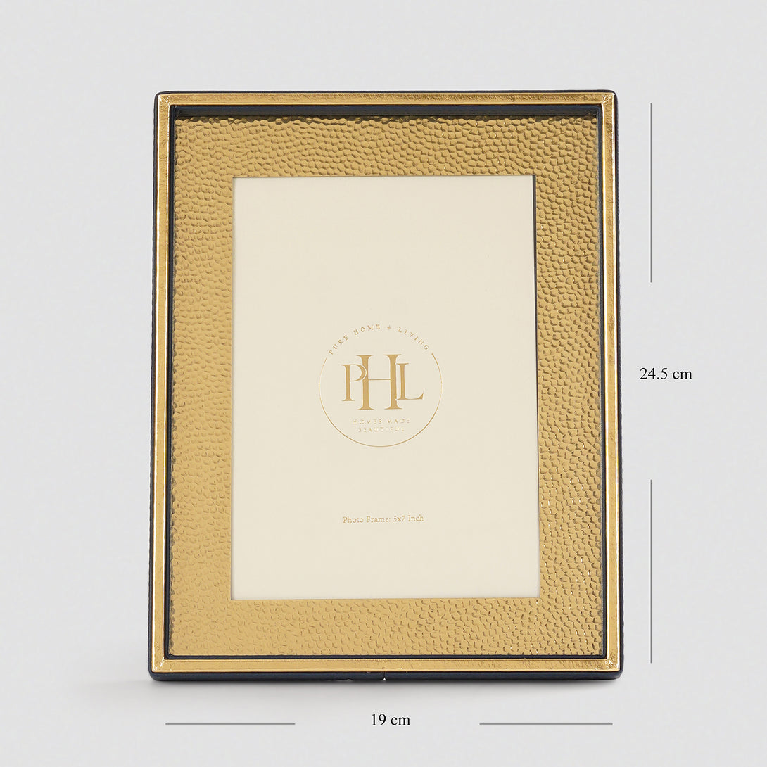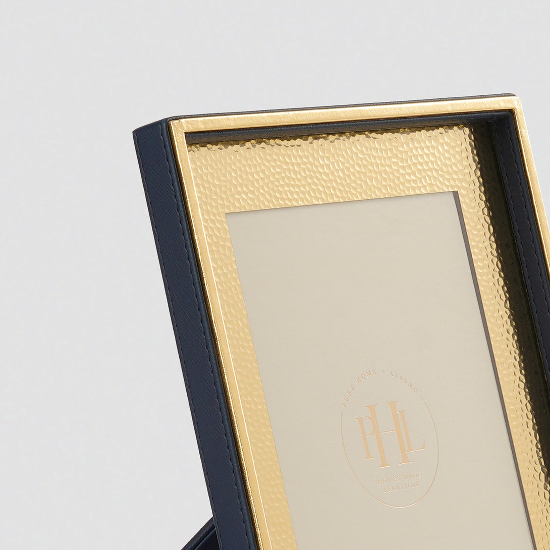This navy and gold hammered photo frame is a luxurious frame with a textured golden border and sleek black edges. Ideal for showcasing portraits, family memories, or art prints, it adds a refined, contemporary charm to desks, consoles, or side tables.