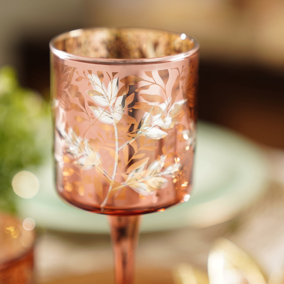 This pink glass stem candle holder is the epitome of elegance and sophistication. Its standout floral pattern lights up on the sleek glass stem as the light of the flickering candle shines through.