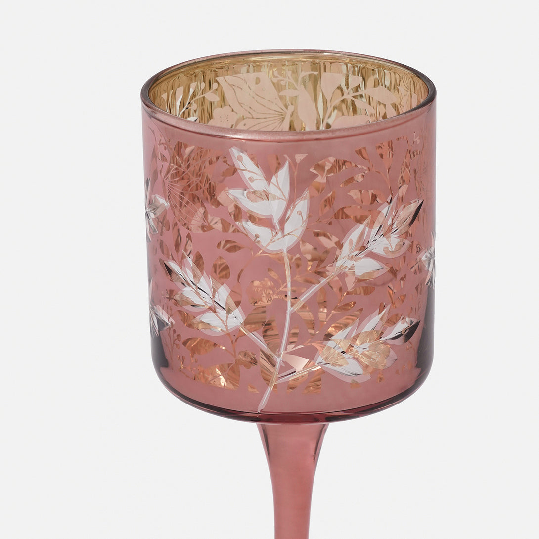 Pink Floral Pattern Glass Stem Candle Holder - Small
