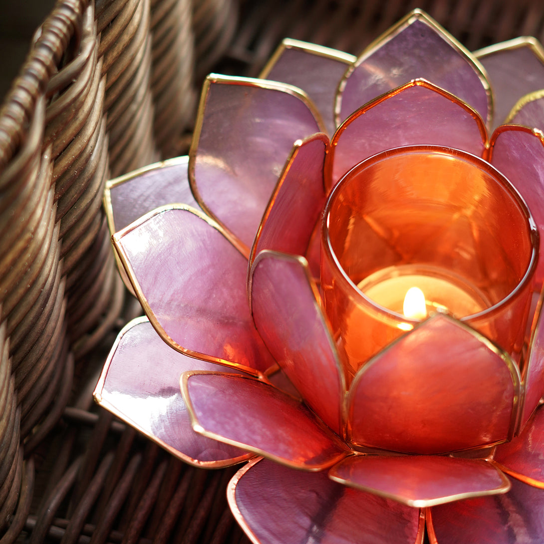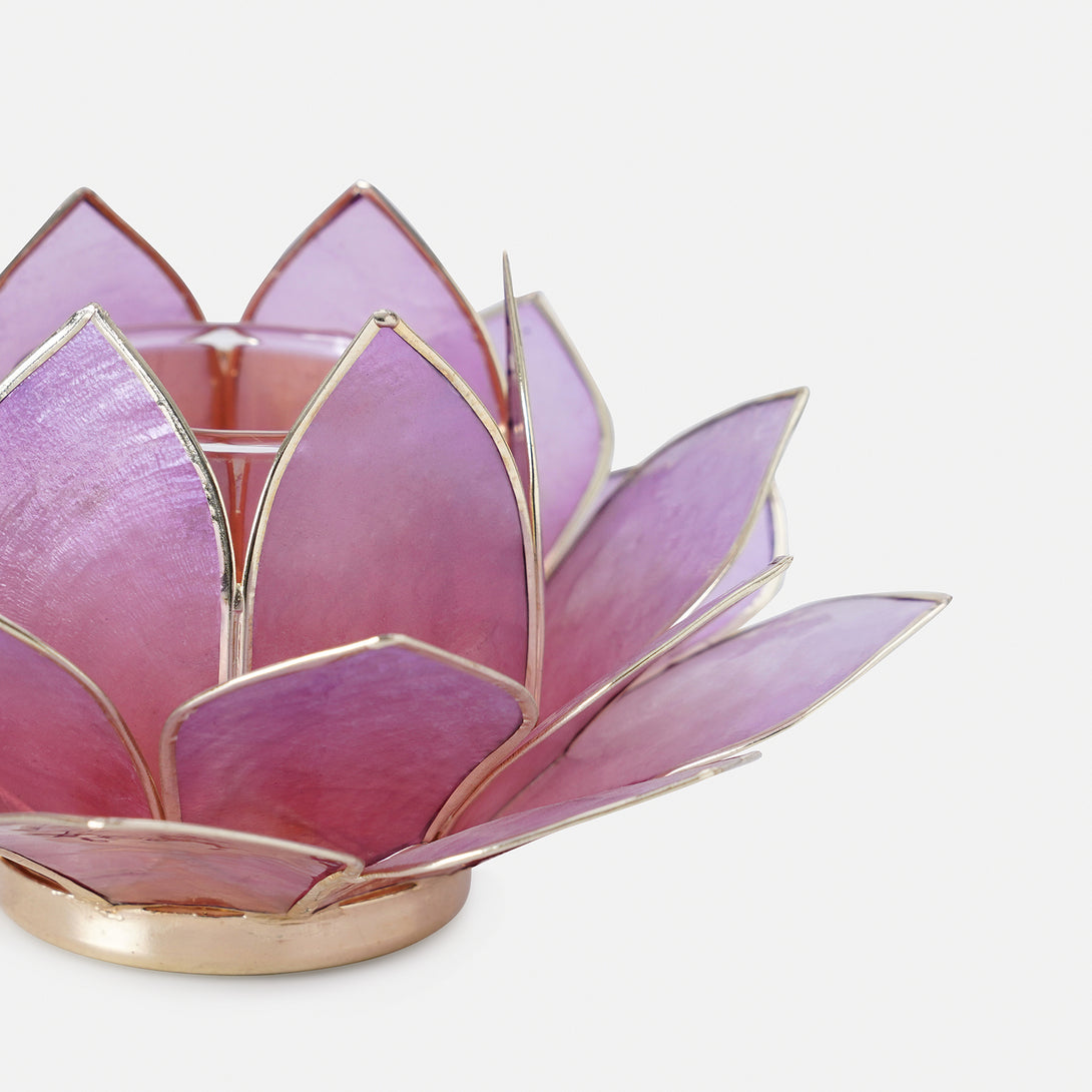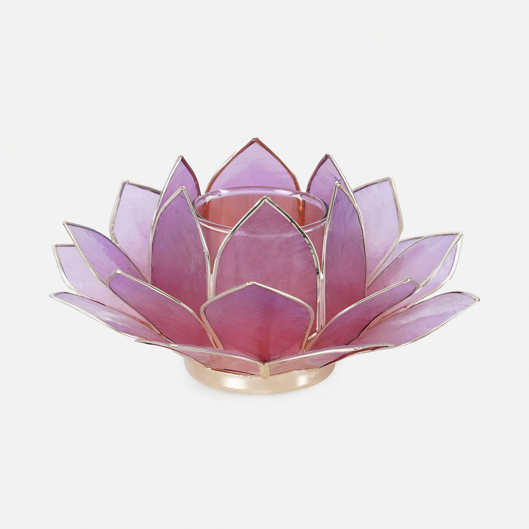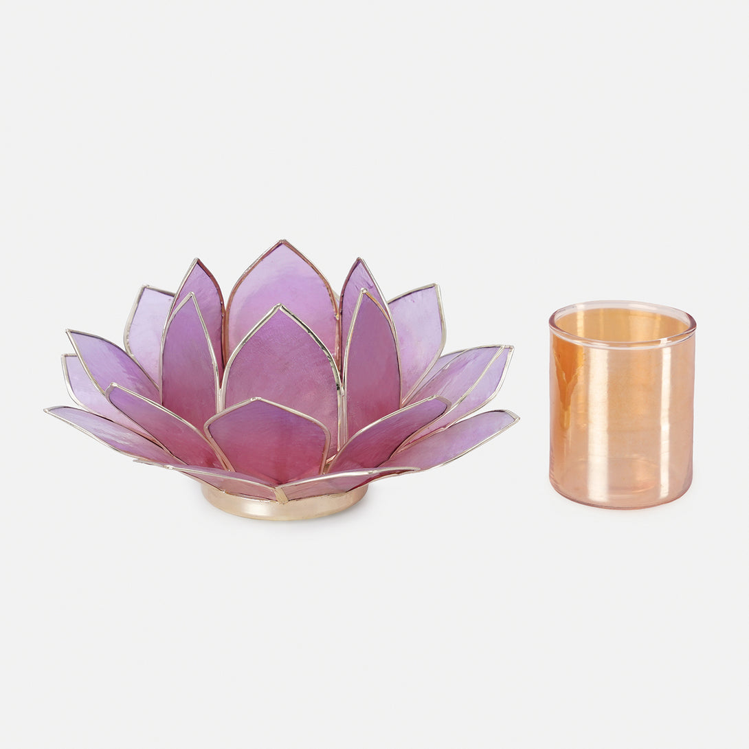 Inspired by a lotus, this tealight holder features twenty two translucent capiz shell petals and a stunning pink and purple ombre tint to elevate any room and ambience.