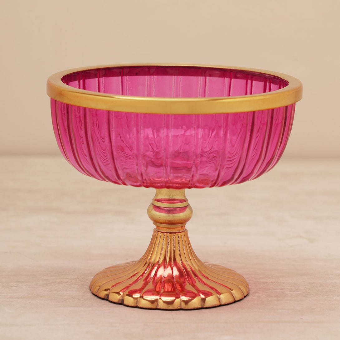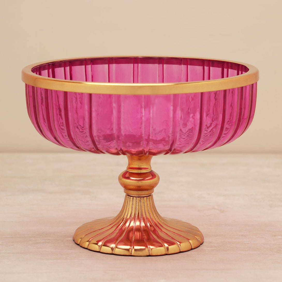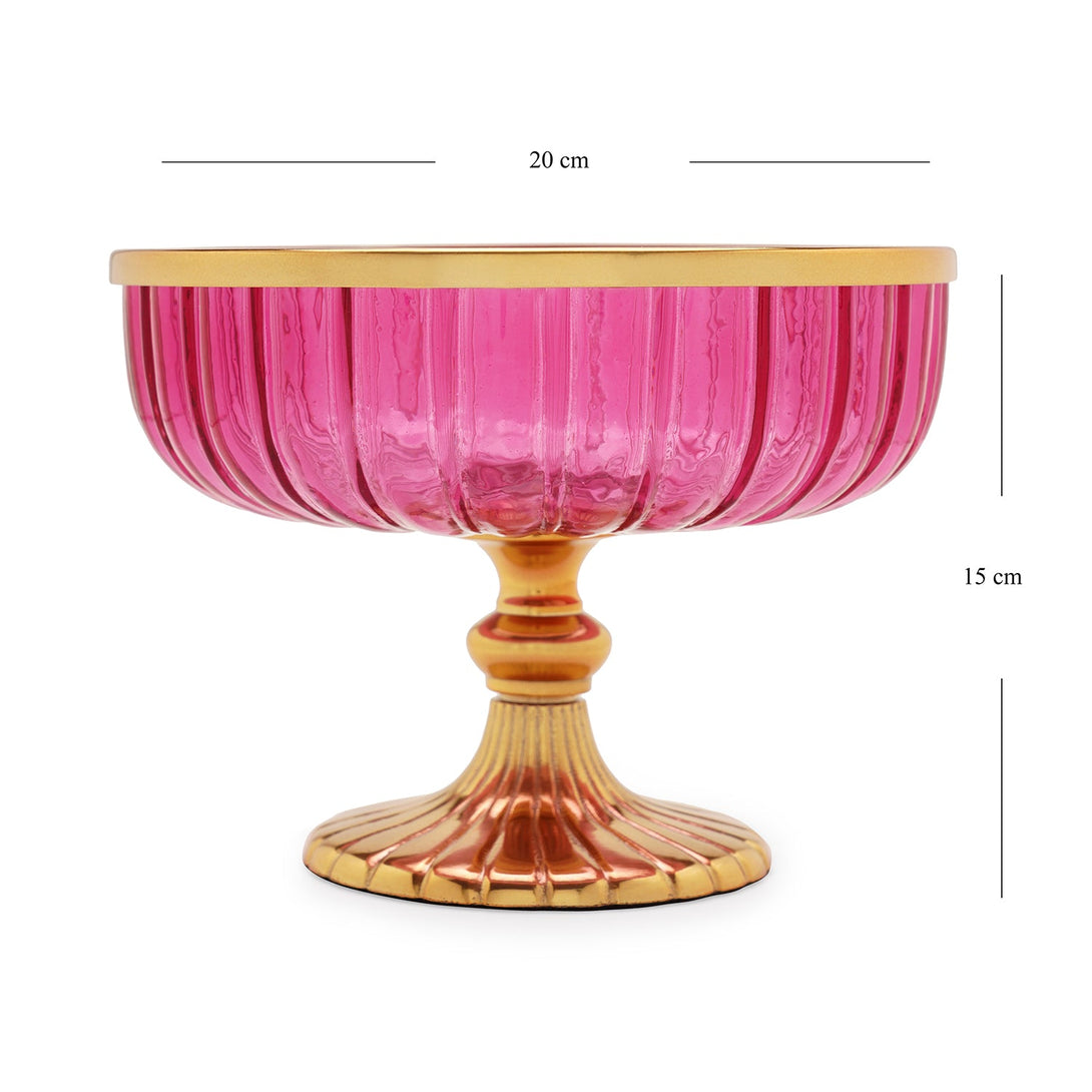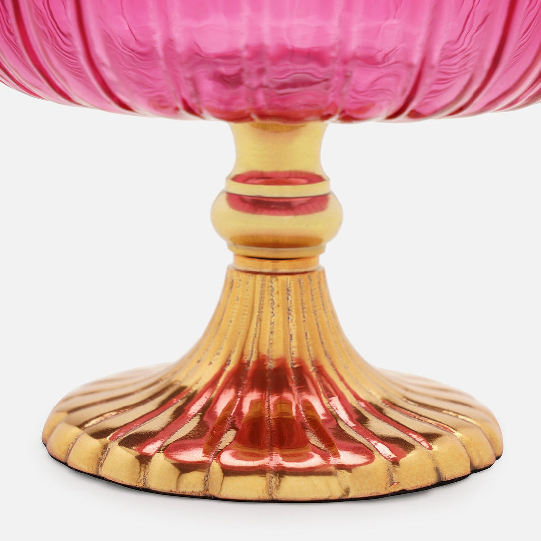 This alluring pink decorative bowl is perfect to add a dash of colour and sophistication to any space. Its one-of-a-kind shape and glossy finish are perfect for a minimal and modern setup. It features ribbed detail, a gold rim and a stunning gold handle. Style it with your favourite petals or as a standalone decor piece.