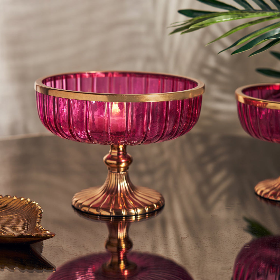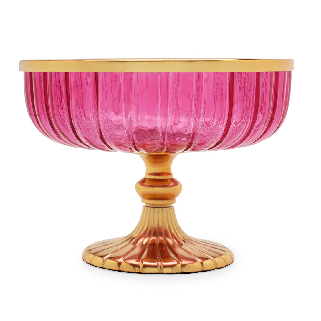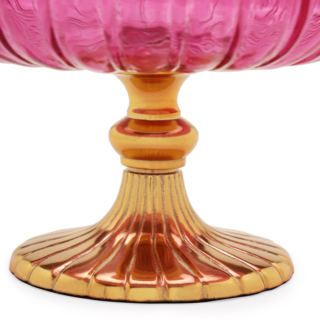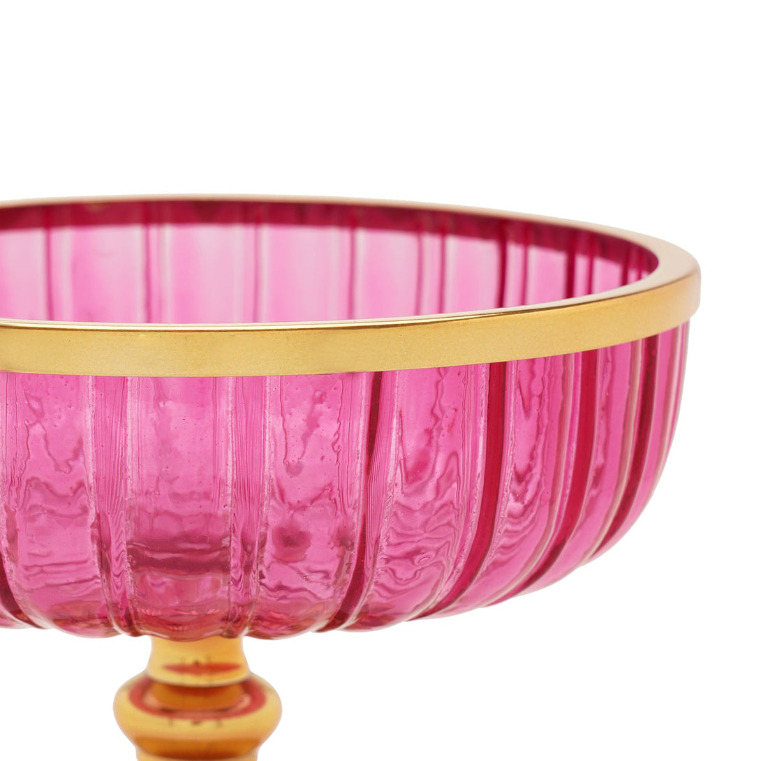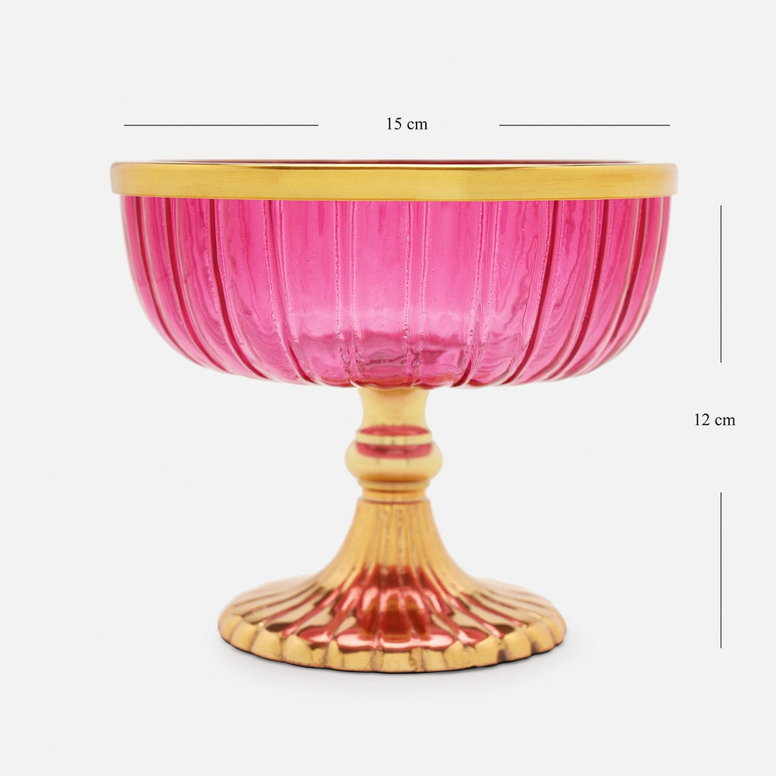 This alluring pink decorative bowl is perfect to add a dash of colour and sophistication to any space. Its one-of-a-kind shape and glossy finish are perfect for a minimal and modern setup. It features ribbed detail, a gold rim and a stunning gold handle. Style it with your favourite petals or as a standalone decor piece.