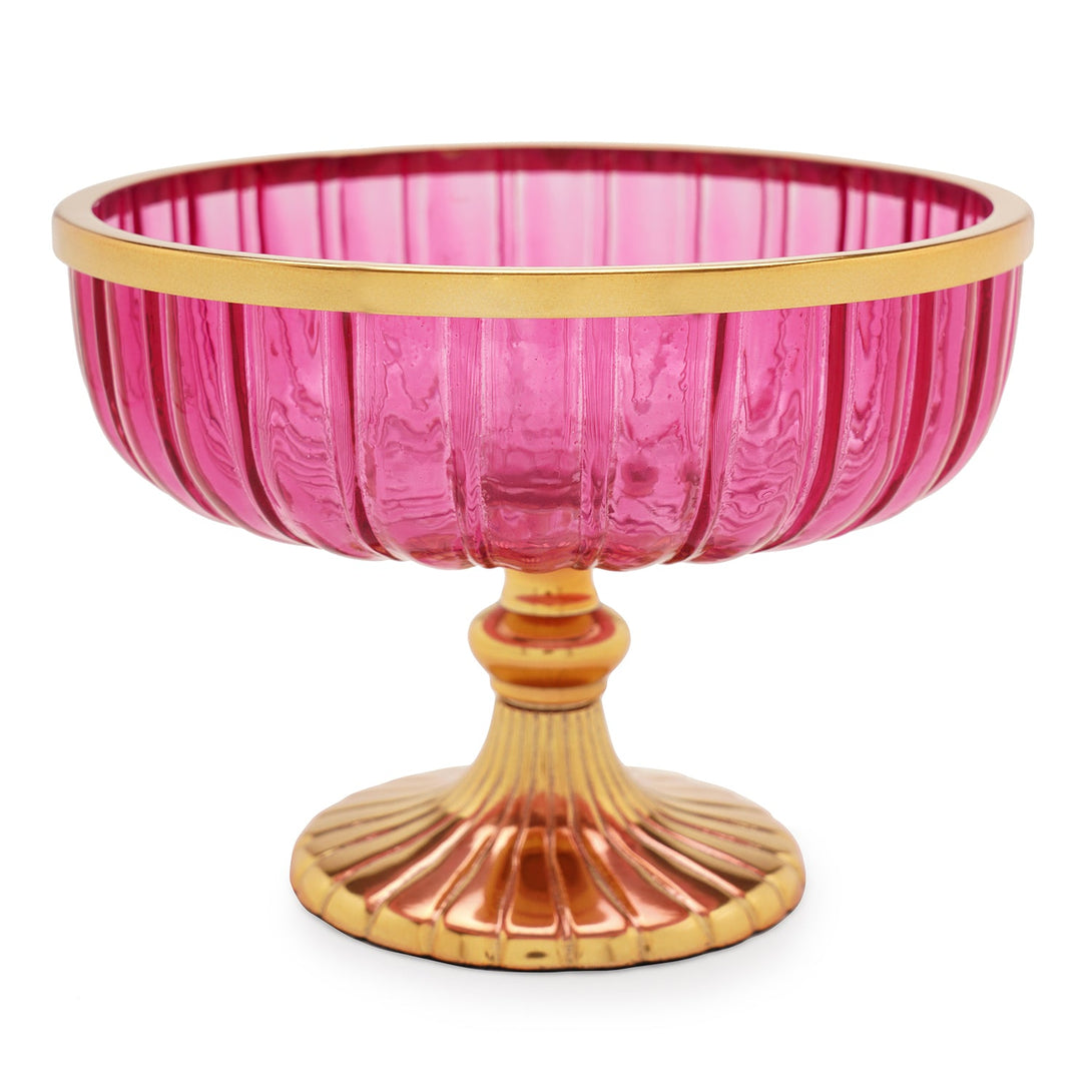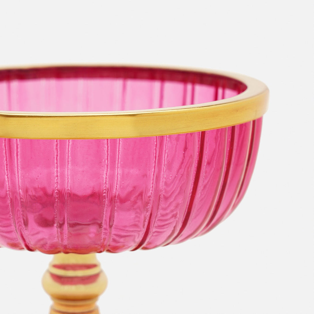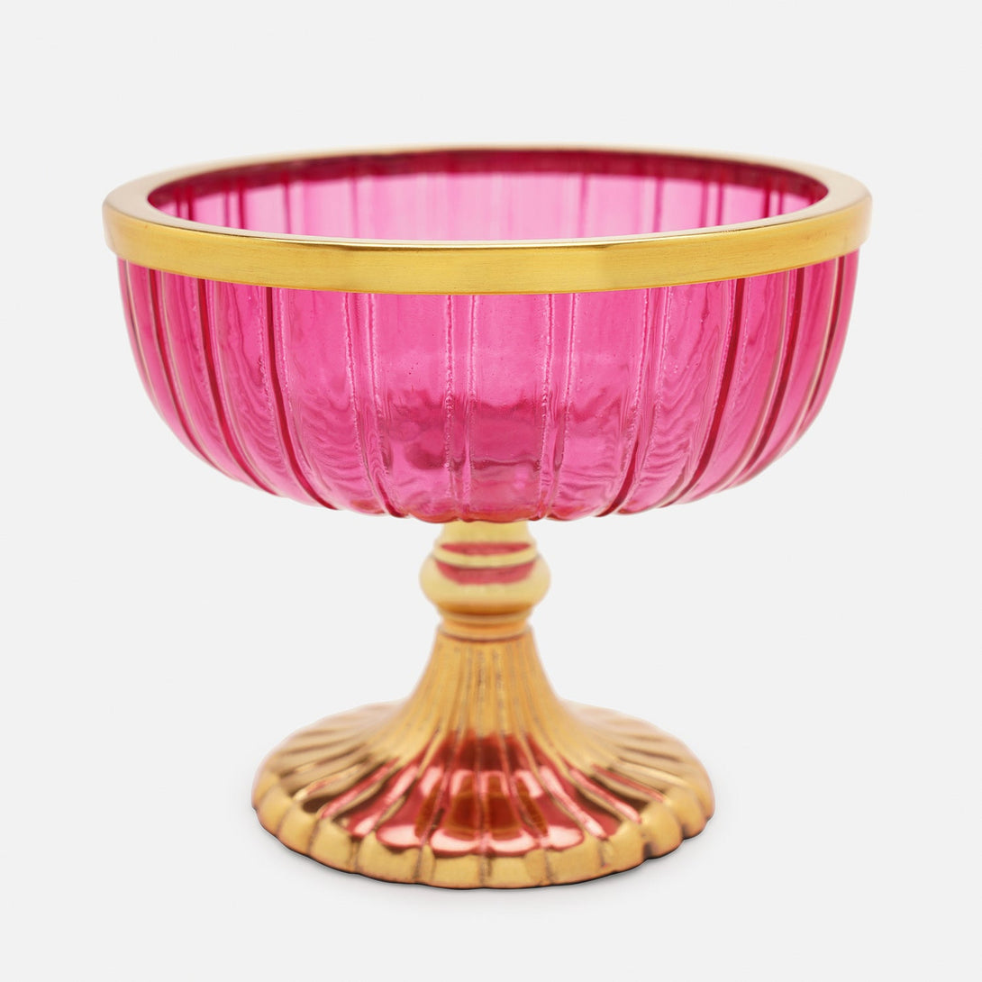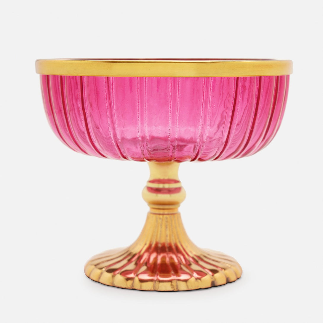 This alluring pink decorative bowl is perfect to add a dash of colour and sophistication to any space. Its one-of-a-kind shape and glossy finish are perfect for a minimal and modern setup. It features ribbed detail, a gold rim and a stunning gold handle. Style it with your favourite petals or as a standalone decor piece.