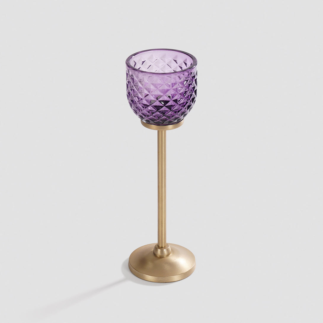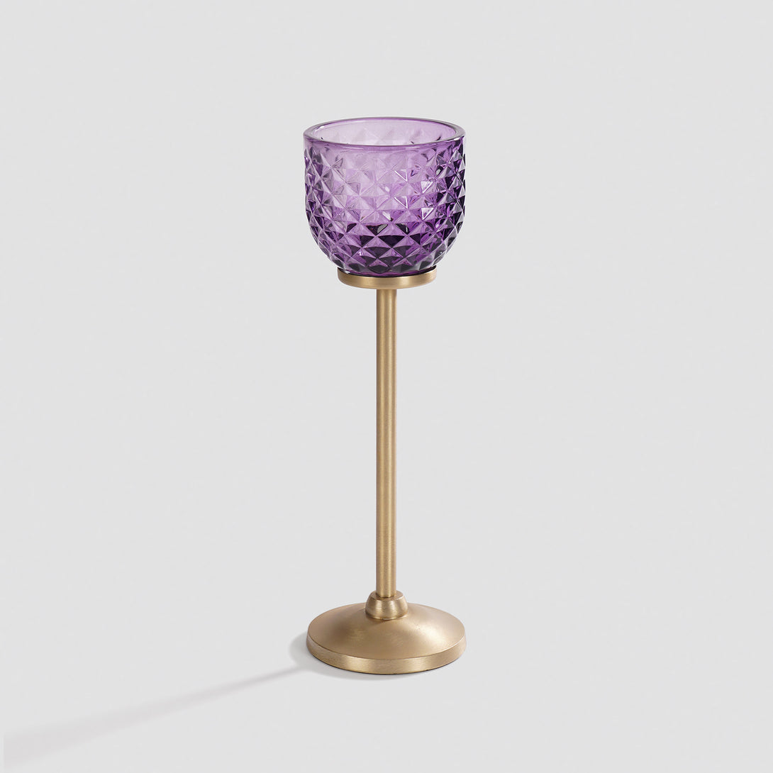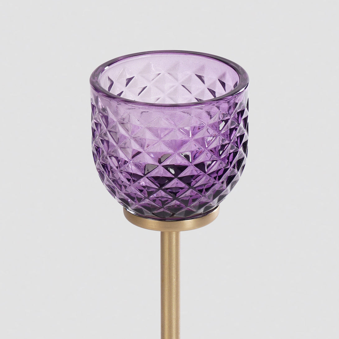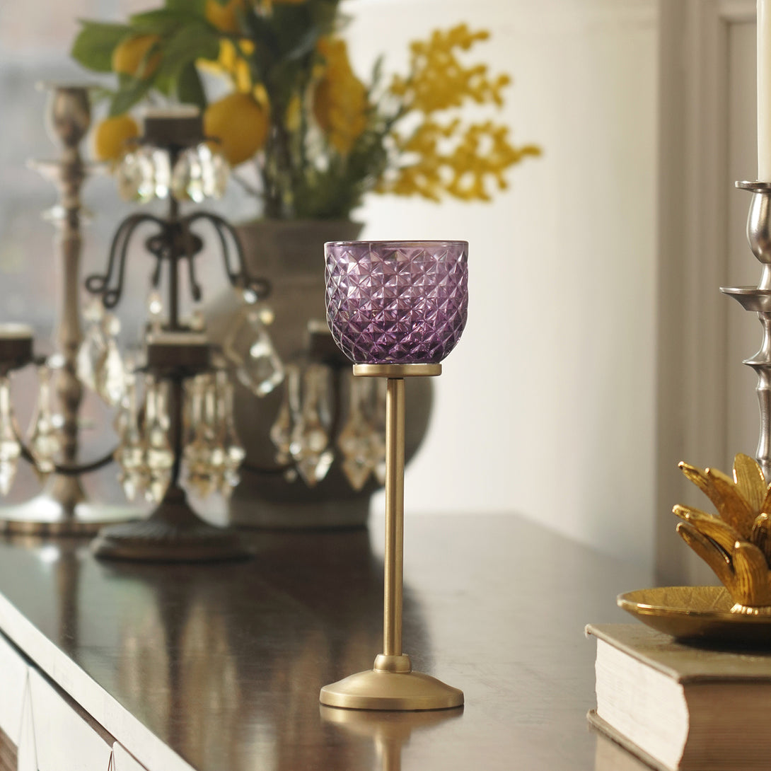 This purple glass votive holder on a tall metallic stand brings a warm, golden glow to any space. Its diamond texture beautifully reflects candlelight, creating a striking play of light and shadow that feels both modern and timeless.