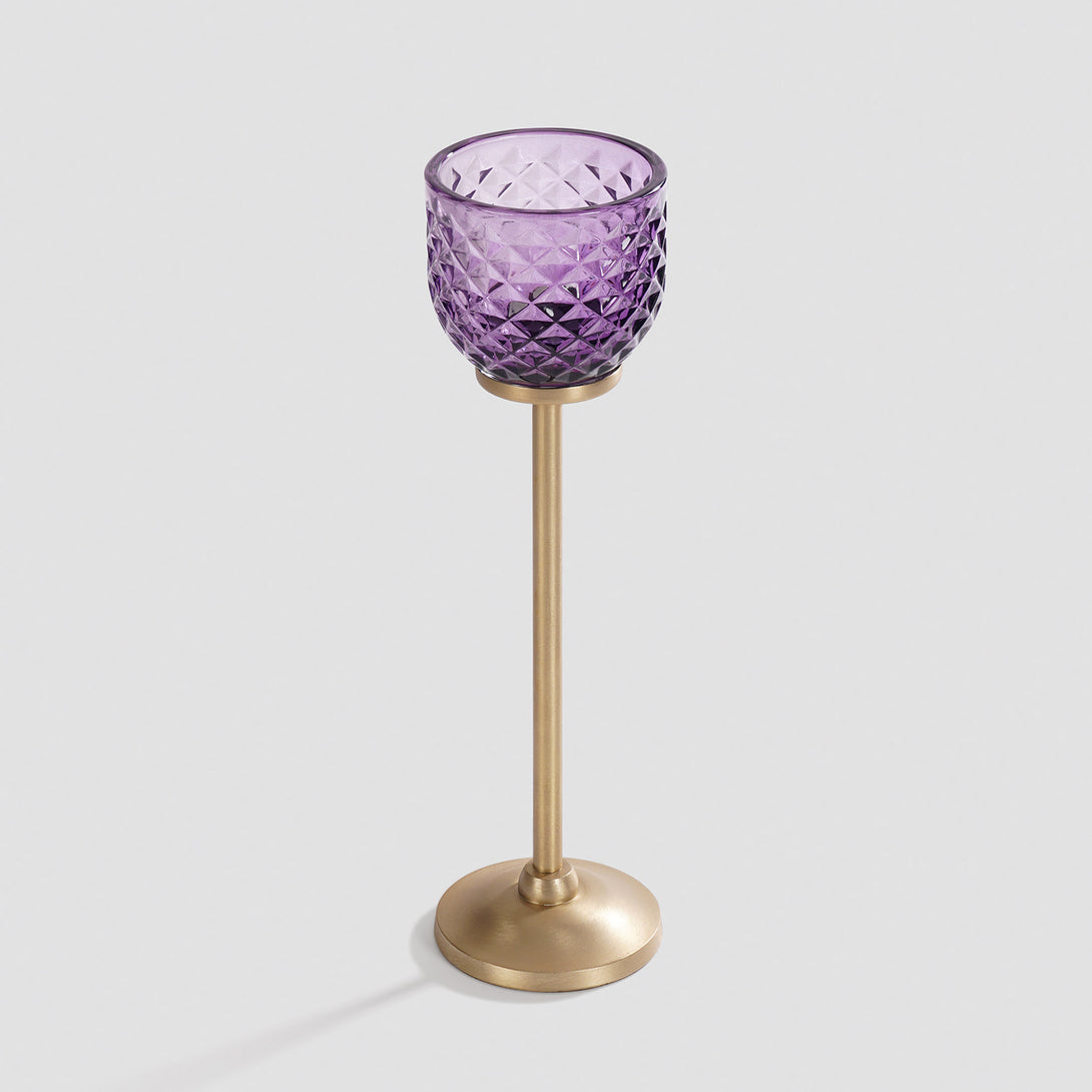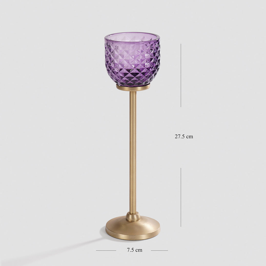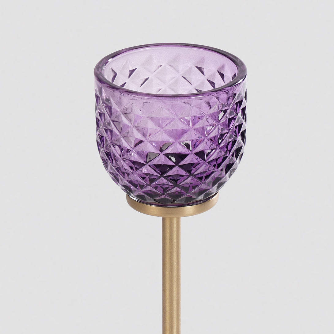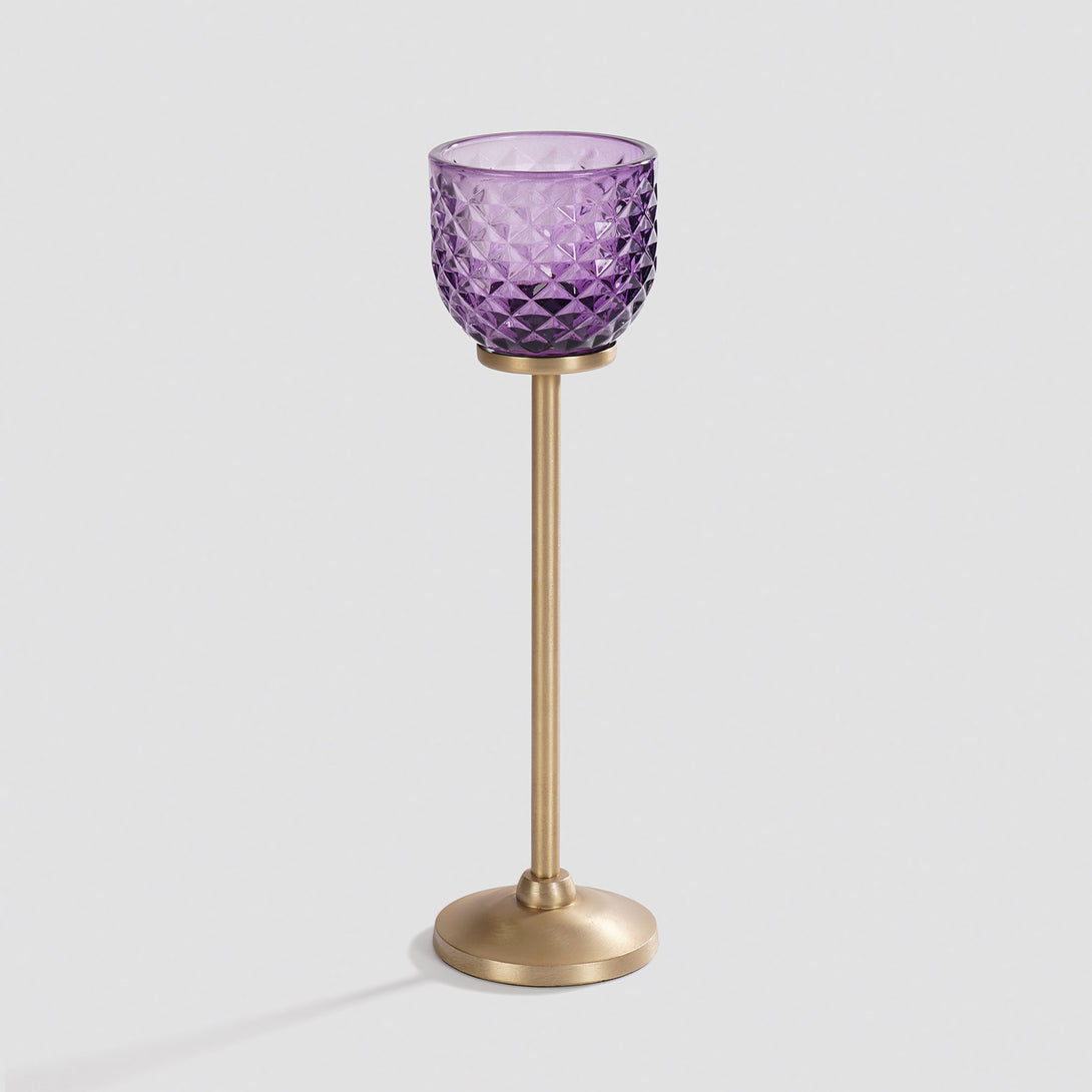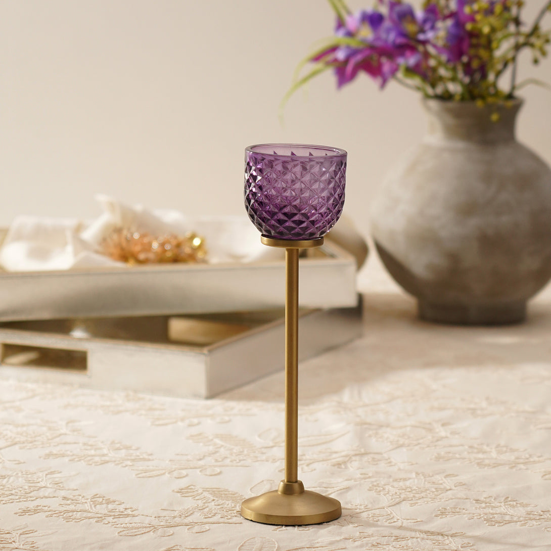 This purple glass votive holder on a tall metallic stand brings a warm, golden glow to any space. Its diamond texture beautifully reflects candlelight, creating a striking play of light and shadow that feels both modern and timeless.