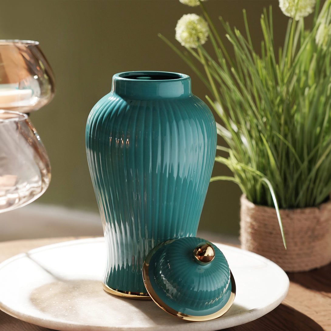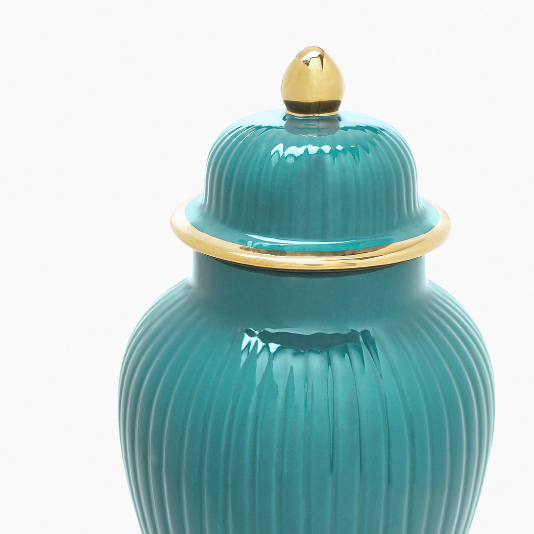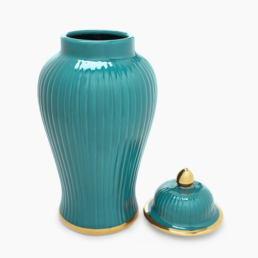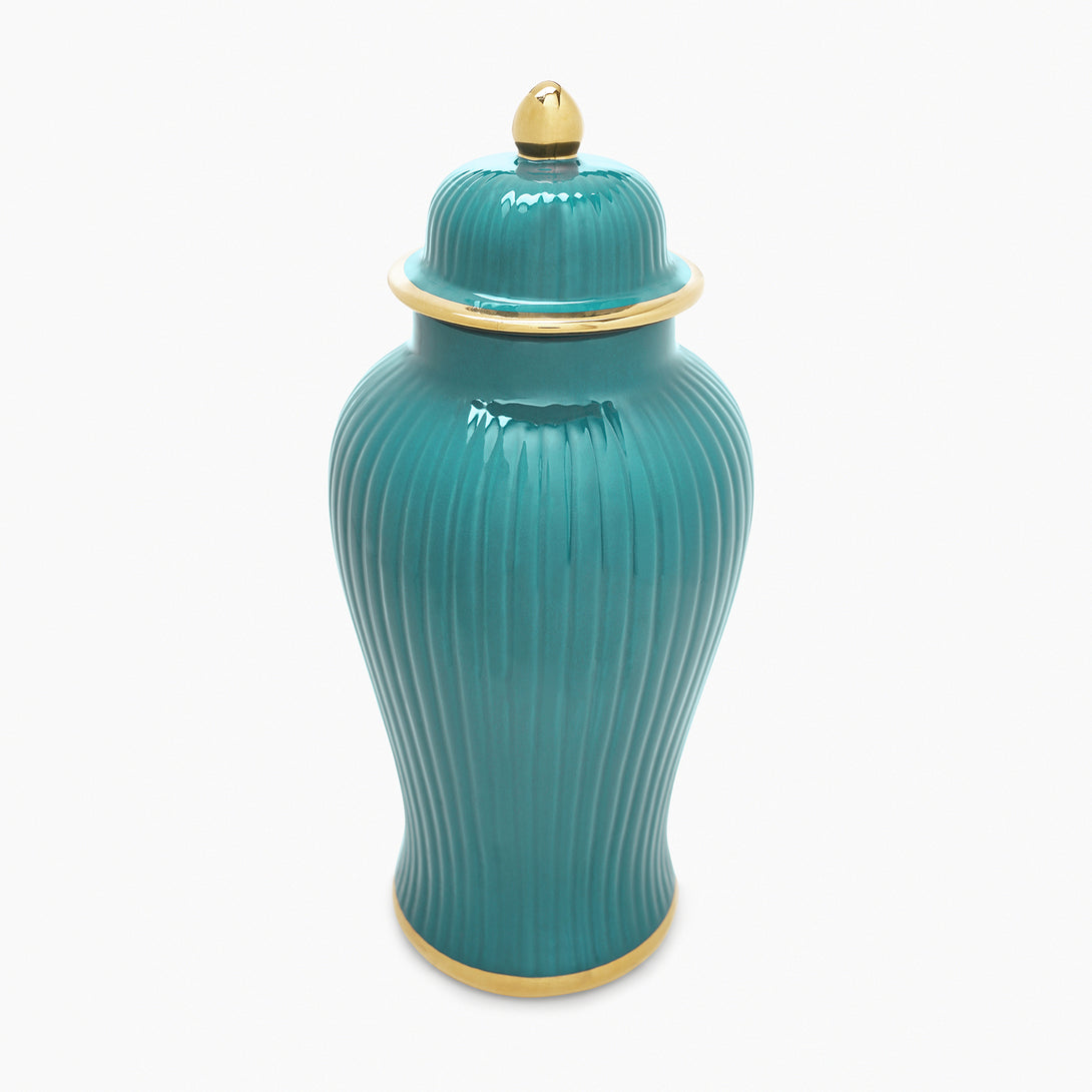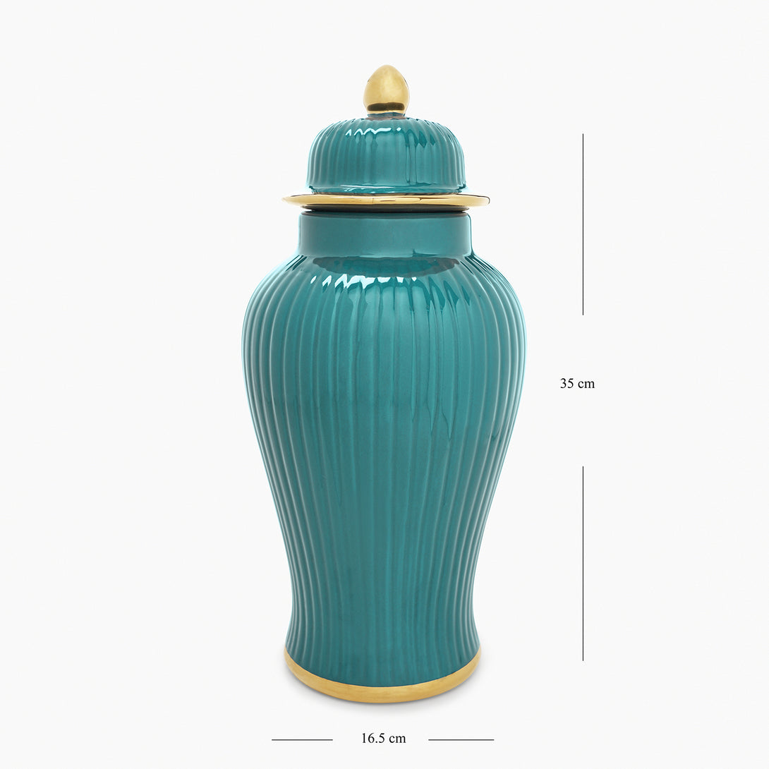 Teal Ribbed Ceramic Urn wth Lid - Small