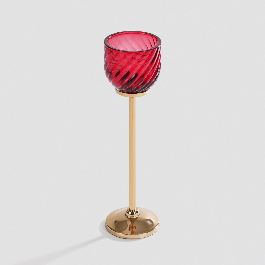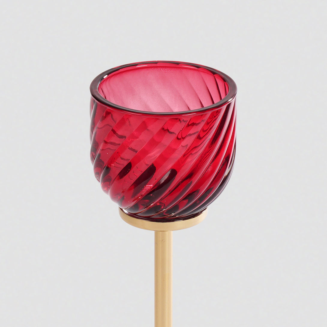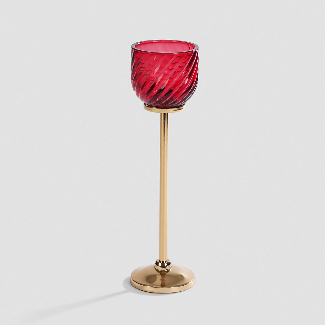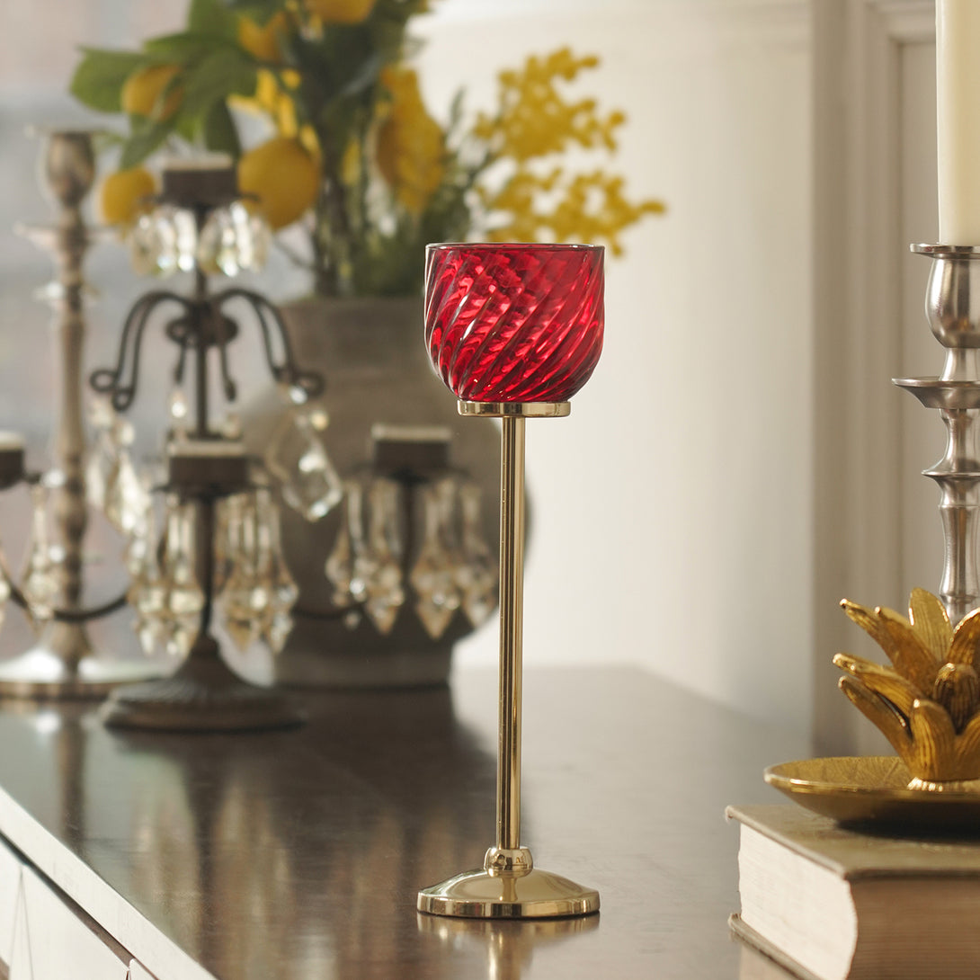 This red glass votive holder on a tall metallic stand brings a warm, golden glow to any space. Its swirling texture beautifully reflects candlelight, creating a striking play of light and shadow that feels both modern and timeless.