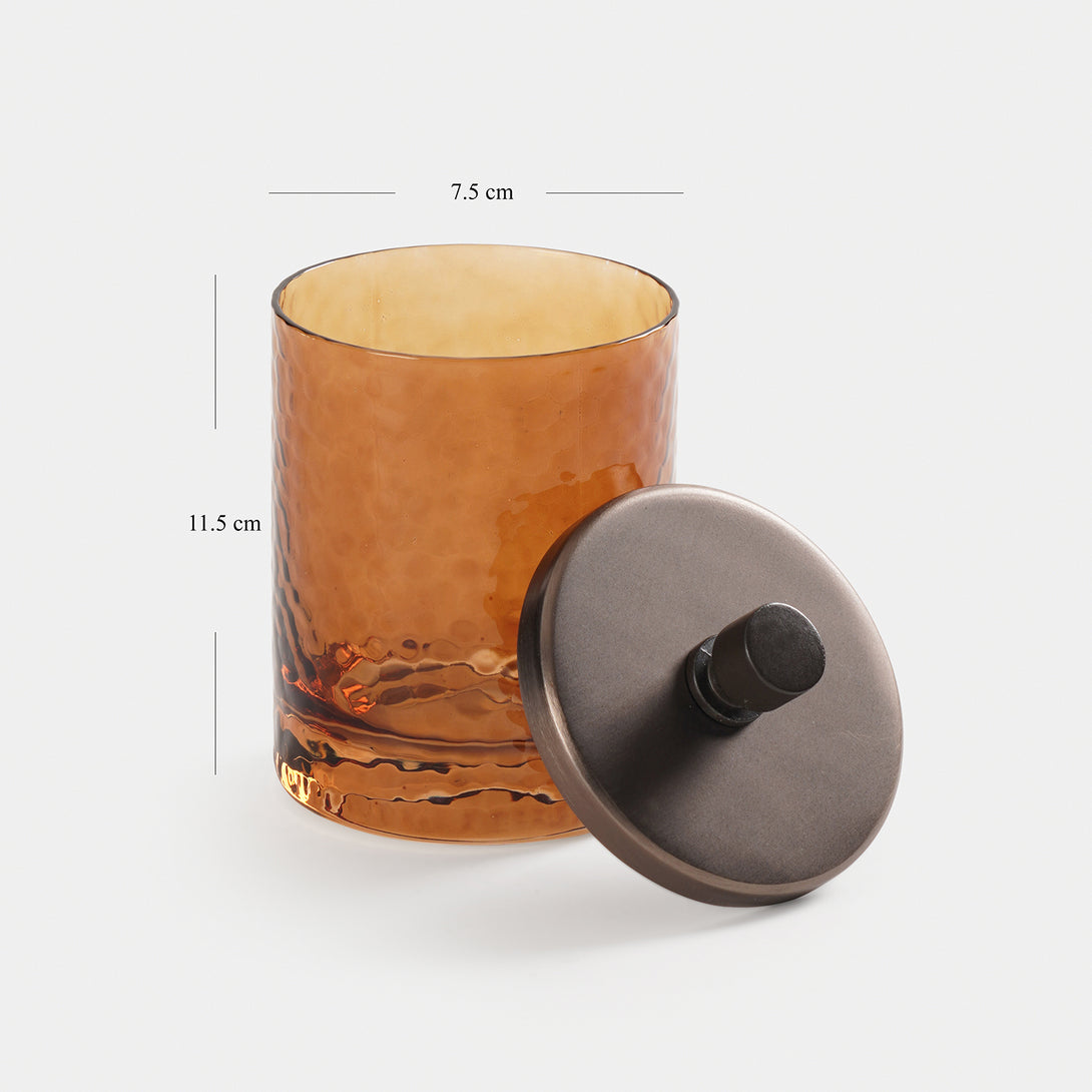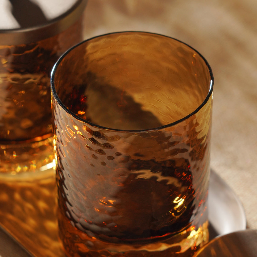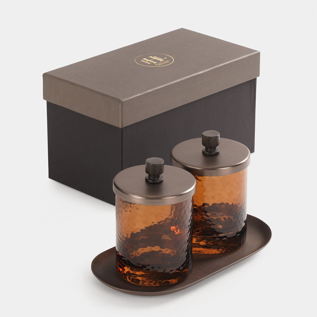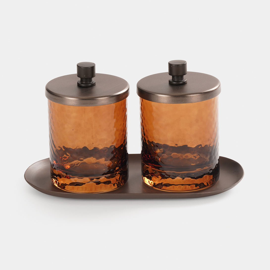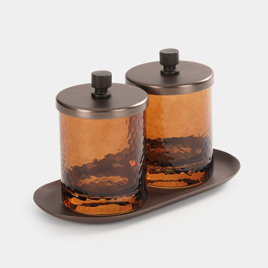 Set of 2 Amber Hammered Condiment Jars with Tray - Large