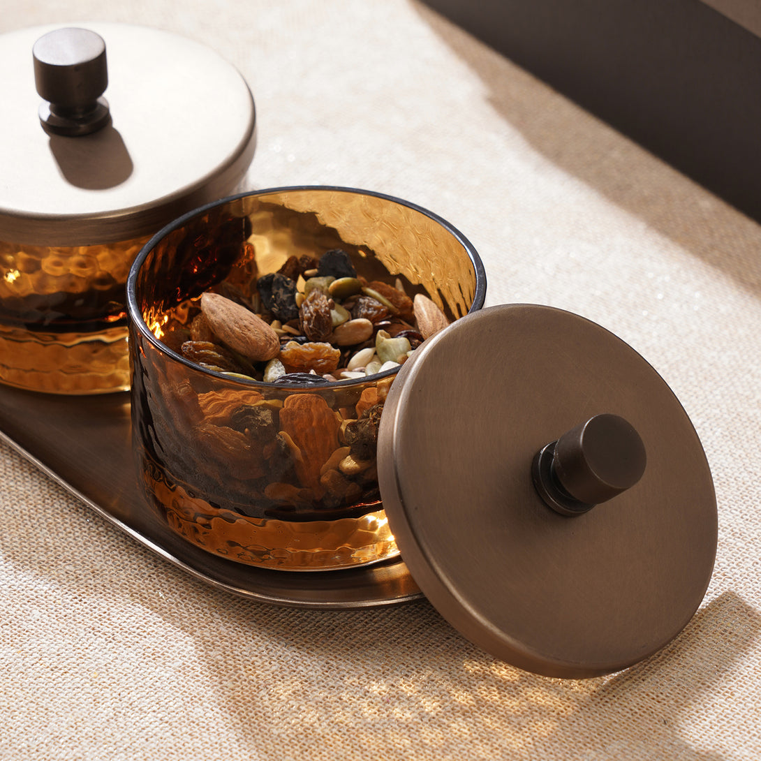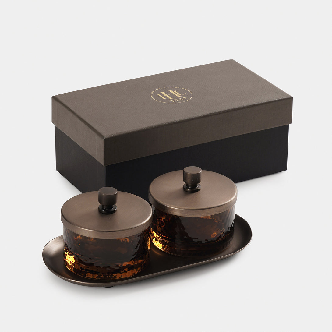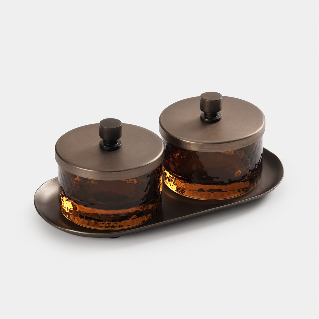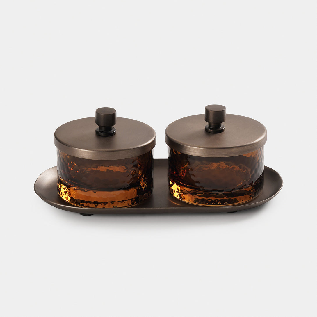 Set of 2 Amber Hammered Condiment Jars with Tray - Medium