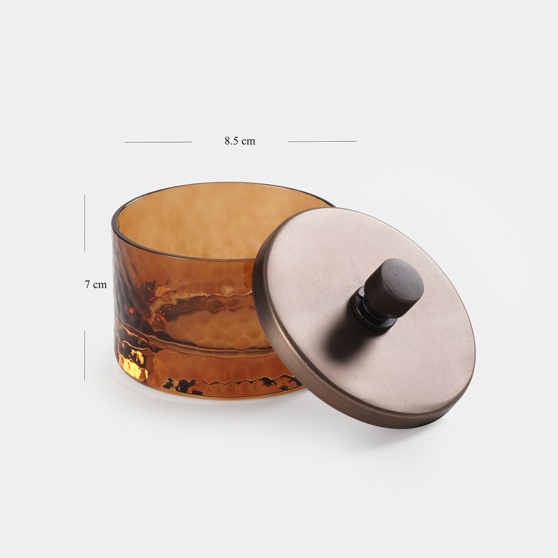 Comes in an amber with hammered detail.