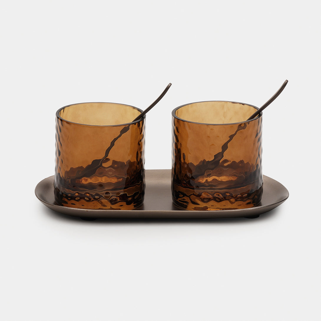 Set of 2 Amber Hammered Condiment Jars with Tray - Small