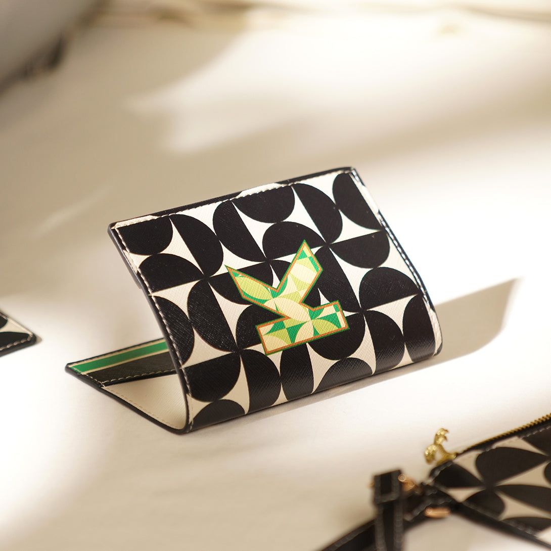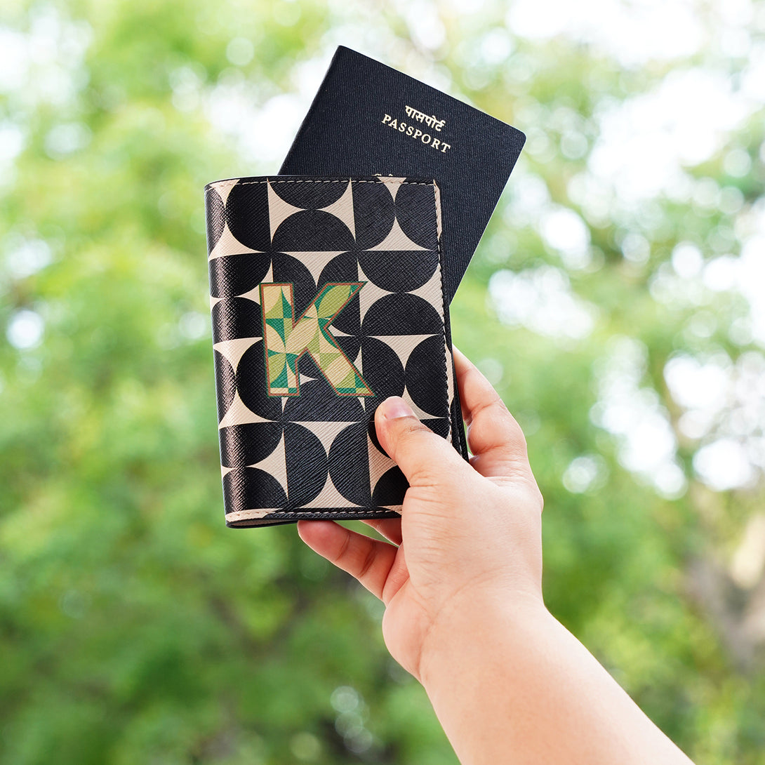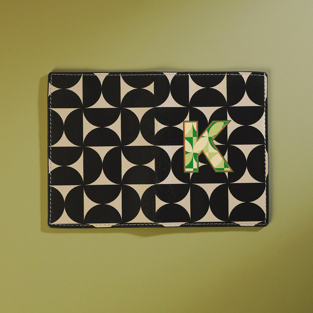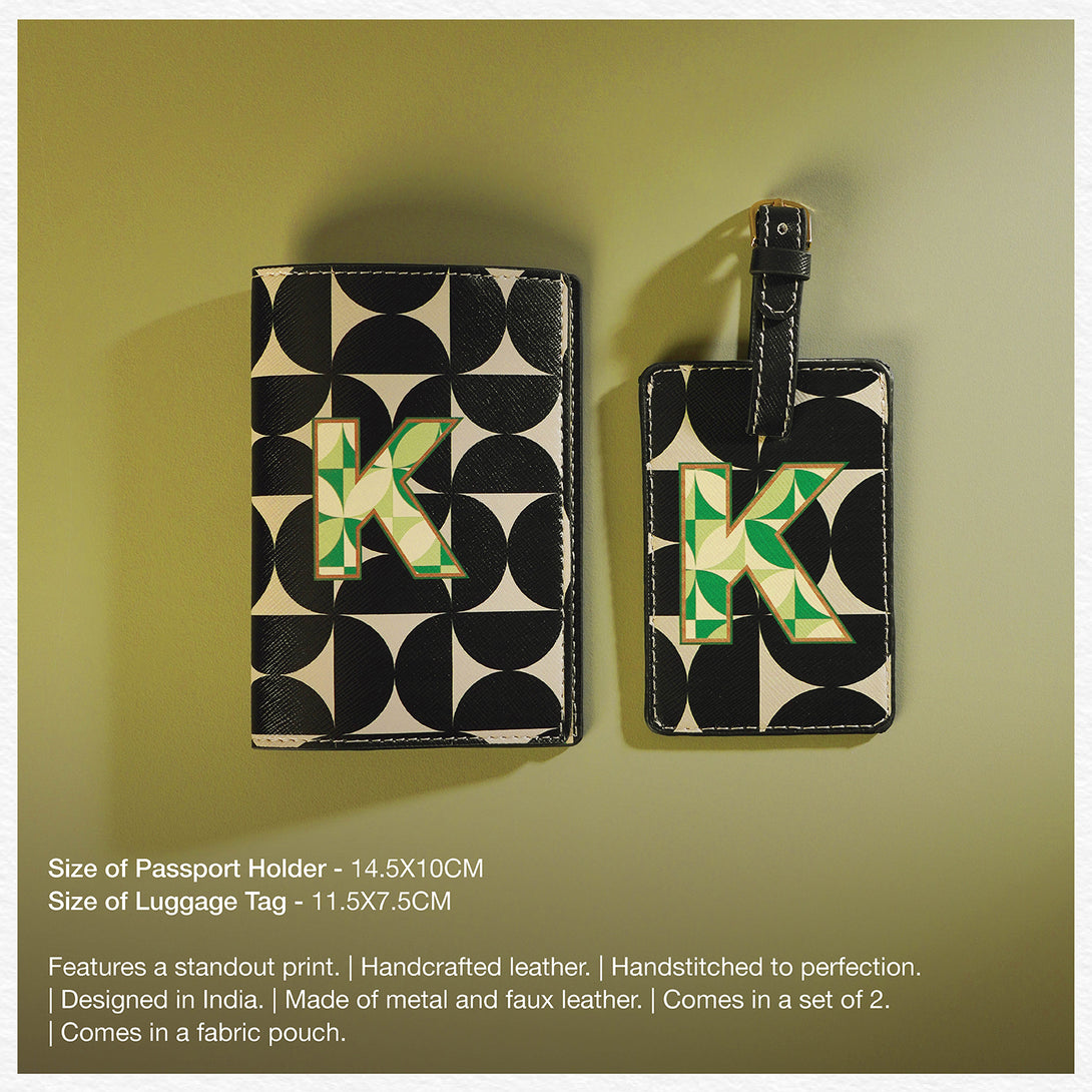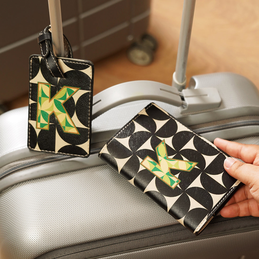 Meet your ultimate travel companion: a passport holder and luggage tag that blends bold style with personal flair. The striking black and green geometric backdrop, paired with a vibrant 'K', makes it not just a travel essential but a statement of identity and adventure.