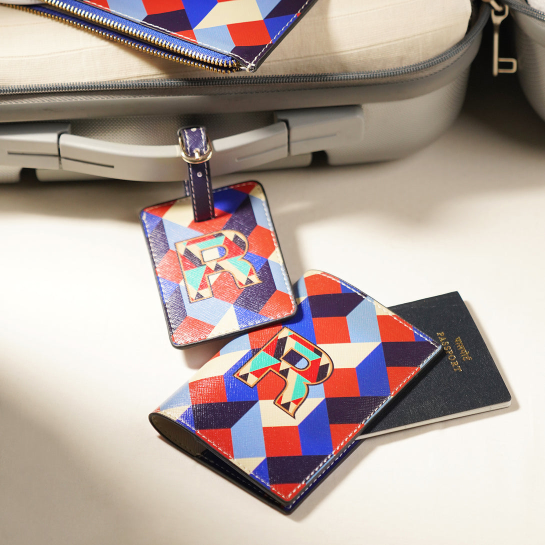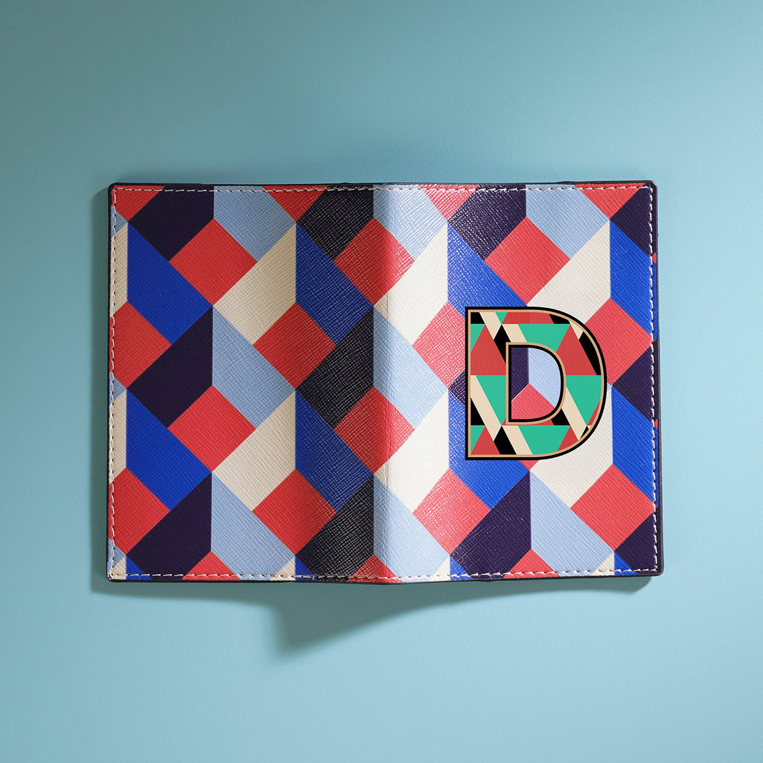 Meet your ultimate travel companion: a passport holder and luggage tag that blends bold style with personal flair. The striking blue and peach geometric backdrop, paired with a vibrant 'D', makes it not just a travel essential but a statement of identity and adventure.
