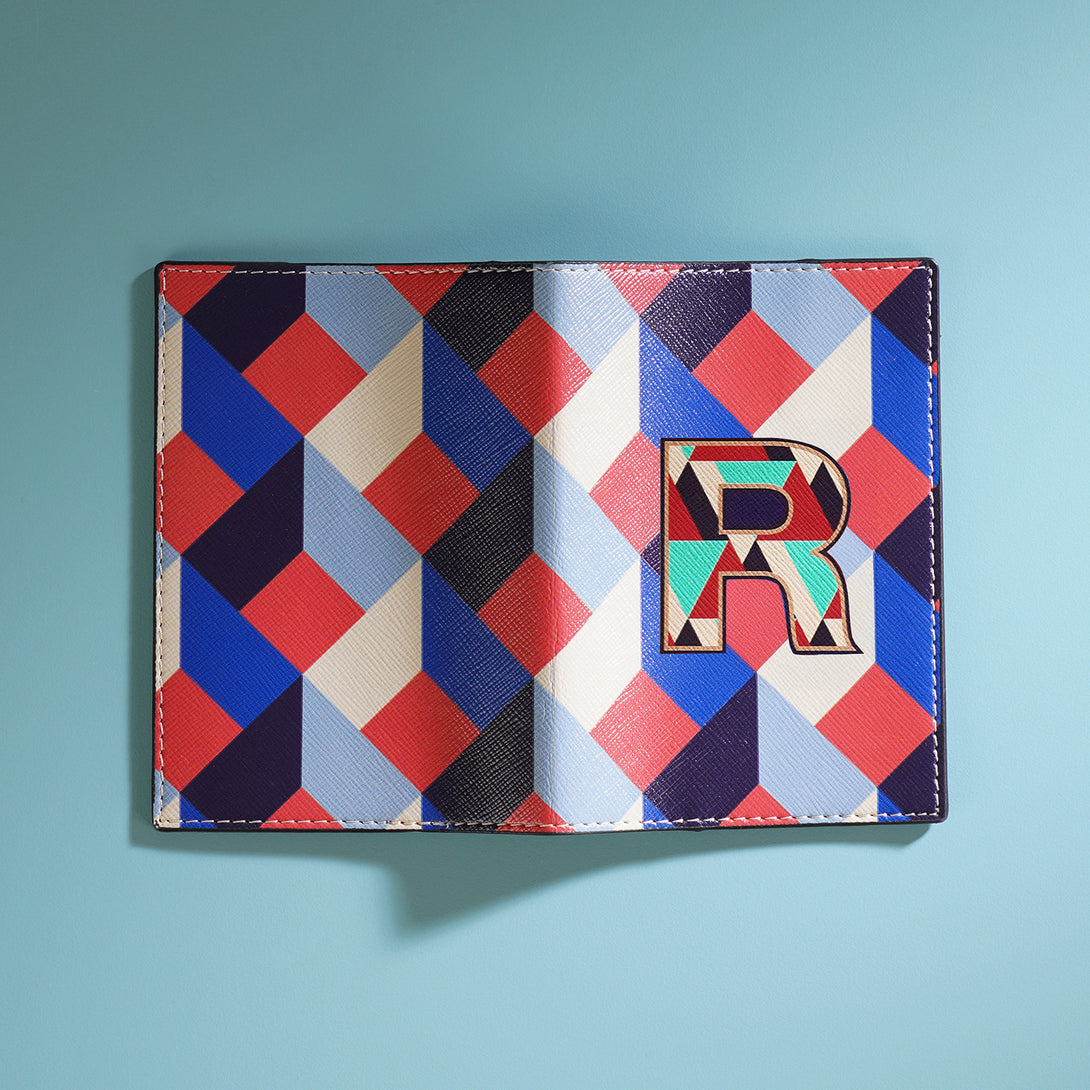 Meet your ultimate travel companion: a passport holder and luggage tag that blends bold style with personal flair. The striking blue and peach geometric backdrop, paired with a vibrant 'R', makes it not just a travel essential but a statement of identity and adventure.