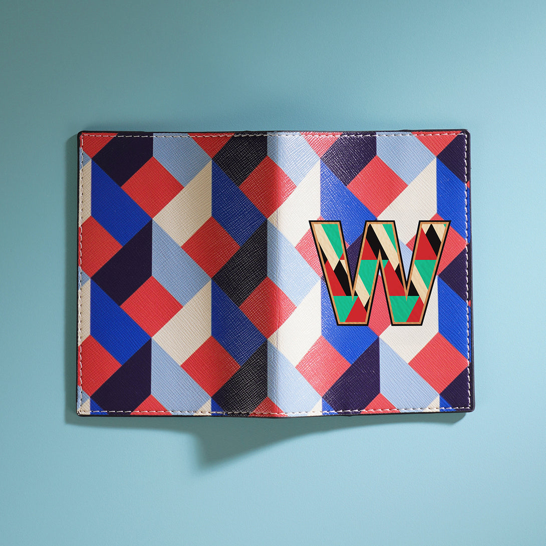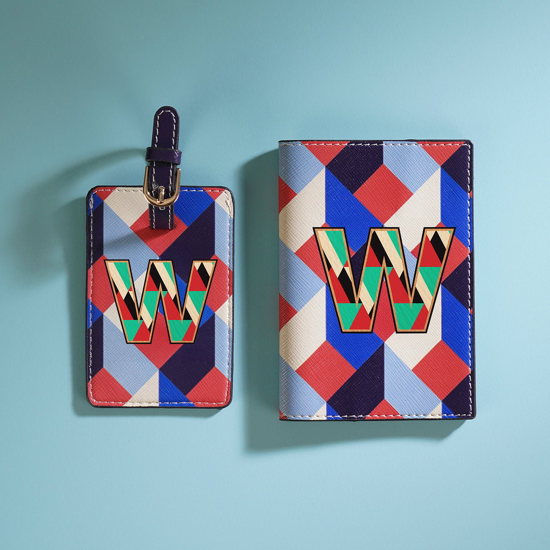 Meet your ultimate travel companion: a passport holder and luggage tag that blends bold style with personal flair. The striking blue and peach geometric backdrop, paired with a vibrant 'W', makes it not just a travel essential but a statement of identity and adventure.