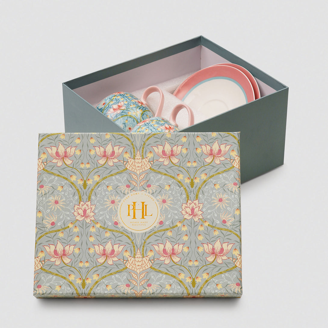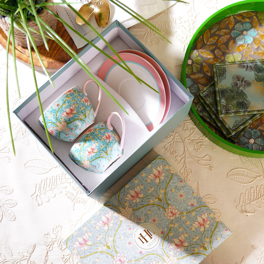 This blue floral ceramic tea cups and saucers are an elegant set. Decorated with delicate lotus-inspired patterns in blue, pink, and yellow tones, this set adds charm and sophistication to tea-time gatherings.