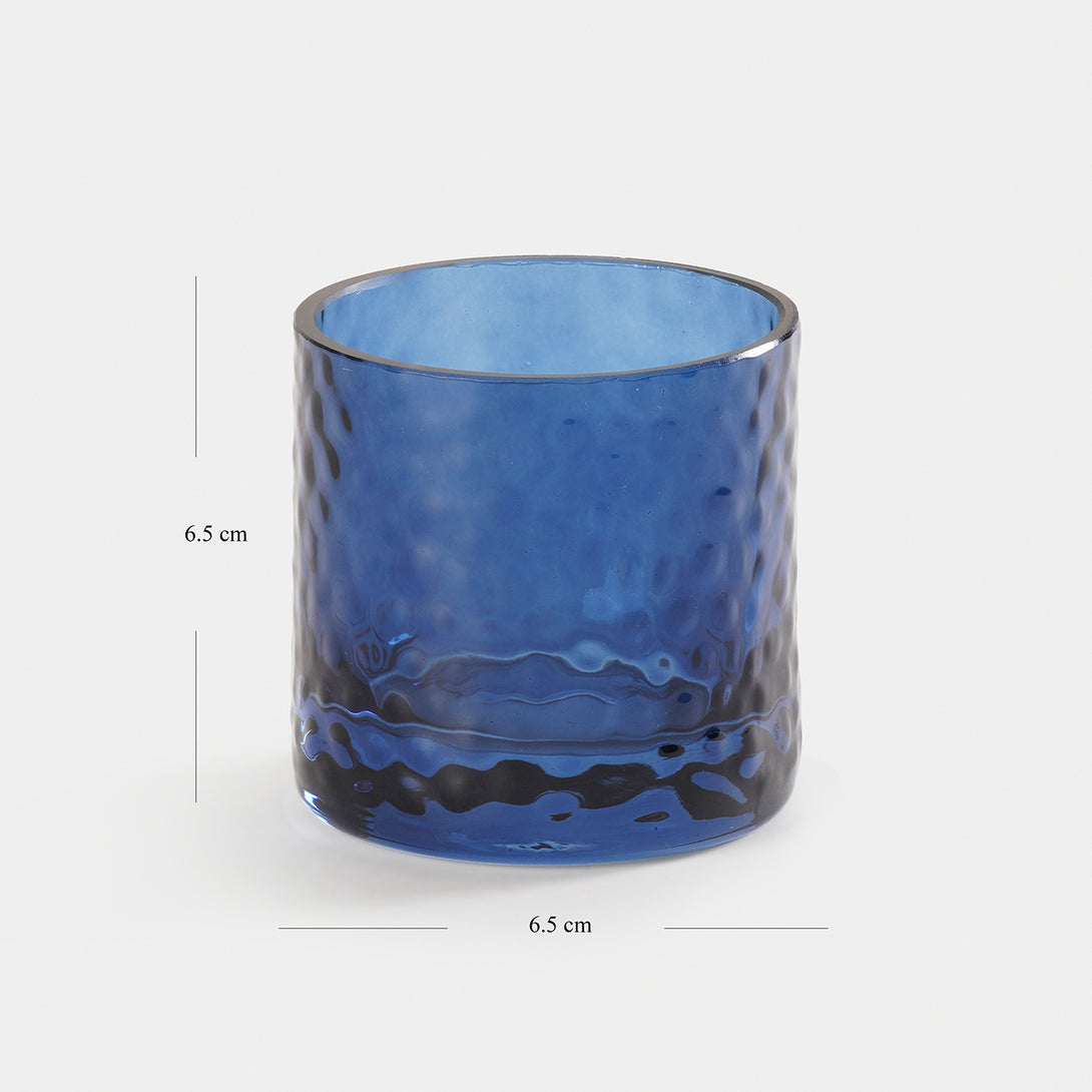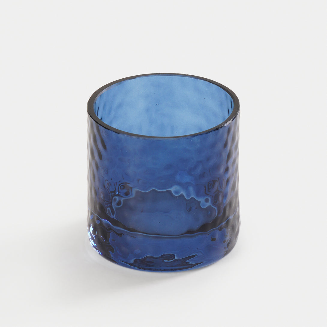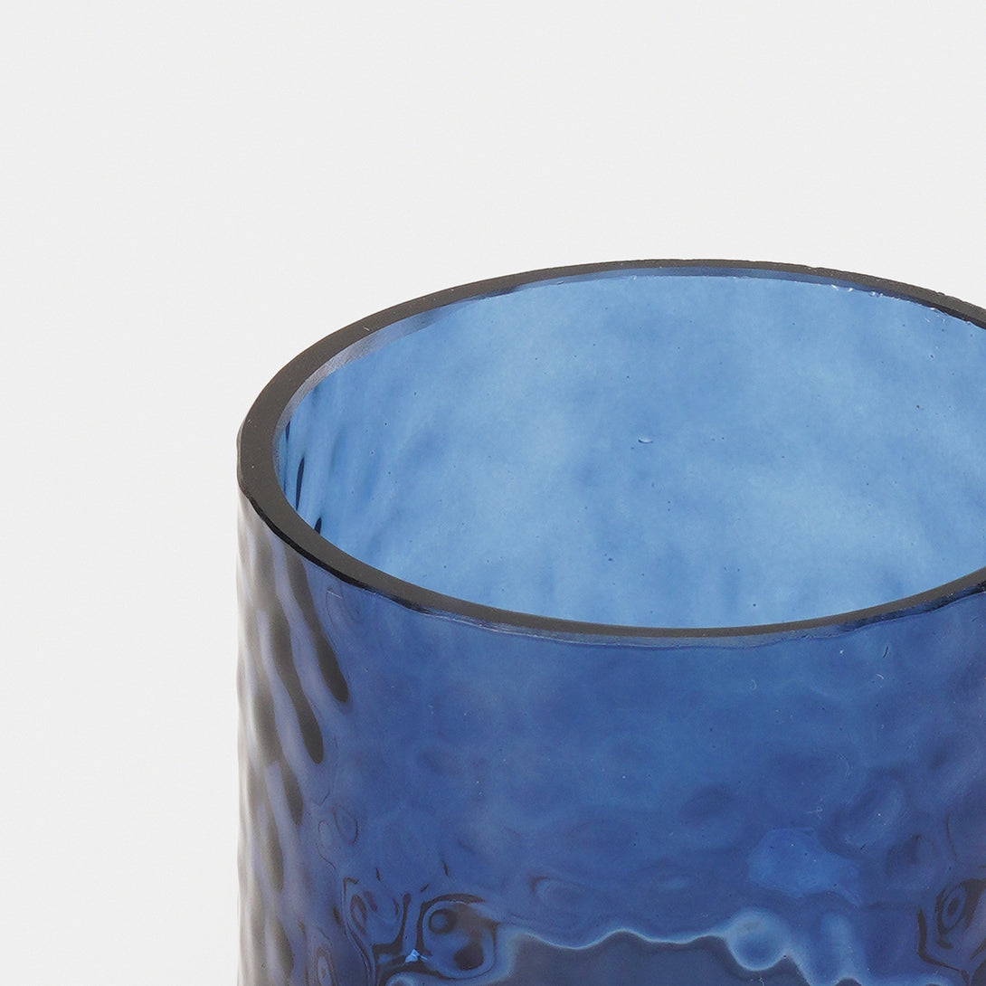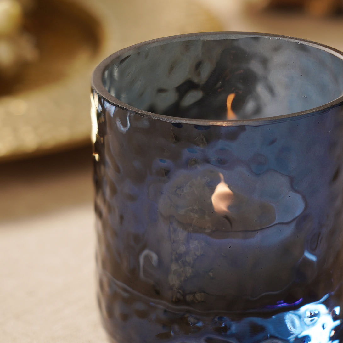 These blue textured glass candle holders feature a warm, hammered finish that diffuses light beautifully. Perfect for adding a cozy and elegant glow to any setting.