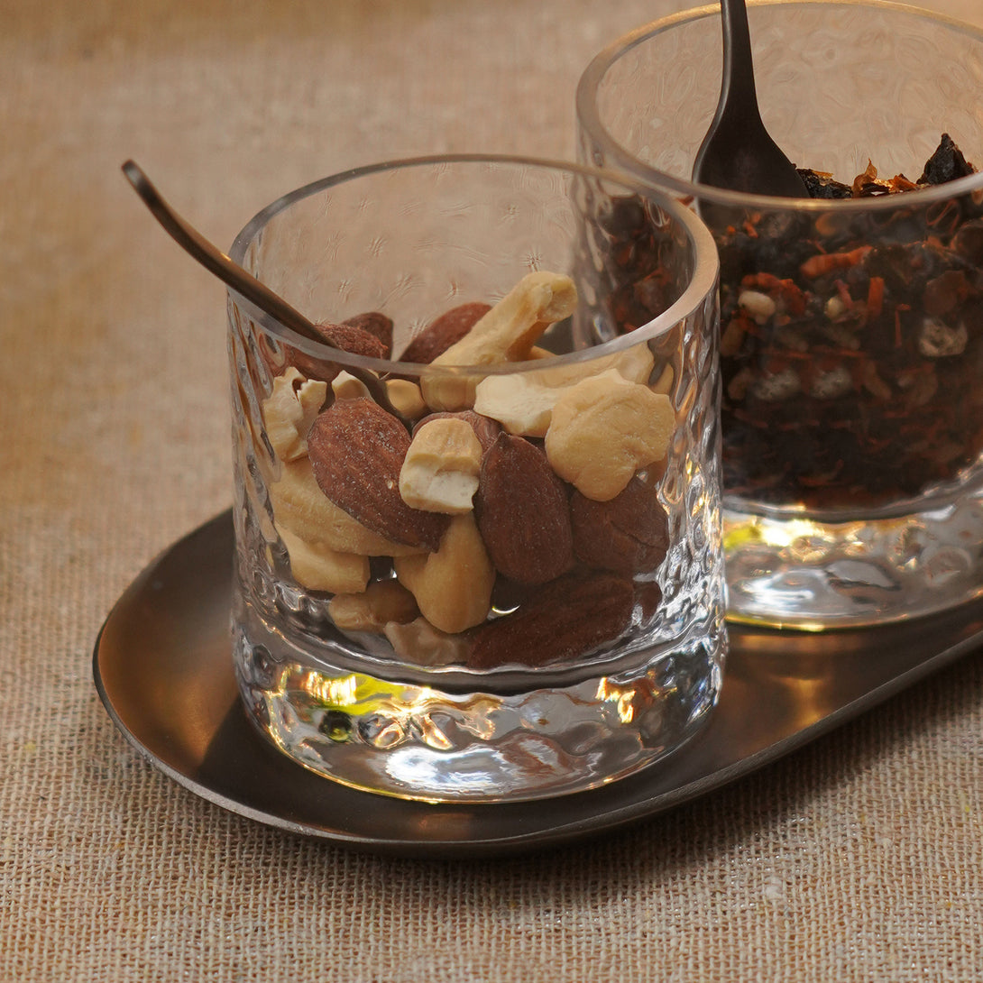 These hammered glass condiment jars with metal lids are perfect for serving sauces, spices, or condiments with a refined and modern touch.