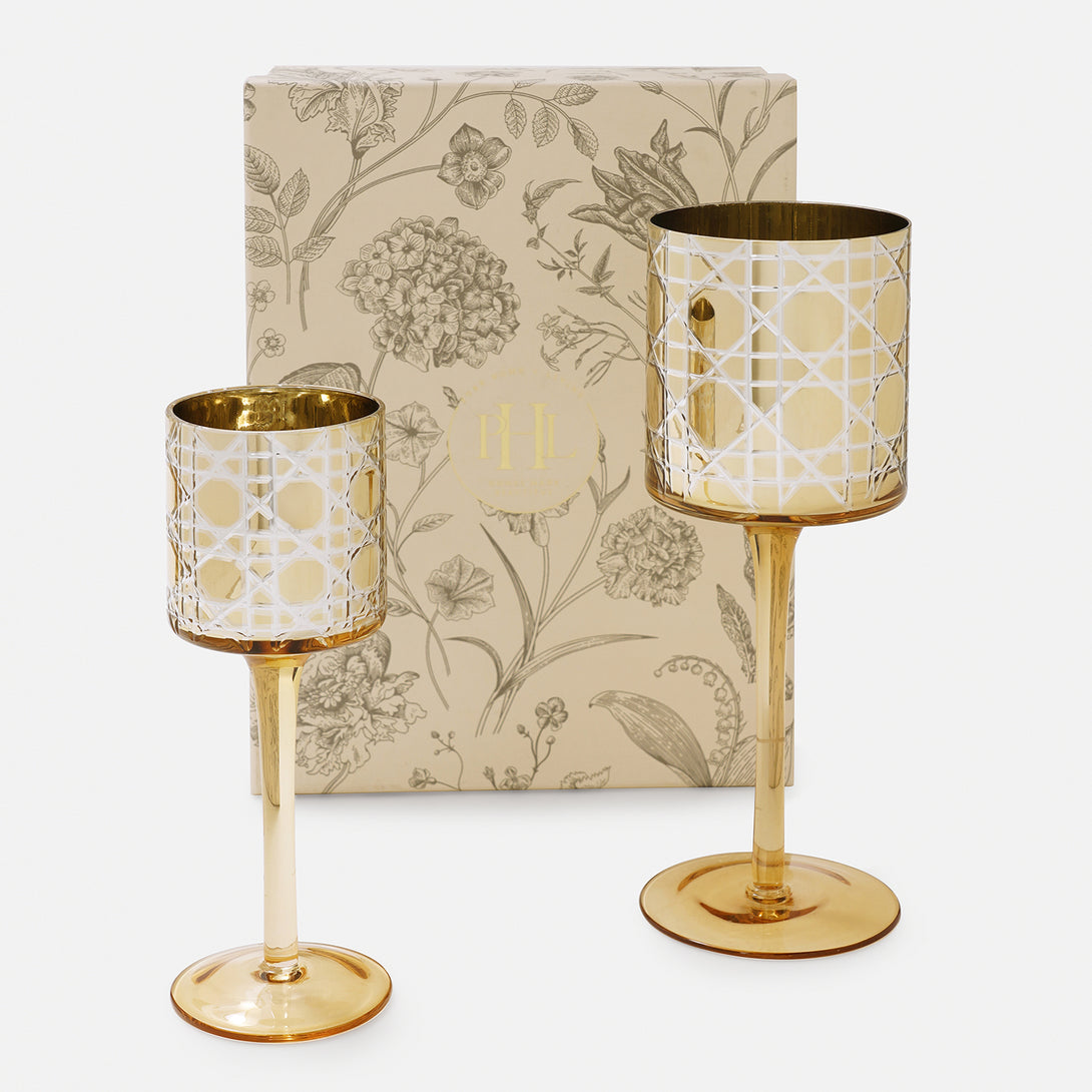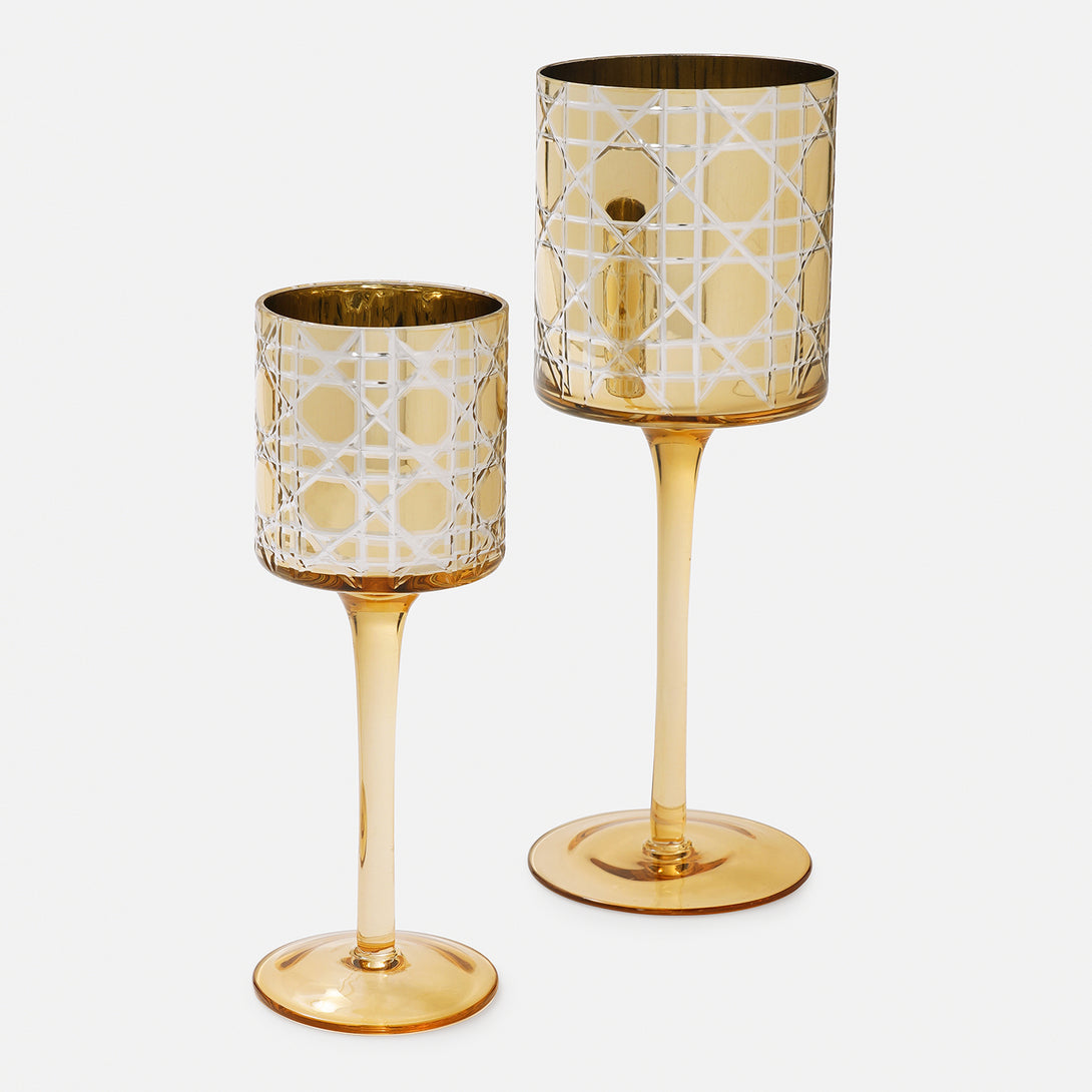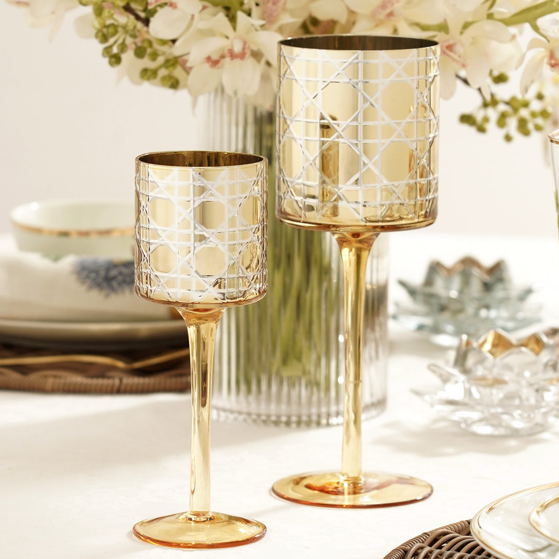These gold pattern glass stem candle holders are the epitome of elegance and sophistication. Their shimmering cut glass pattern dances on the sleek glass stem, enhancing the glow of a flickering candle.