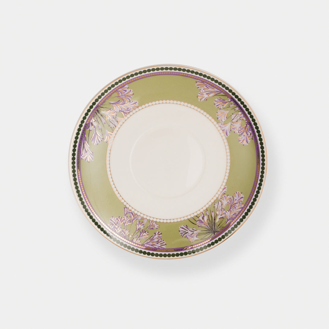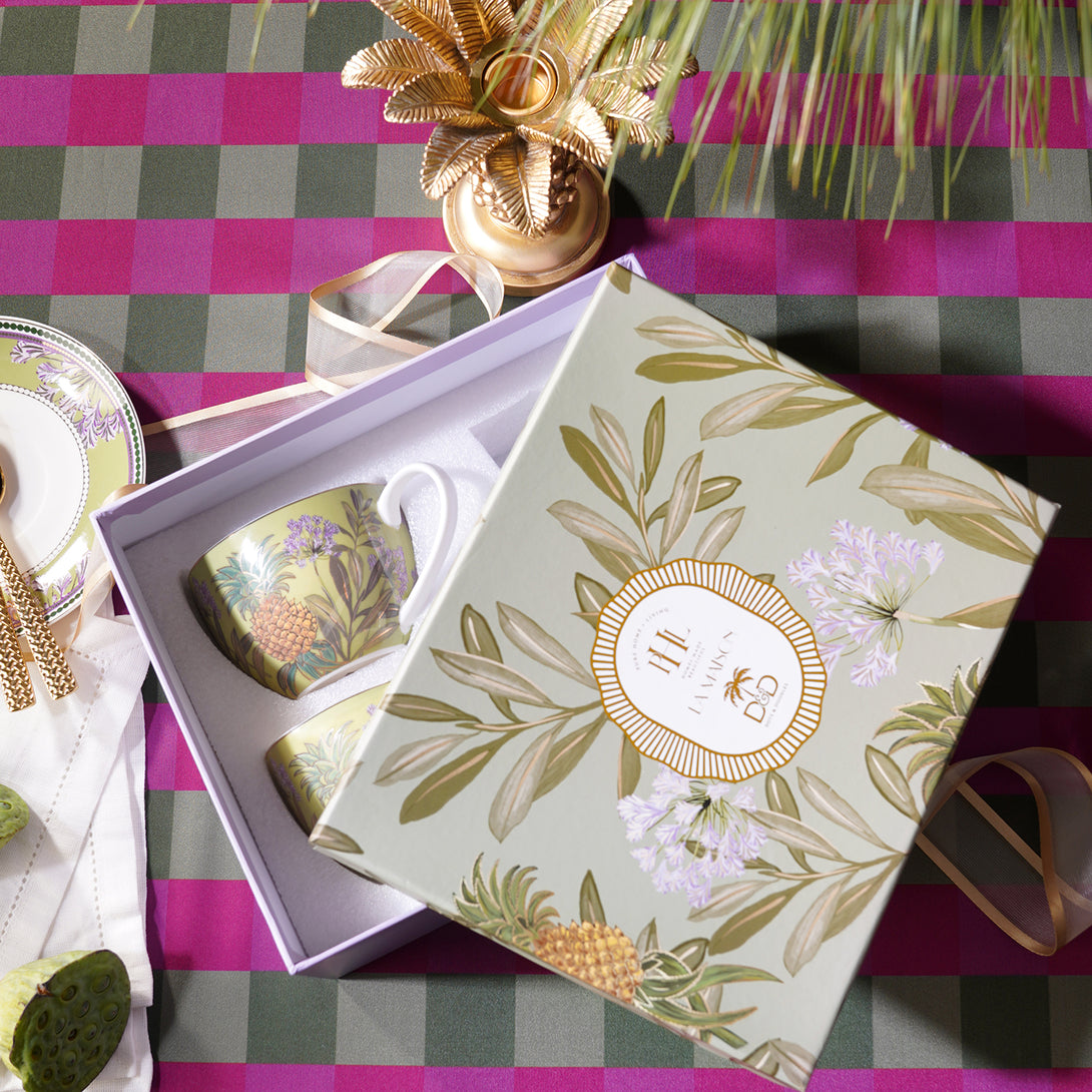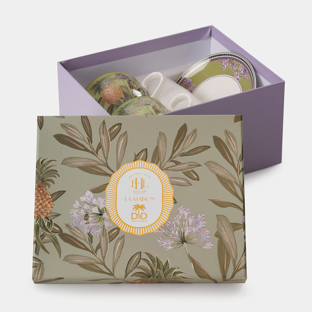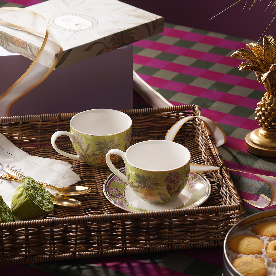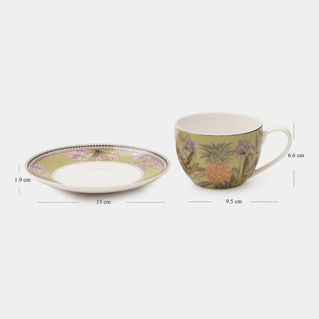 These green pineapple tea cups and saucers feature vibrant botanical designs with golden detailing. A stylish and refreshing addition to your tea-time collection.
