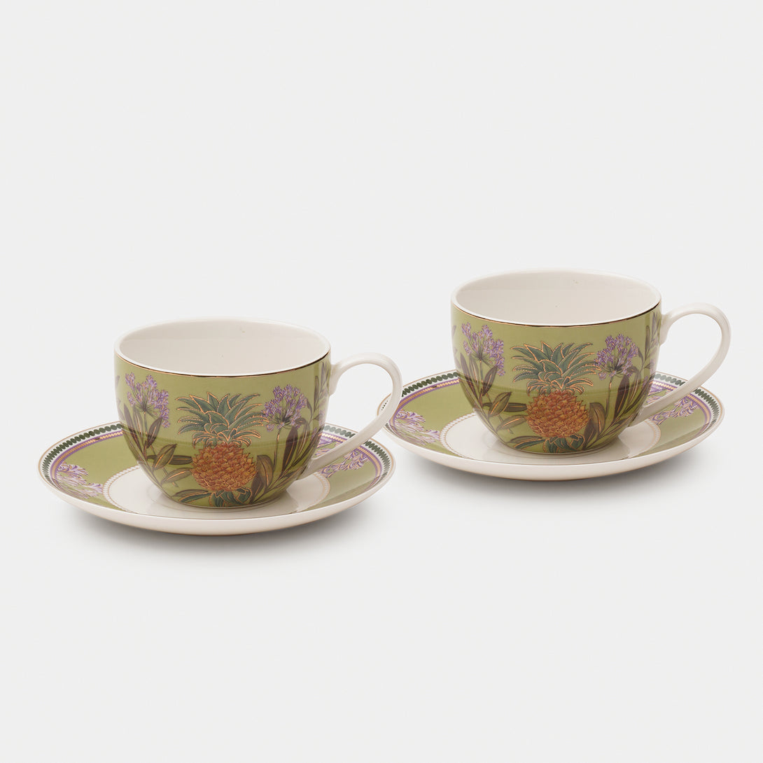 Set of 2 Green Pineapple Print Tea Cups & Saucers