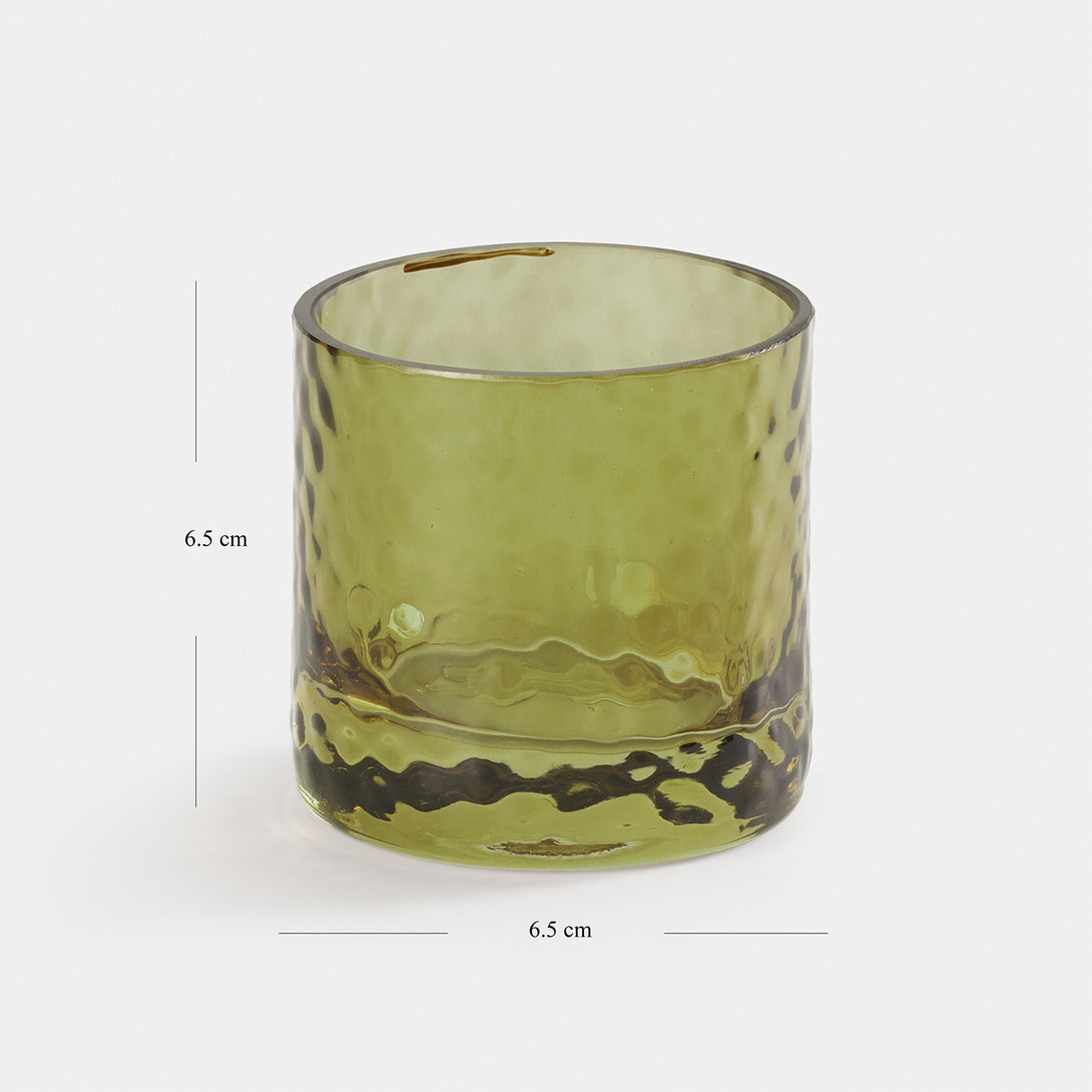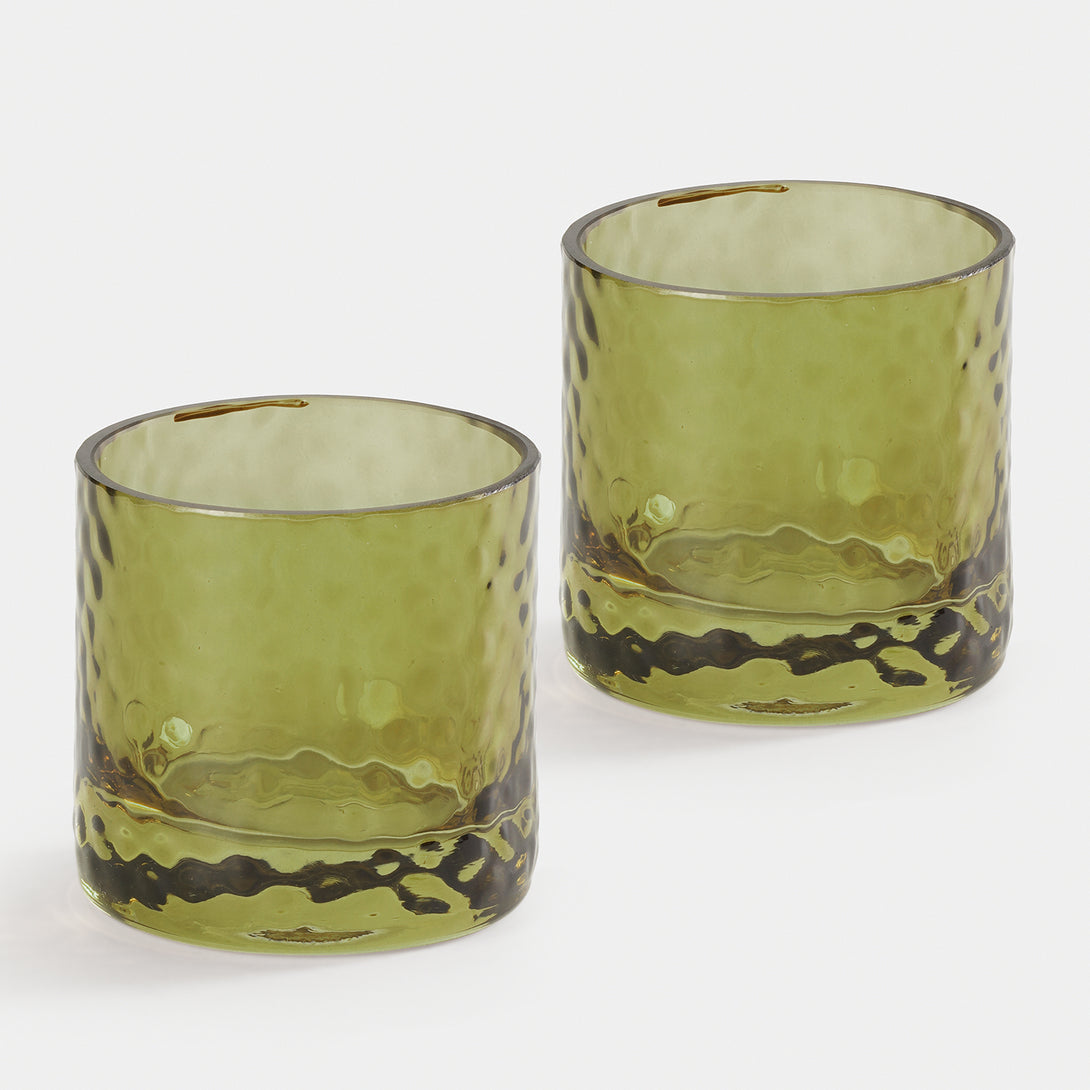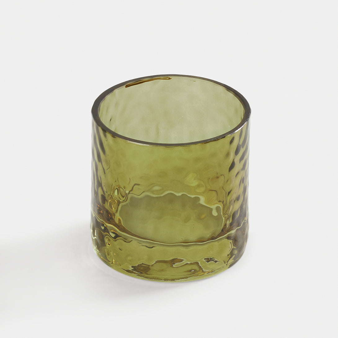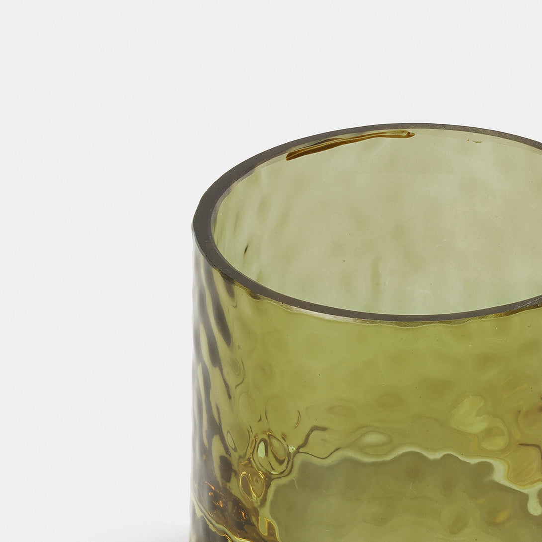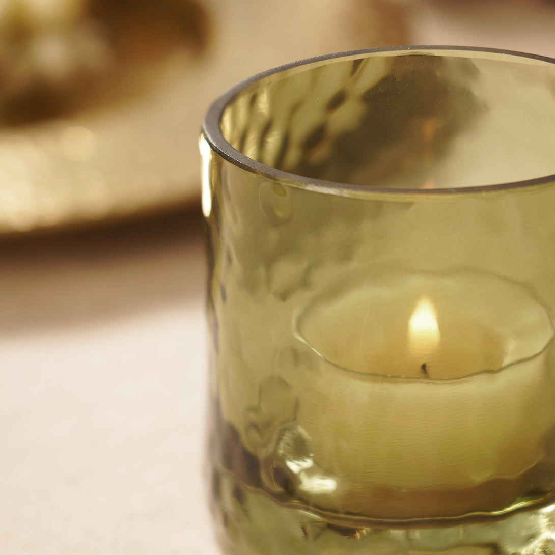 These green textured glass candle holders feature a warm, hammered finish that diffuses light beautifully. Perfect for adding a cozy and elegant glow to any setting.