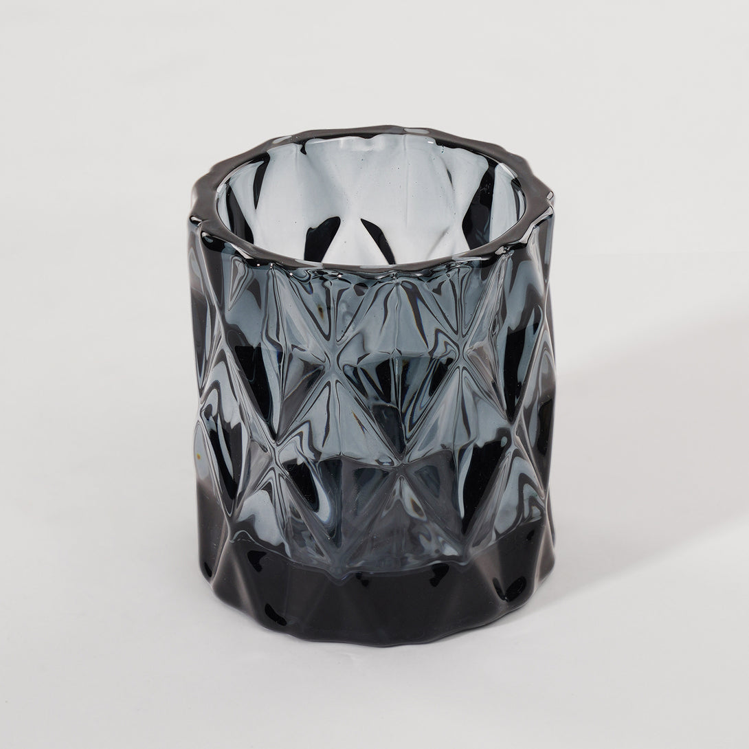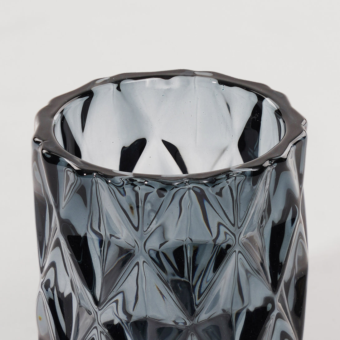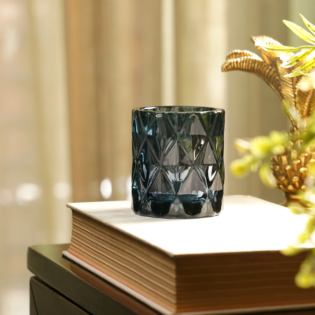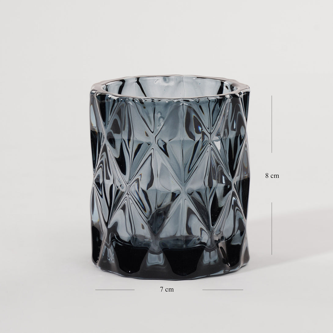 Crafted in a grey tone, this glass tealight showcases a striking diamond texture that reflects light with brilliance. Its solid form and intricate faceting add a luxe, vintage charm to any drinkware collection.