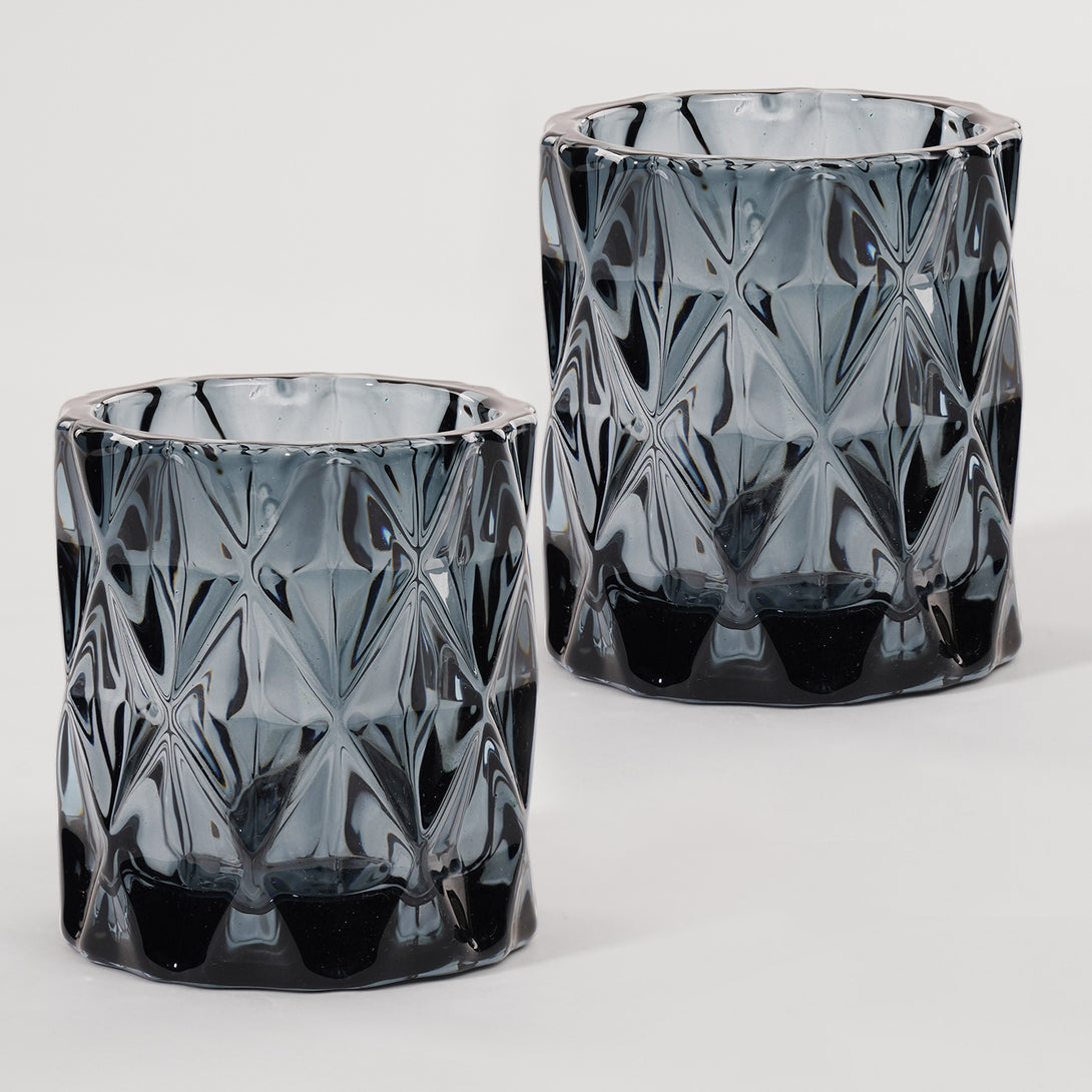 Set of 2 Grey Diamond Cut Glass Tealight Holder