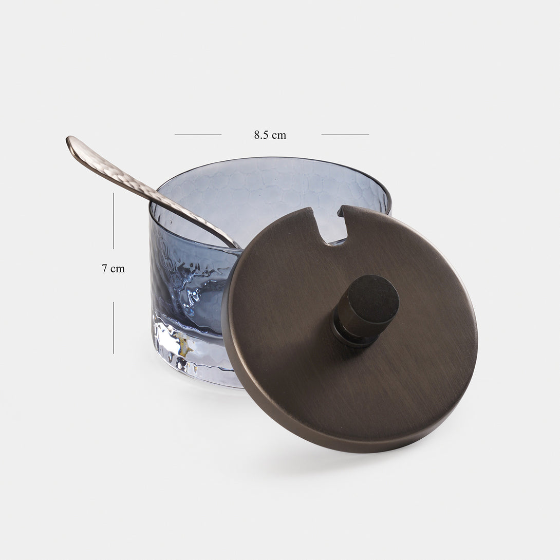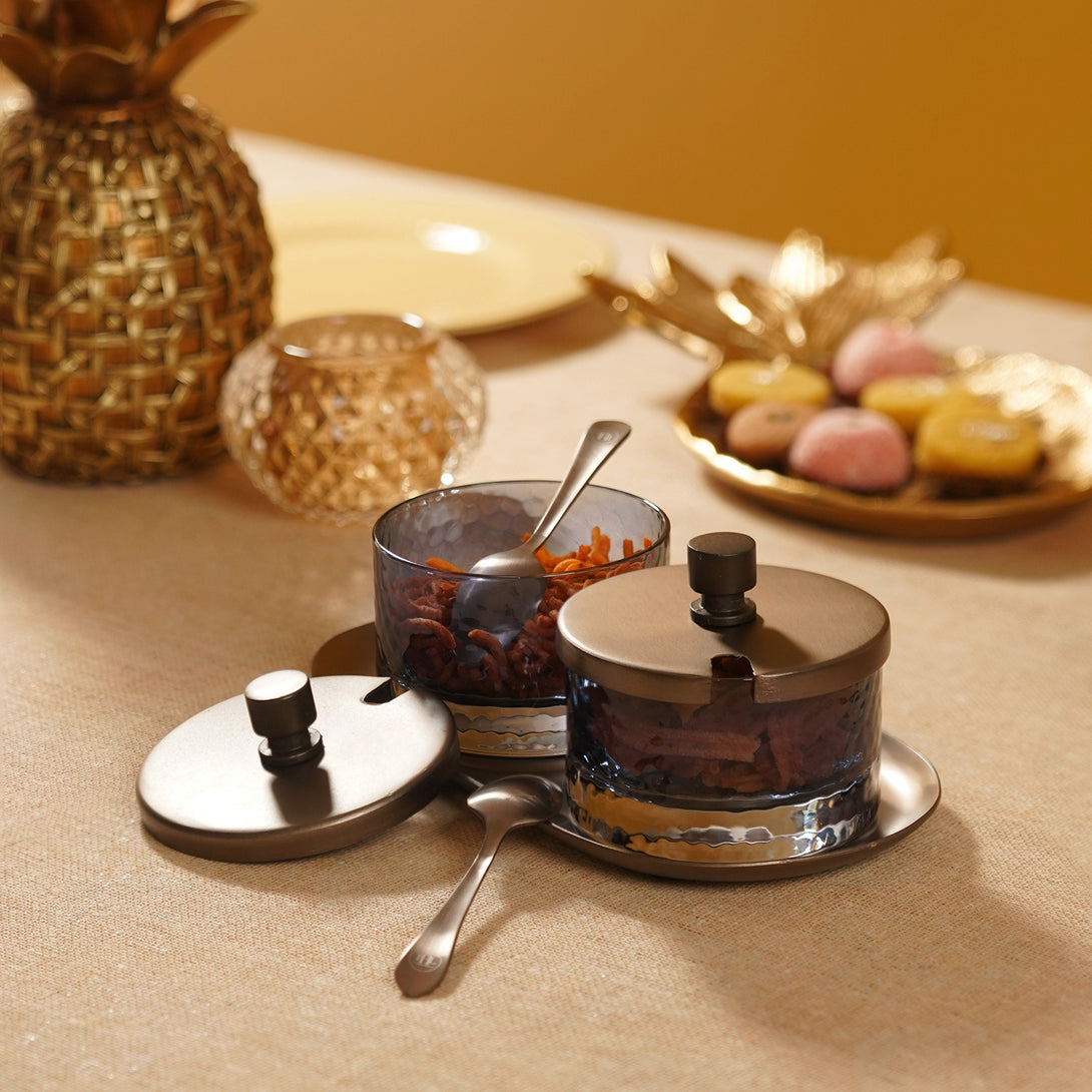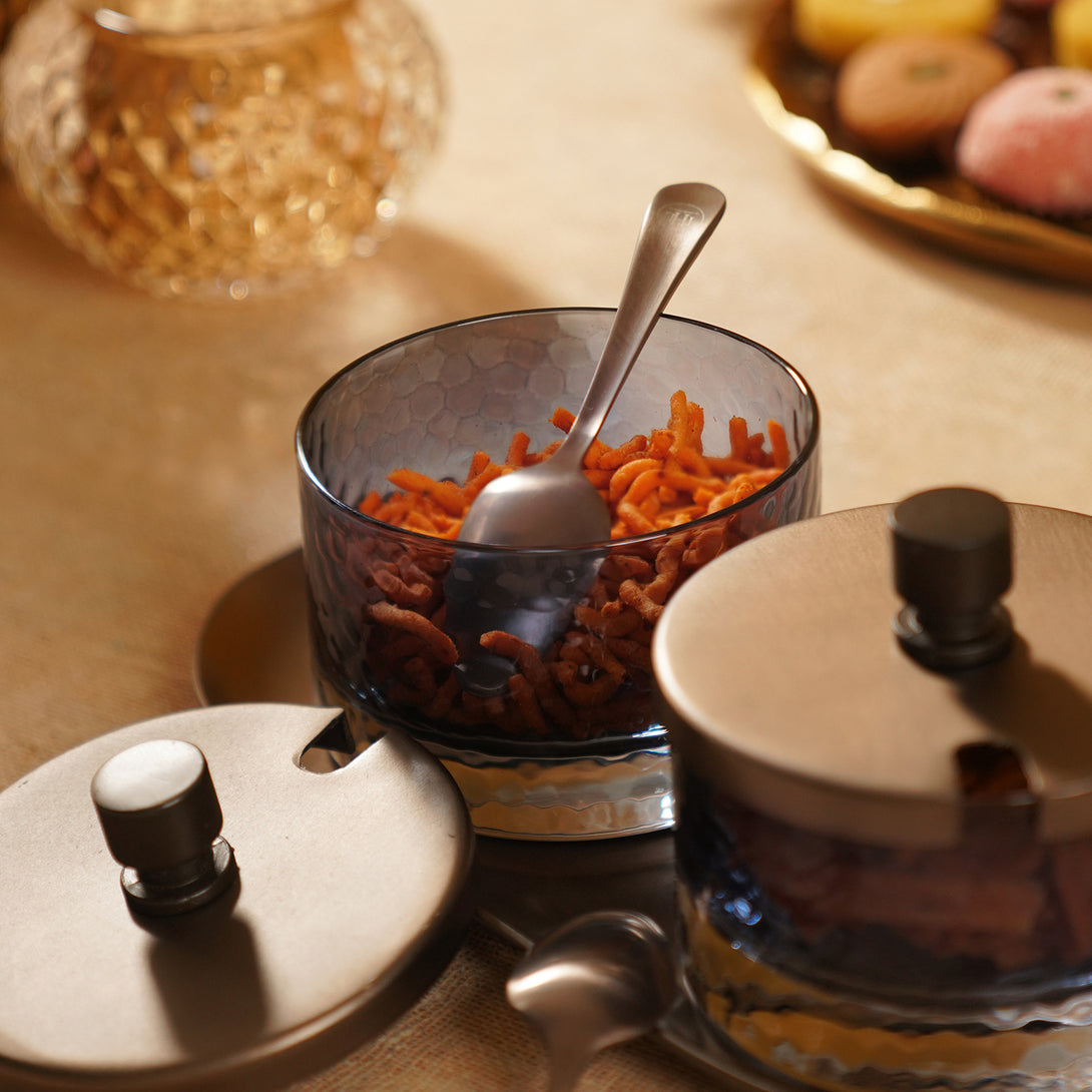 These hammered glass condiment jars with metal lids and spoons are perfect for serving sauces, spices, or condiments with a refined and modern touch.