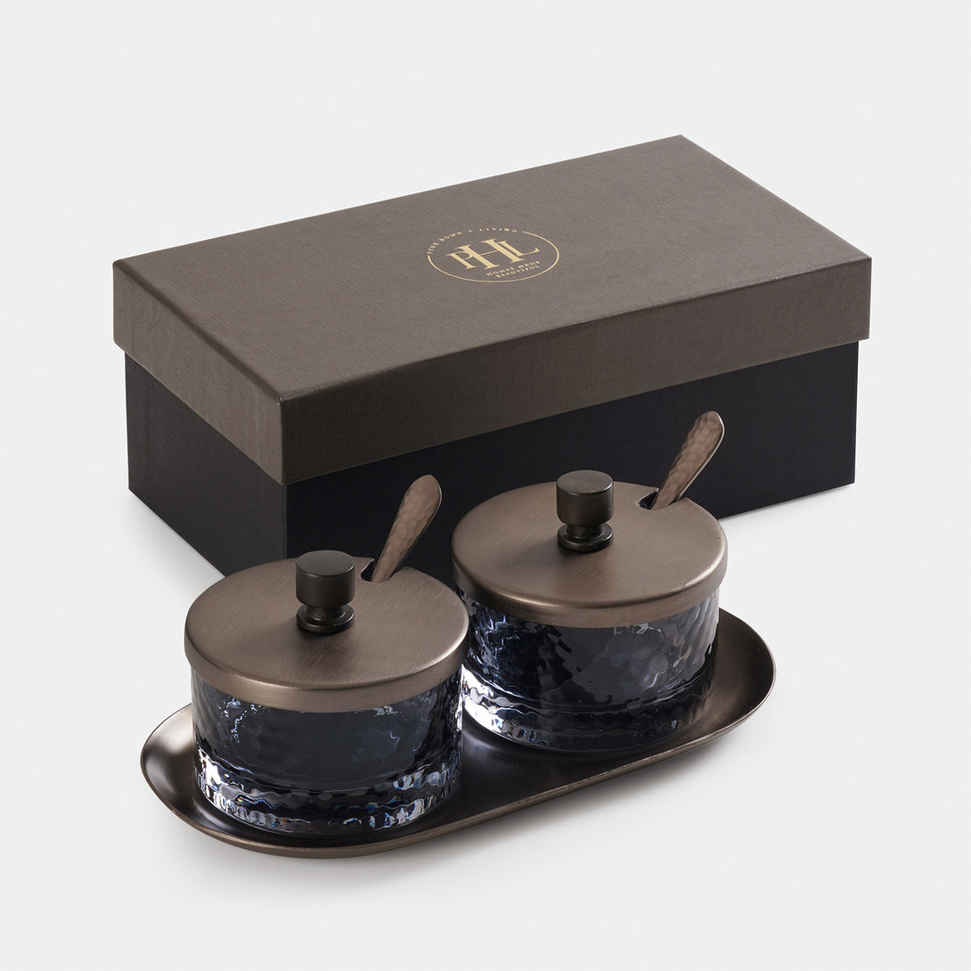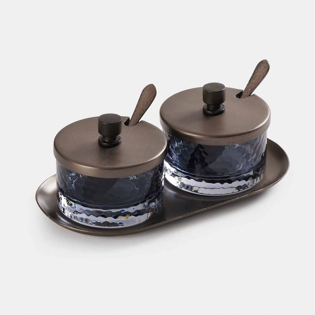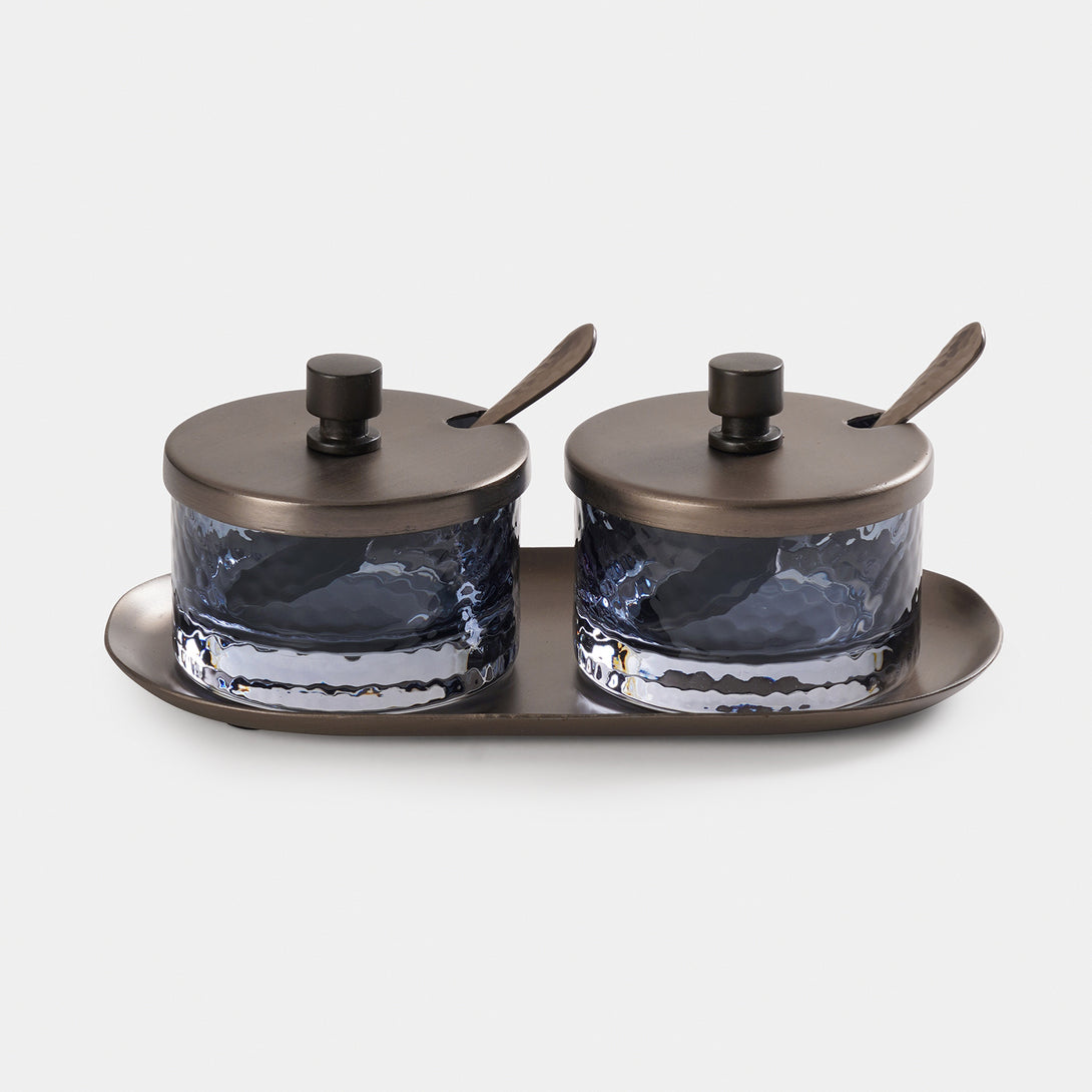 Set of 2 Grey Hammered Condiment Jars with Spoons & Tray - Medium