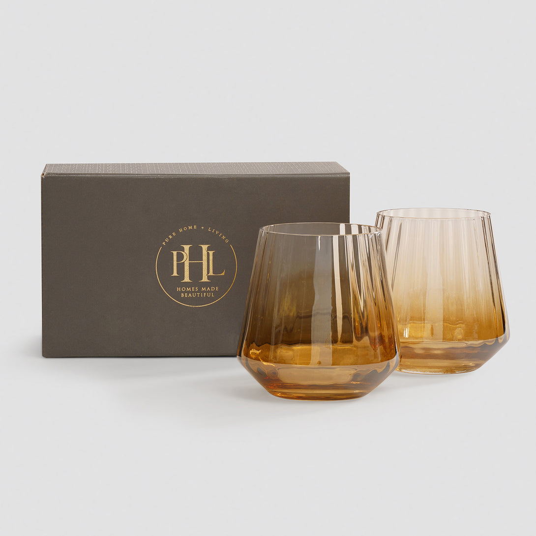 Set of 2 Light Amber Ombre Ribbed Drinking Glasses