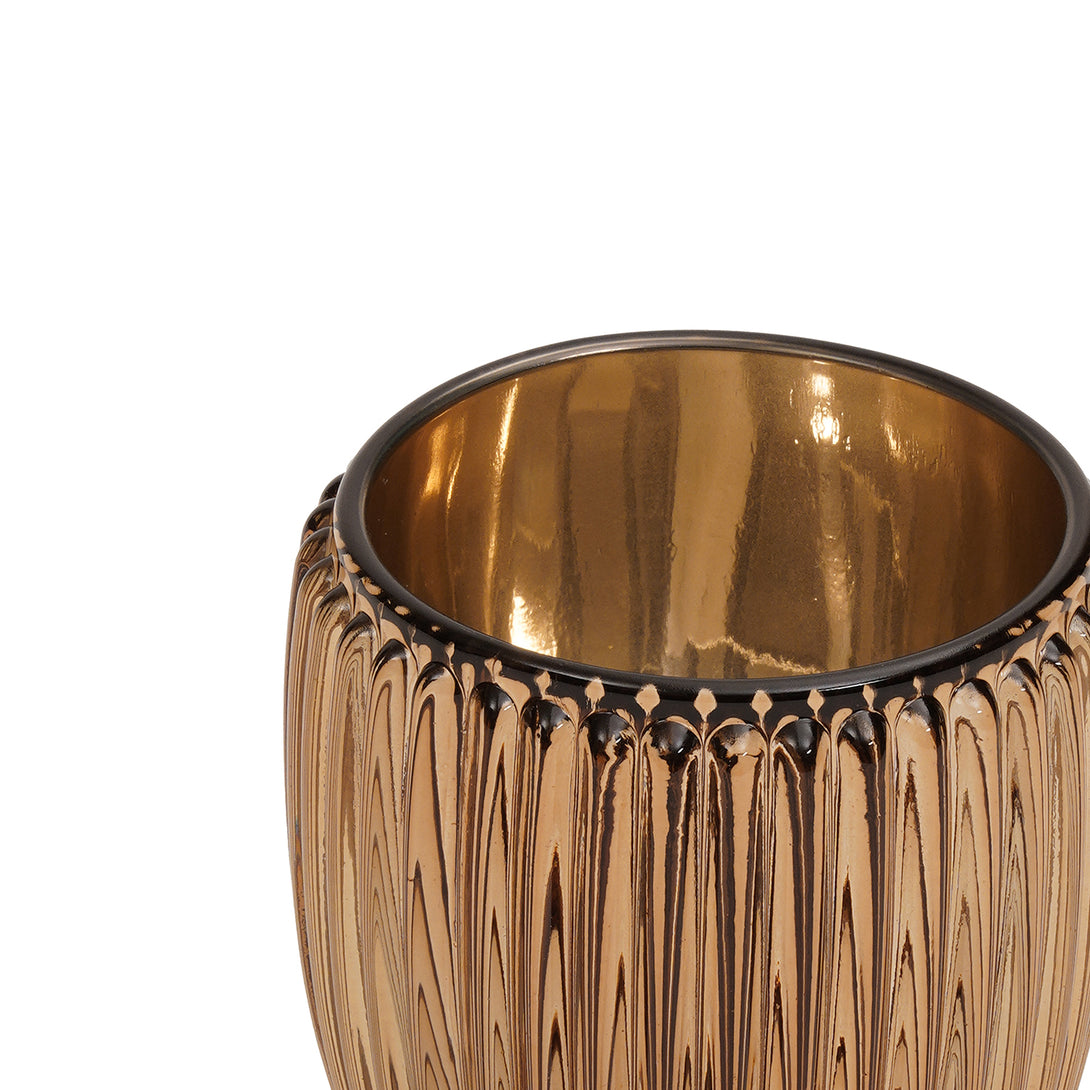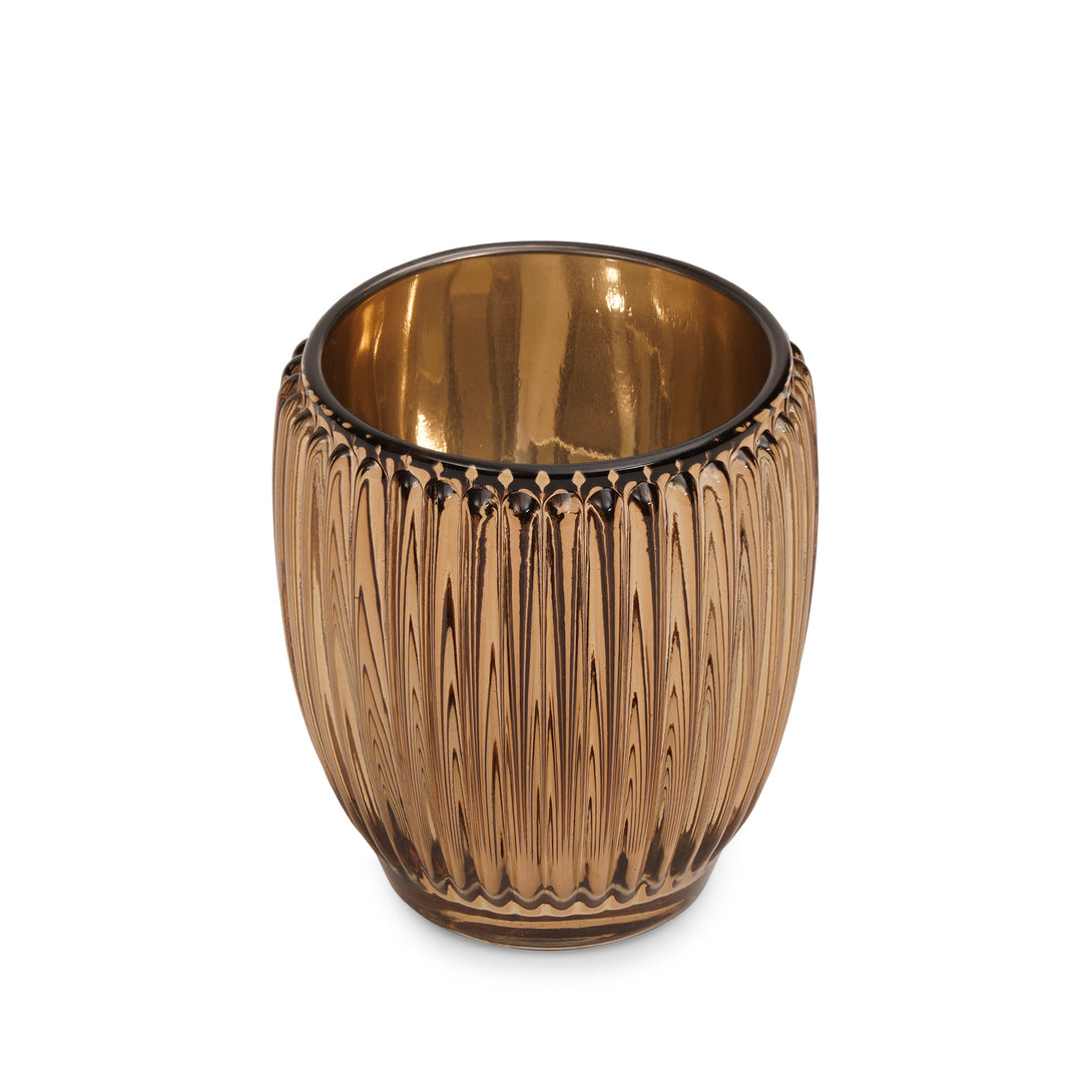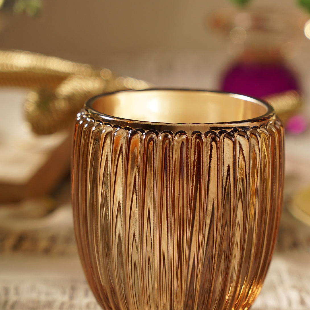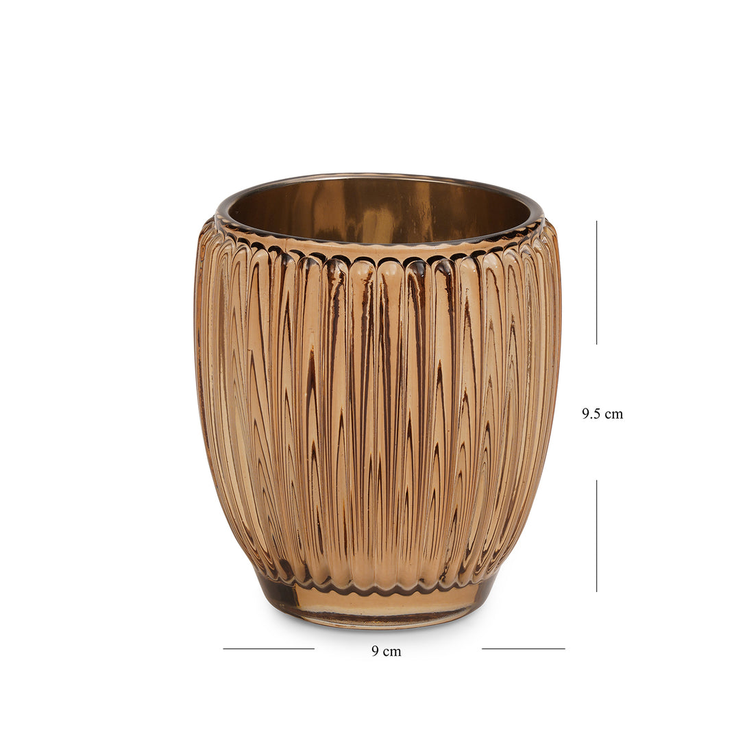 Decorate your beautiful home with these sophisticated and enchanting light amber glass tealight holders. When illuminated, the ribbed pattern creates a stunning play of light and shadow, casting a warm, inviting glow.