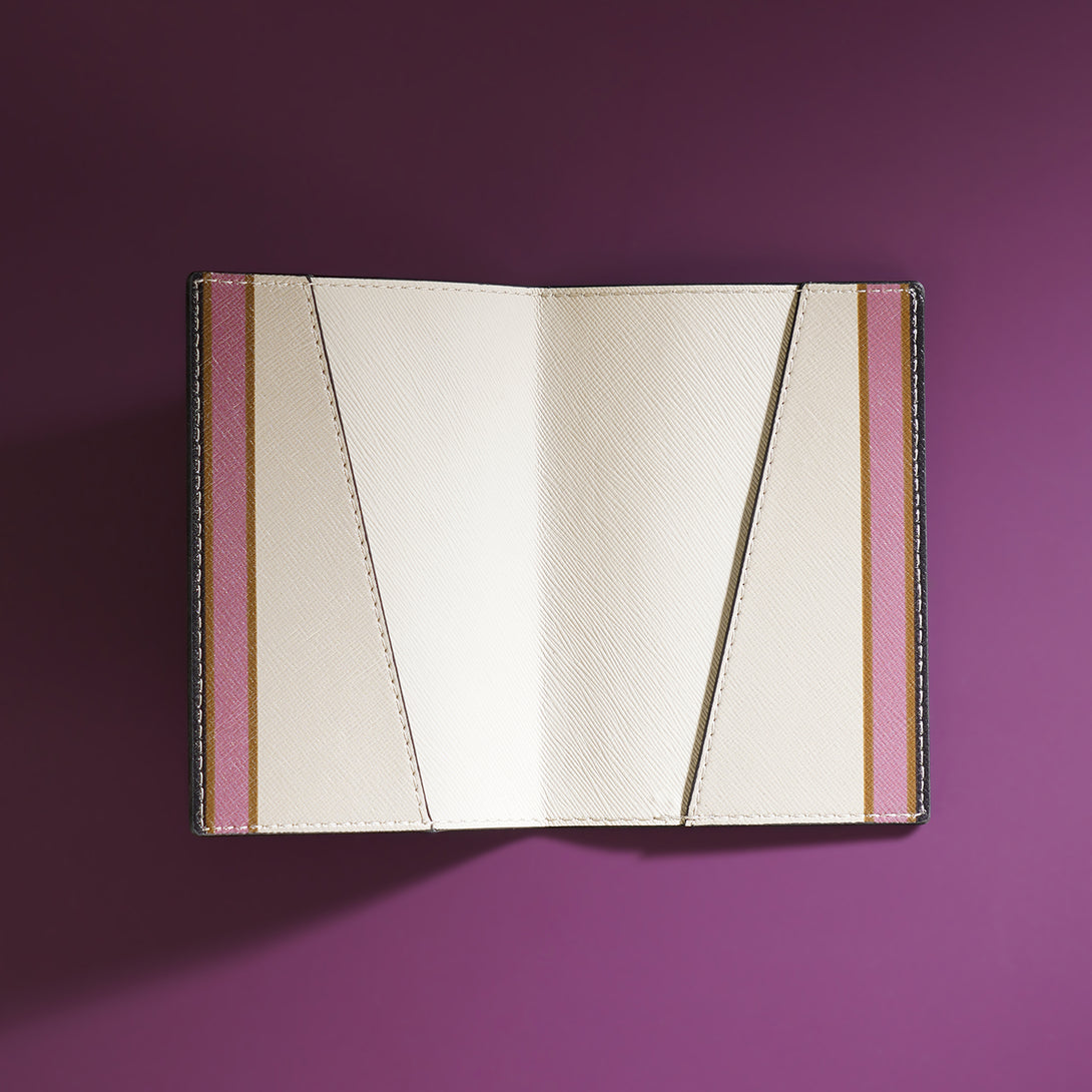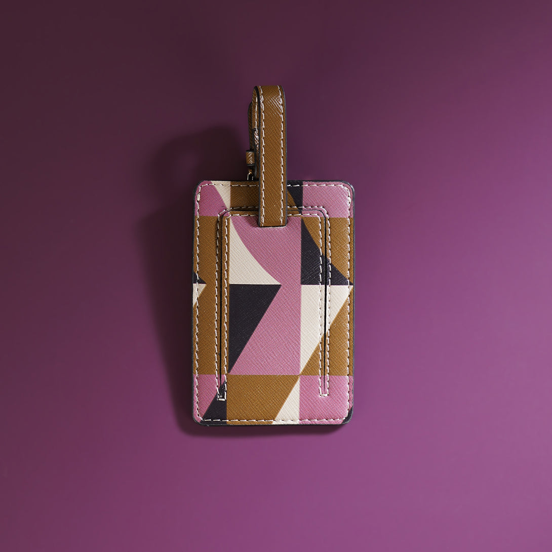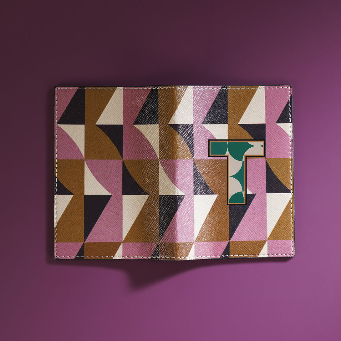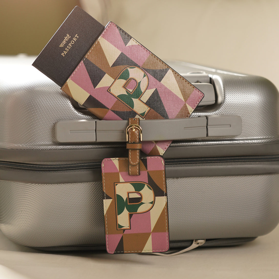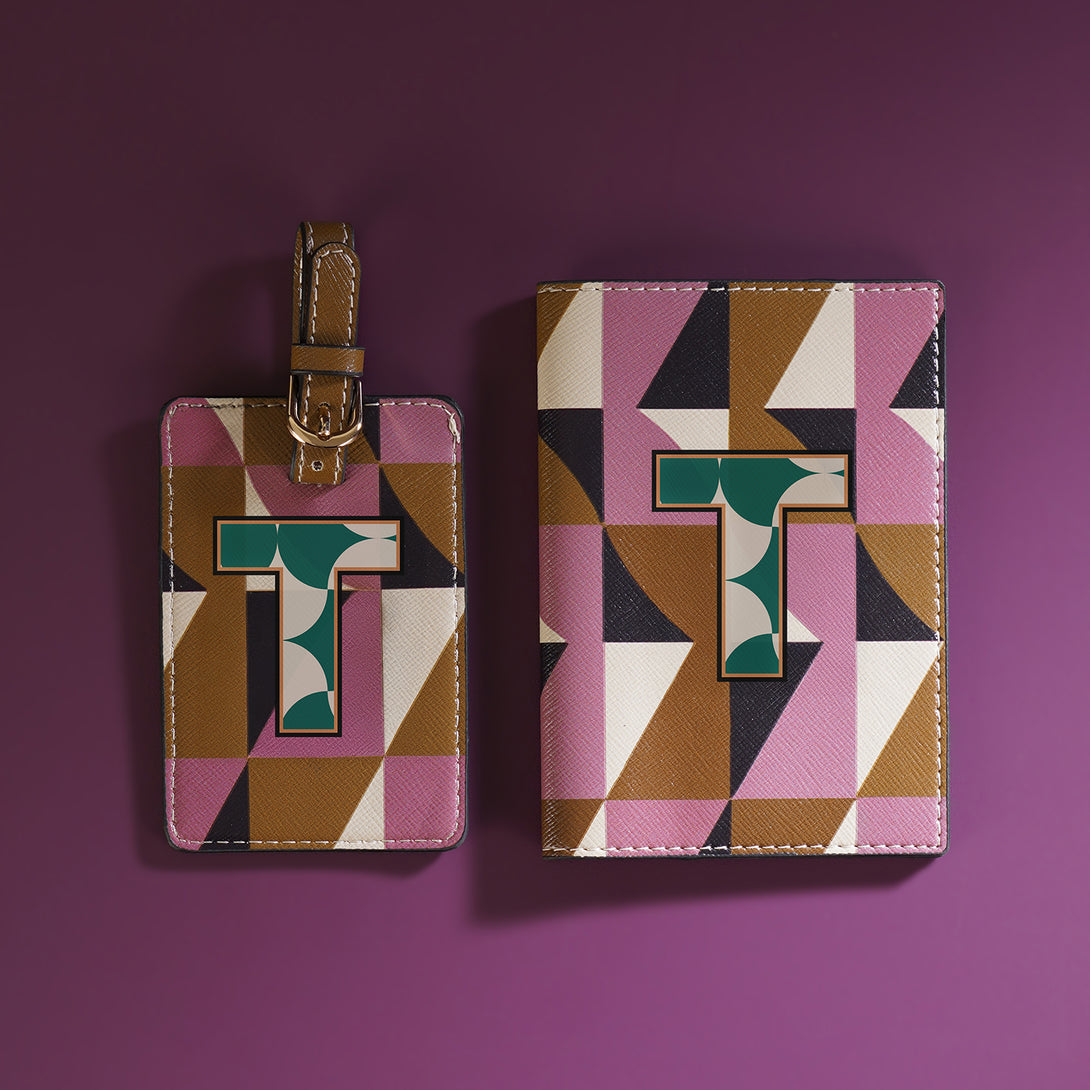 Meet your ultimate travel companion: a passport holder and luggage tag that blends bold style with personal flair. The subtle pink and green geometric backdrop, paired with a standout 'T', makes it not just a travel essential but a statement of identity and adventure.