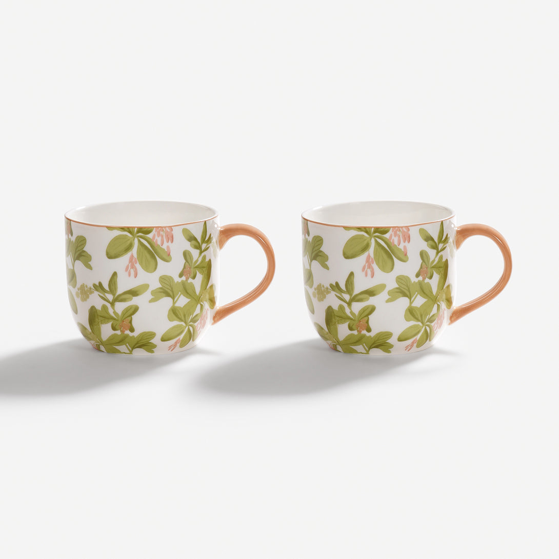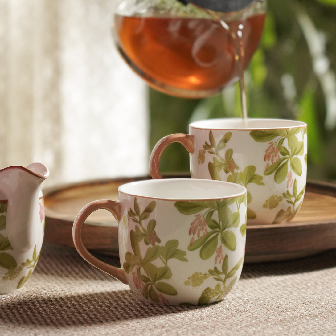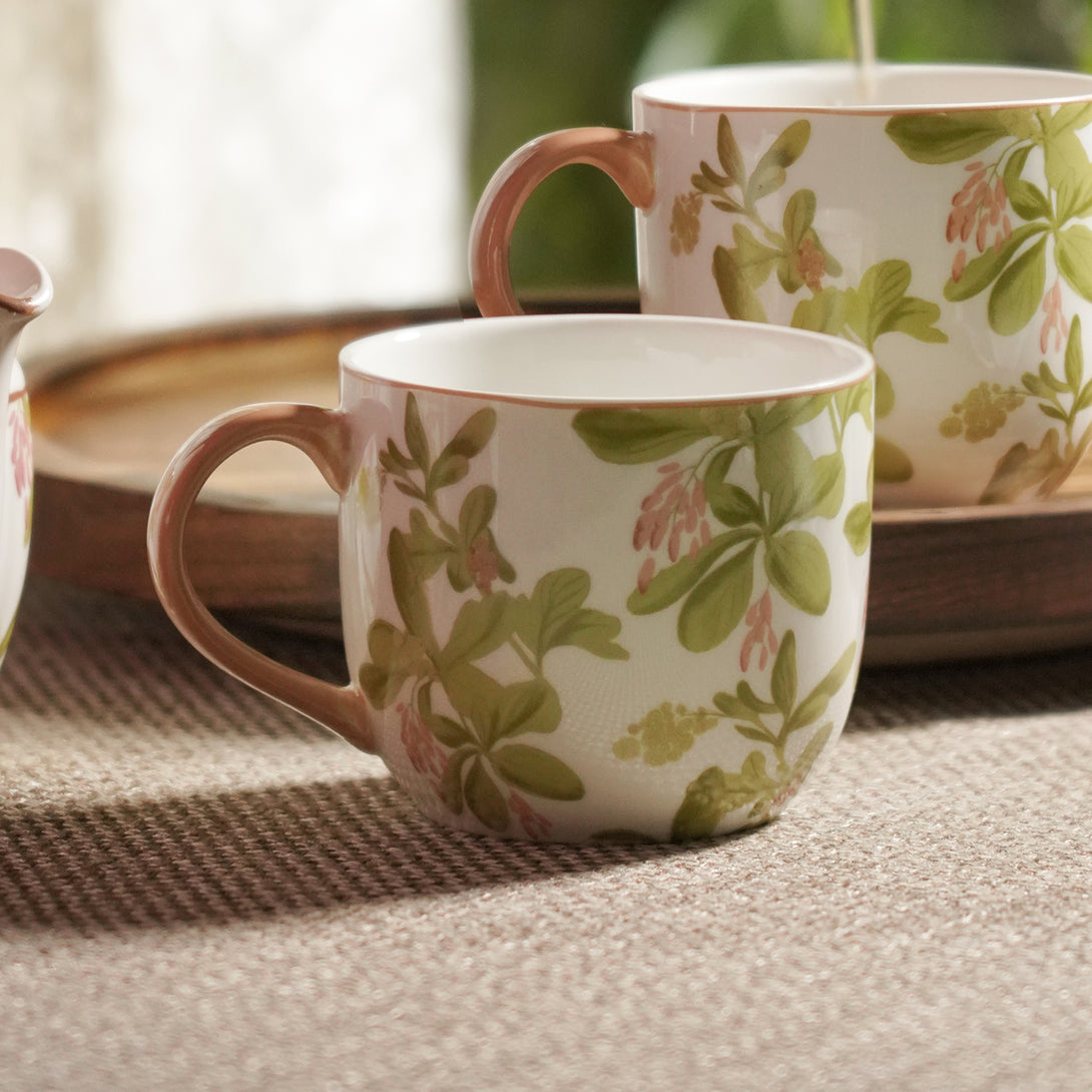 Celebrate the charm of nature with these blooming ceramic mugs, adorned in green foliage and delicate pink buds.