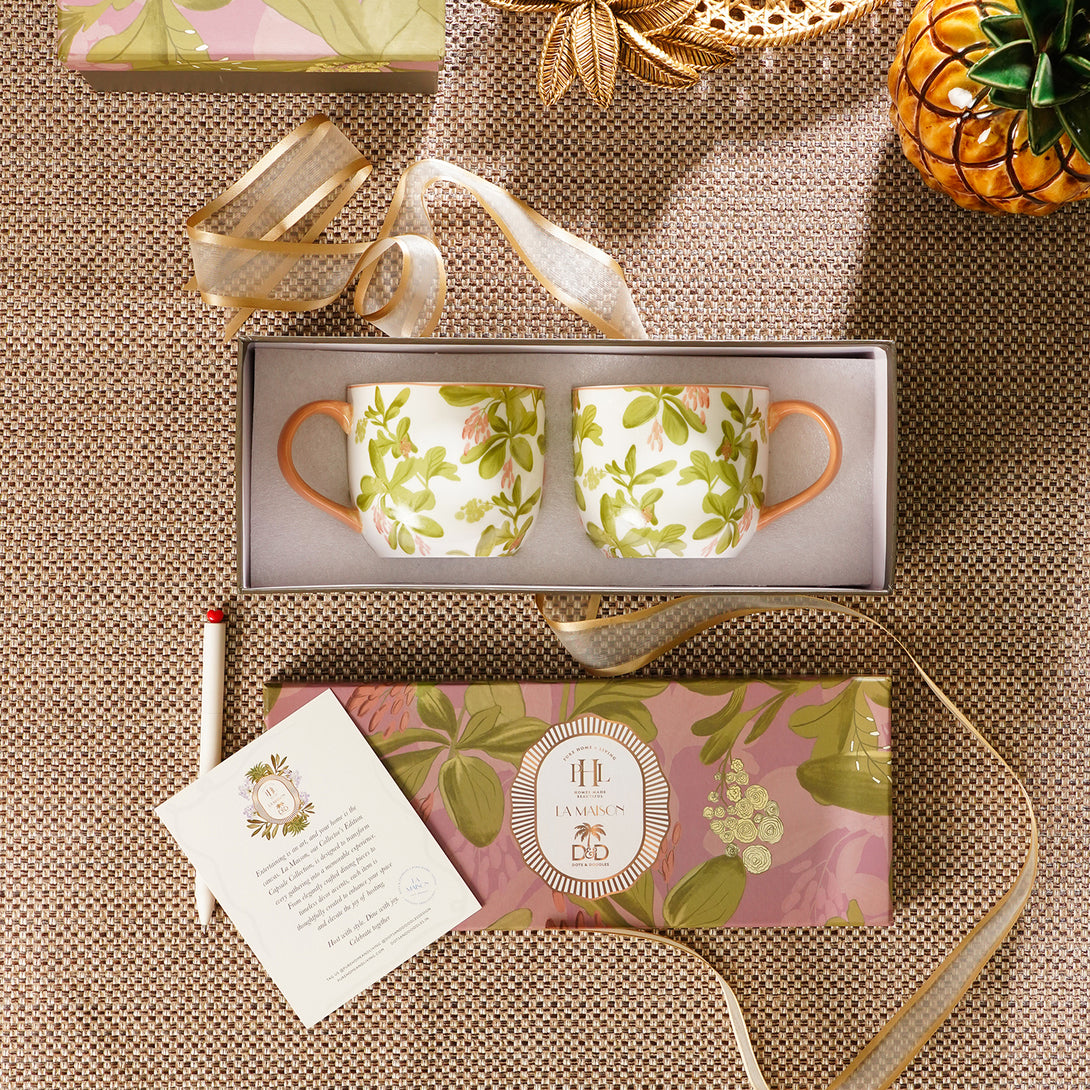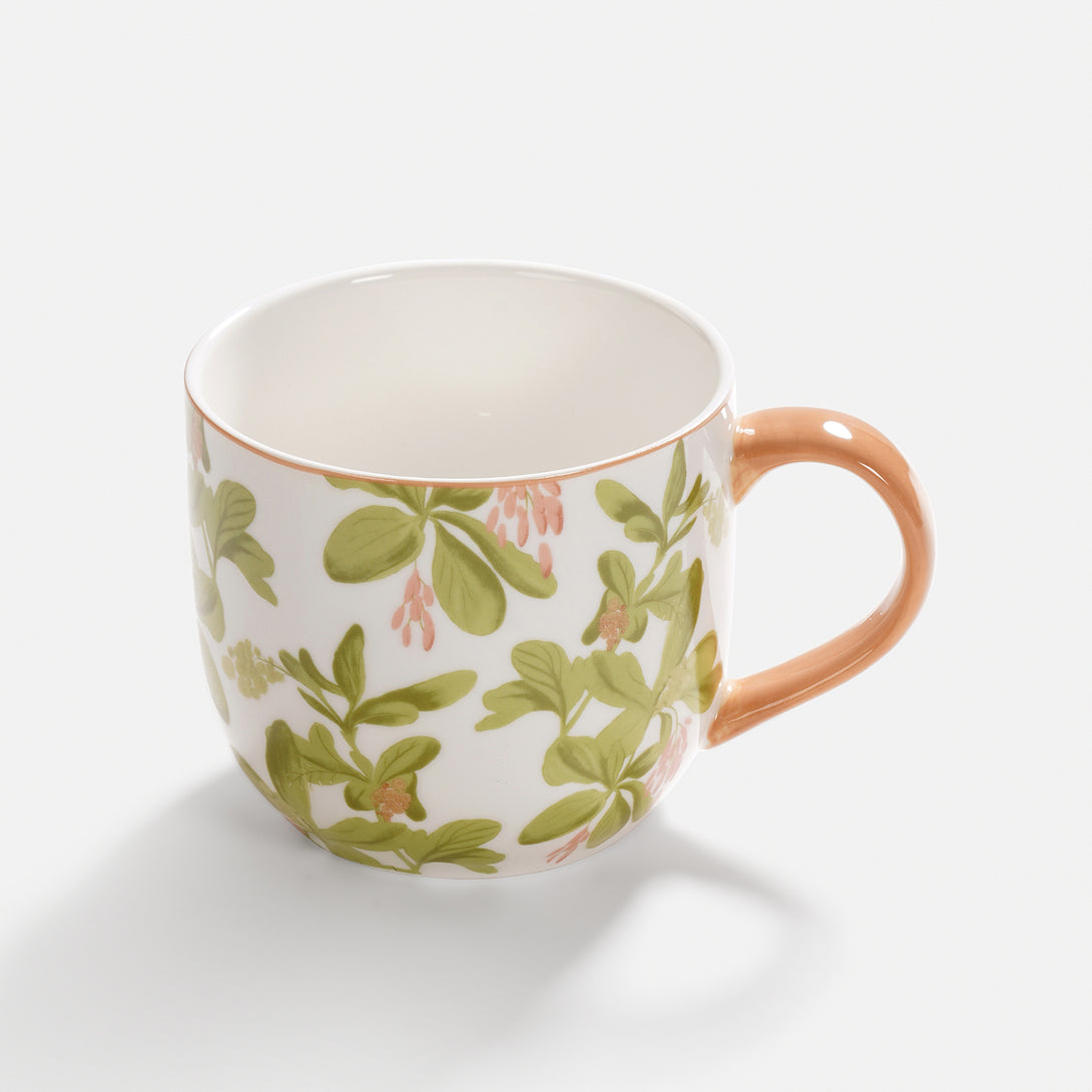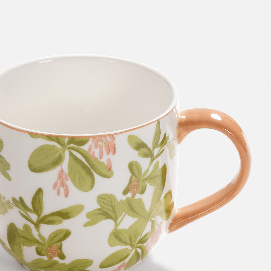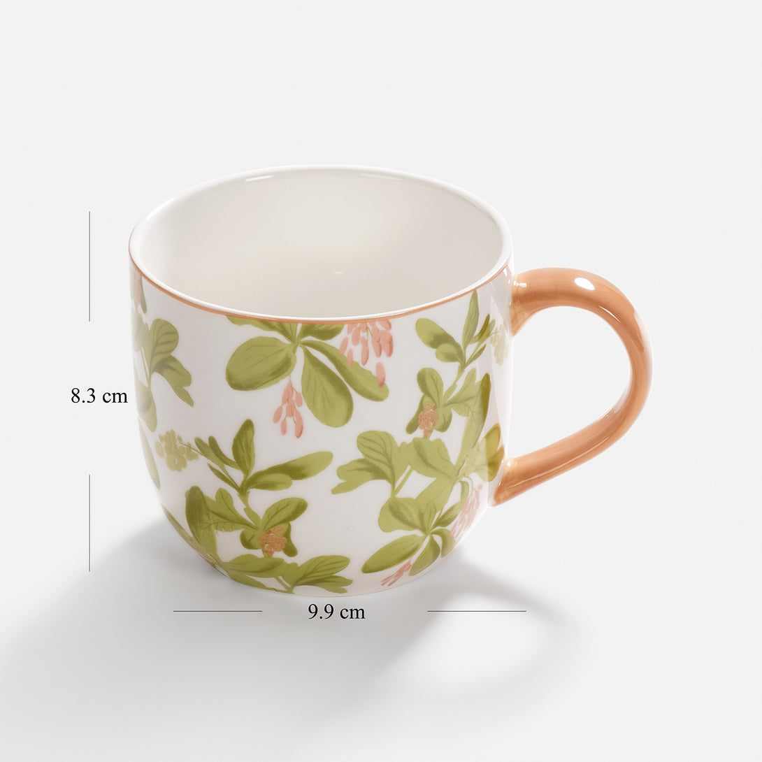 Celebrate the charm of nature with these blooming ceramic mugs, adorned in green foliage and delicate pink buds.