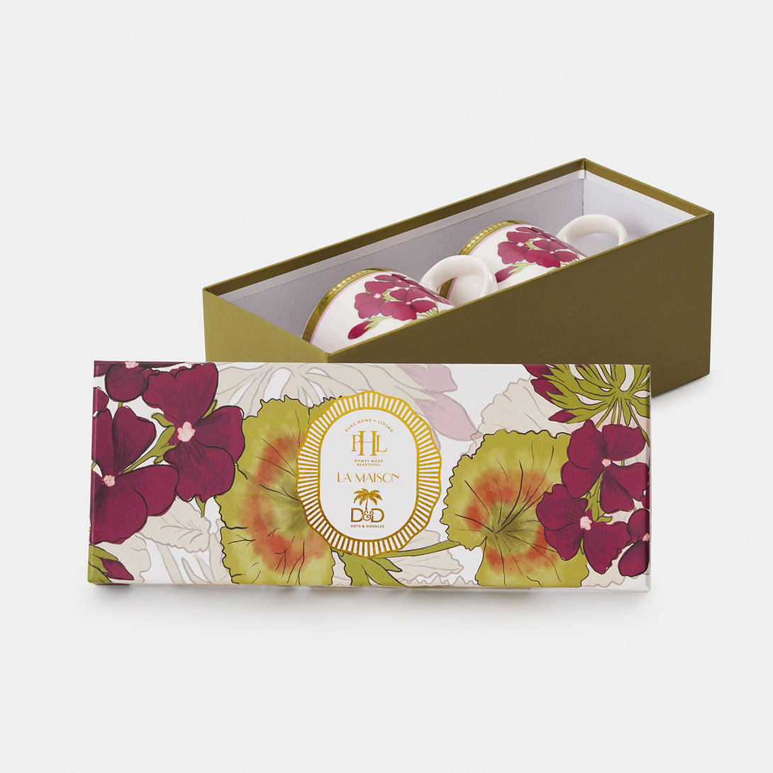 These red and green rosabay print coffee mugs feature bold floral patterns and golden accents, perfect for enjoying your favourite hot beverages in style and elegance.