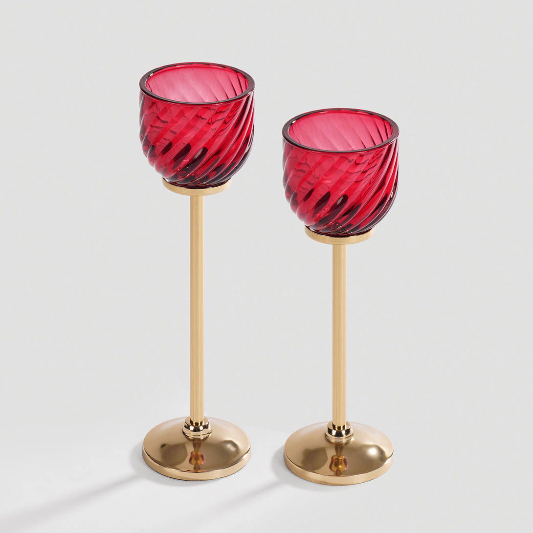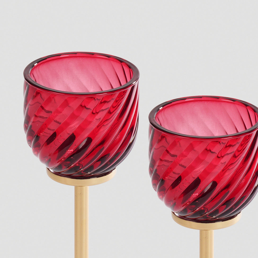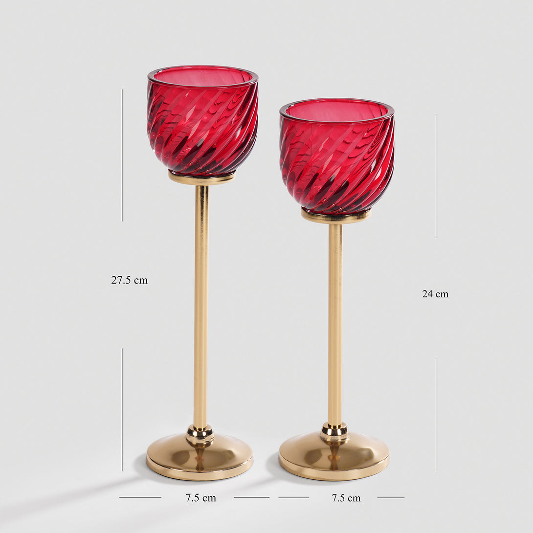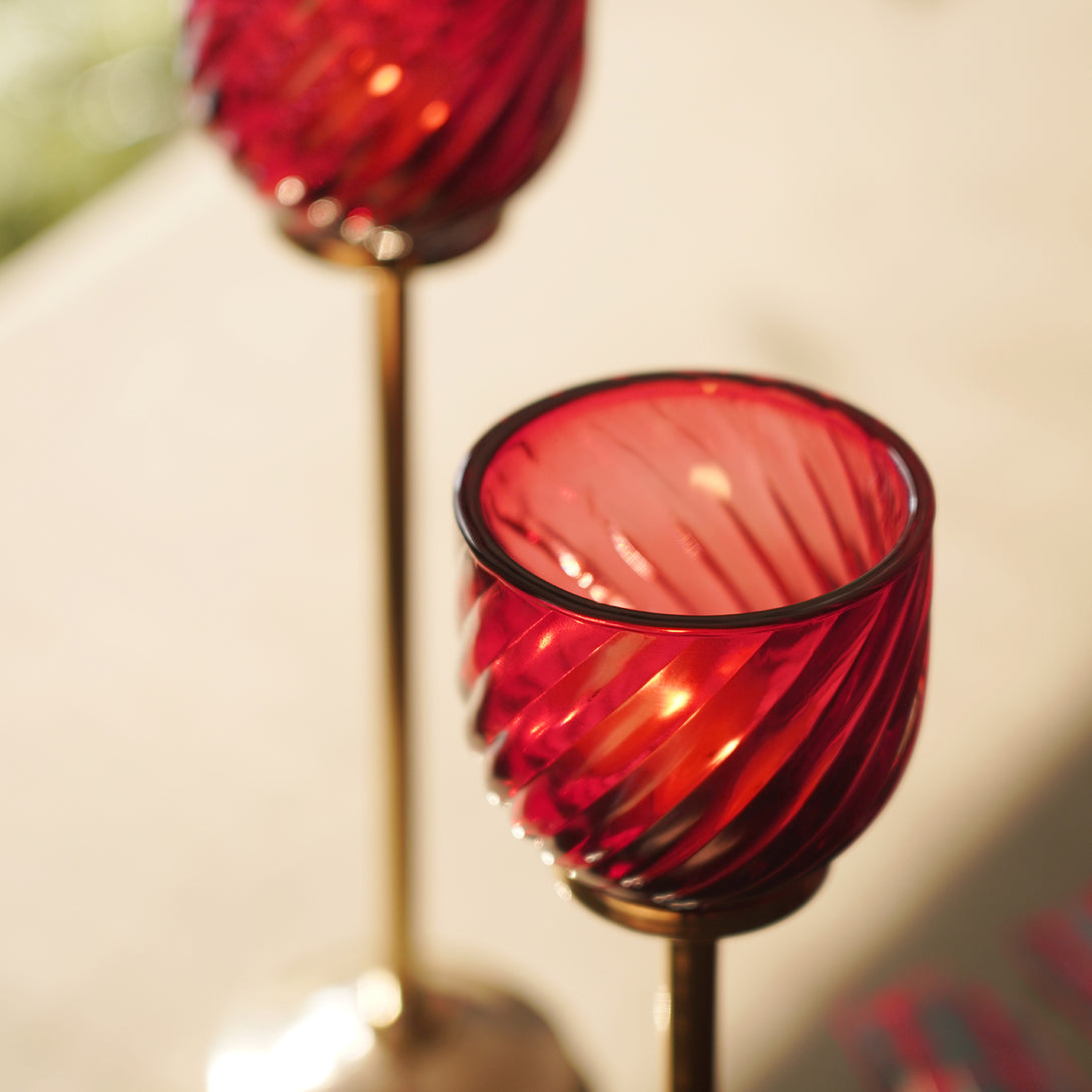 Set Of 2 Red Textured Glass Stem Candle Holders