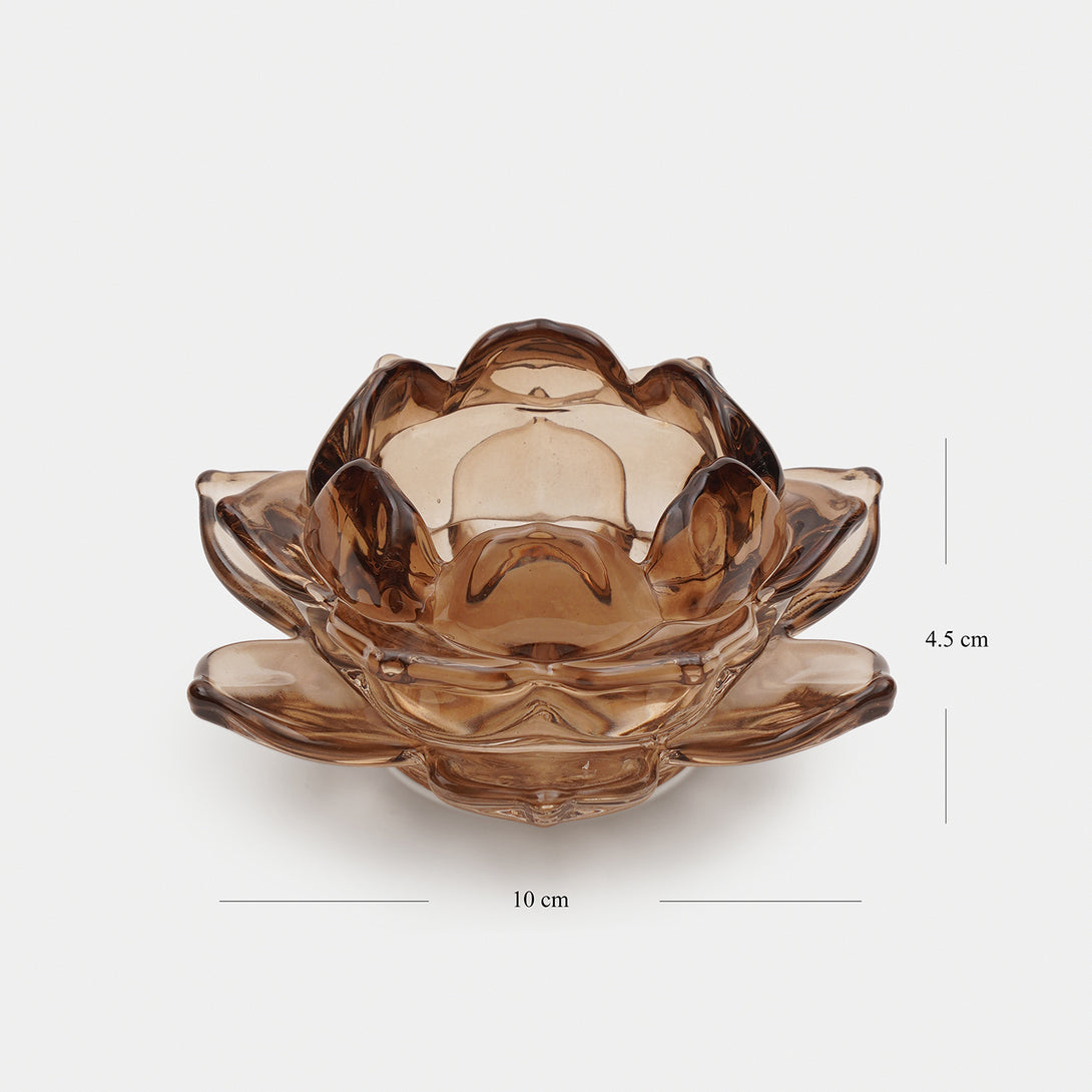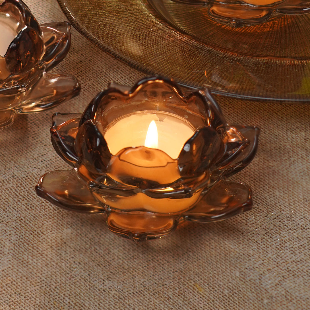 Illuminate your space with the warm glow of these amber lotus-shaped tea light holders. Their sculpted petals add a touch of serenity and timeless charm to any setting.
