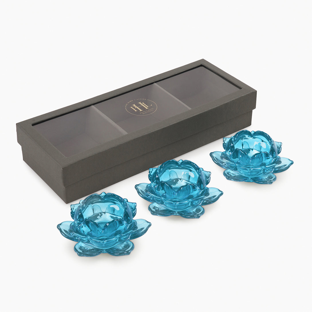 Set of 3 Blue Glass Lotus Shaped Tealight Holders
