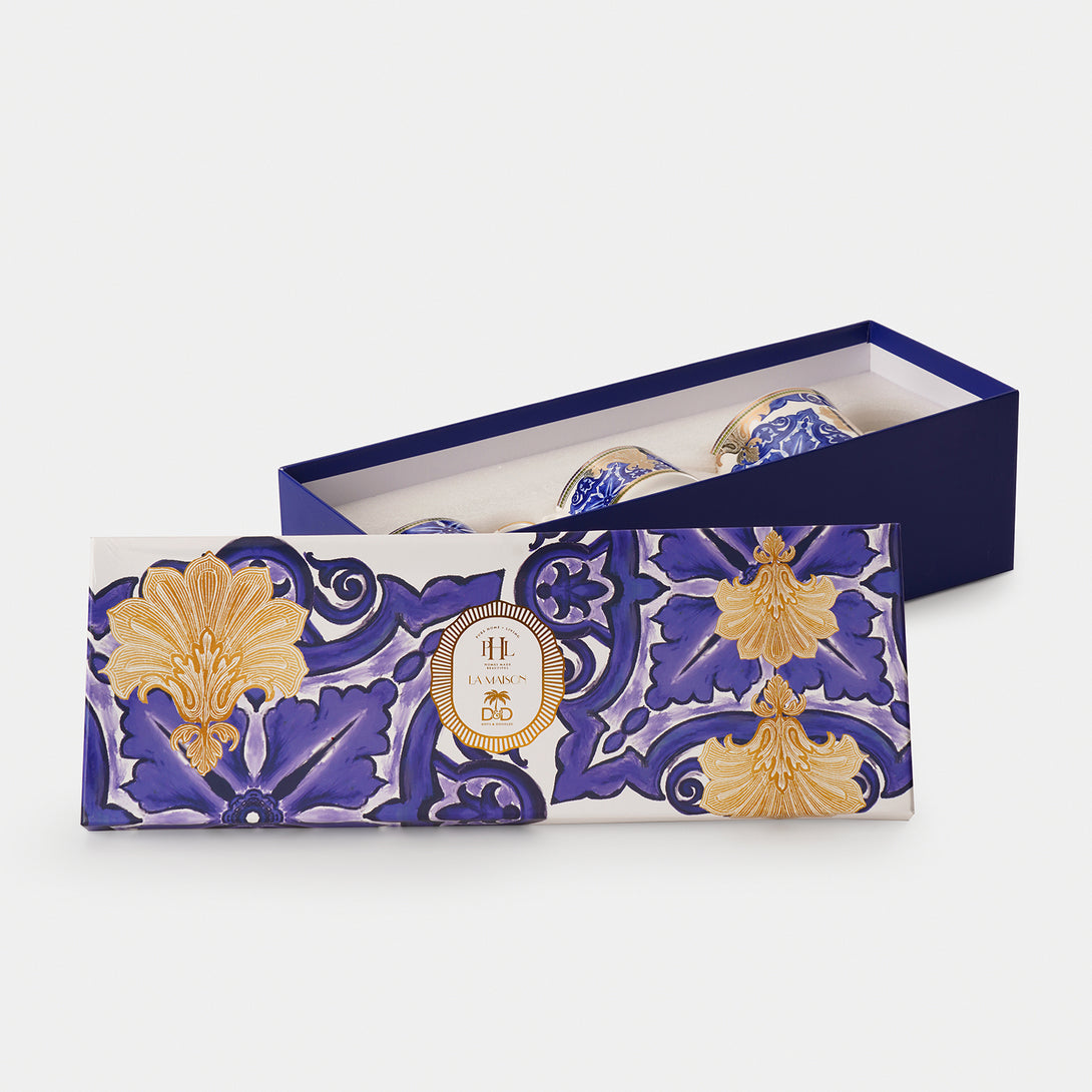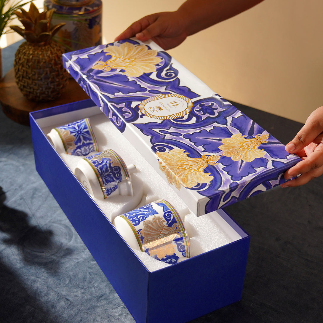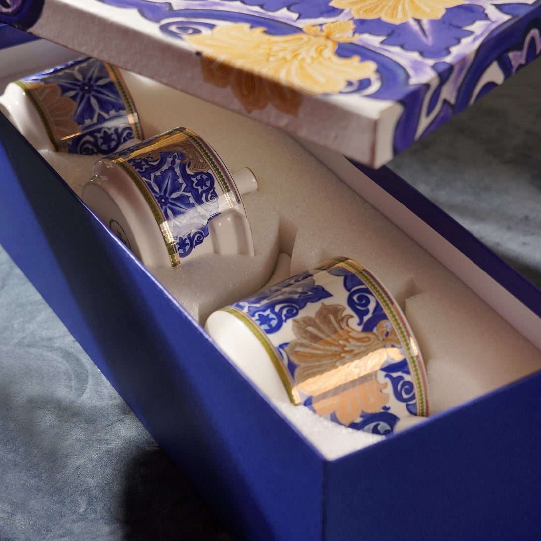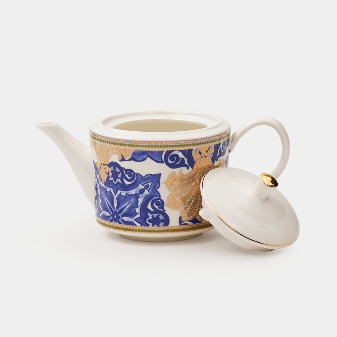 This blue Amalfi print tea pot, creamer and sugar pot features intricate Mediterranean-inspired patterns and golden detailing. A perfect blend of elegance and charm for your coffee moments.