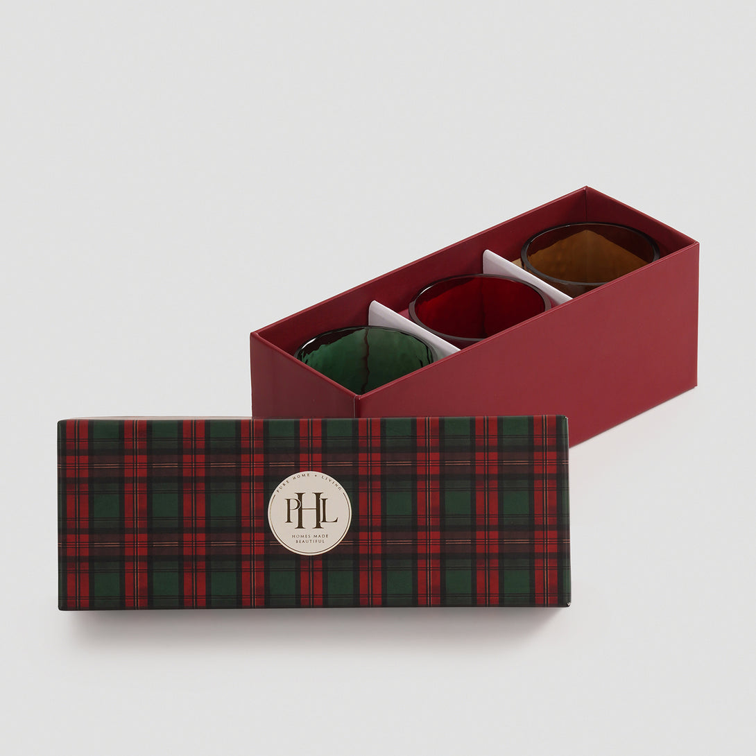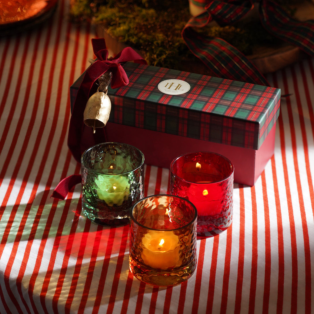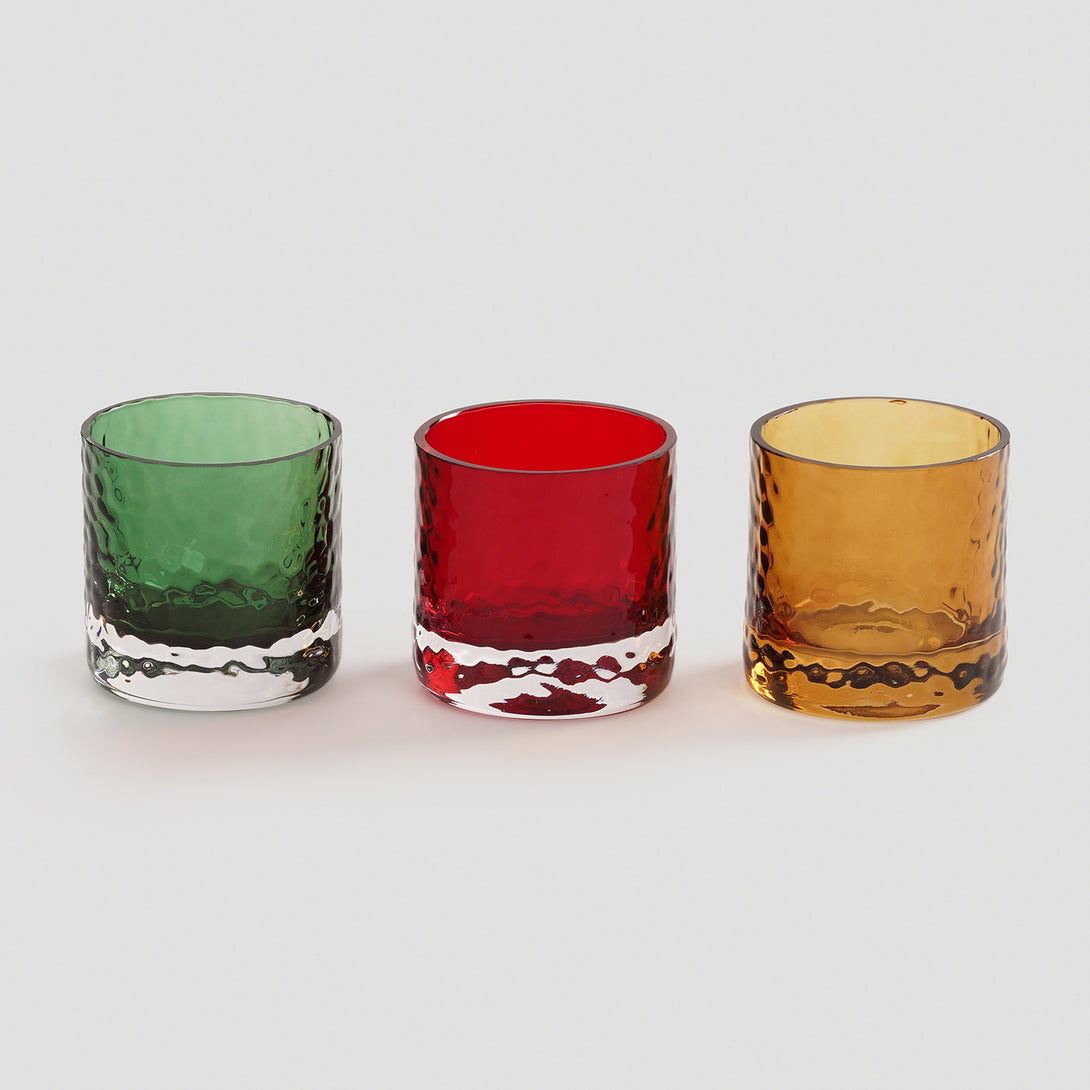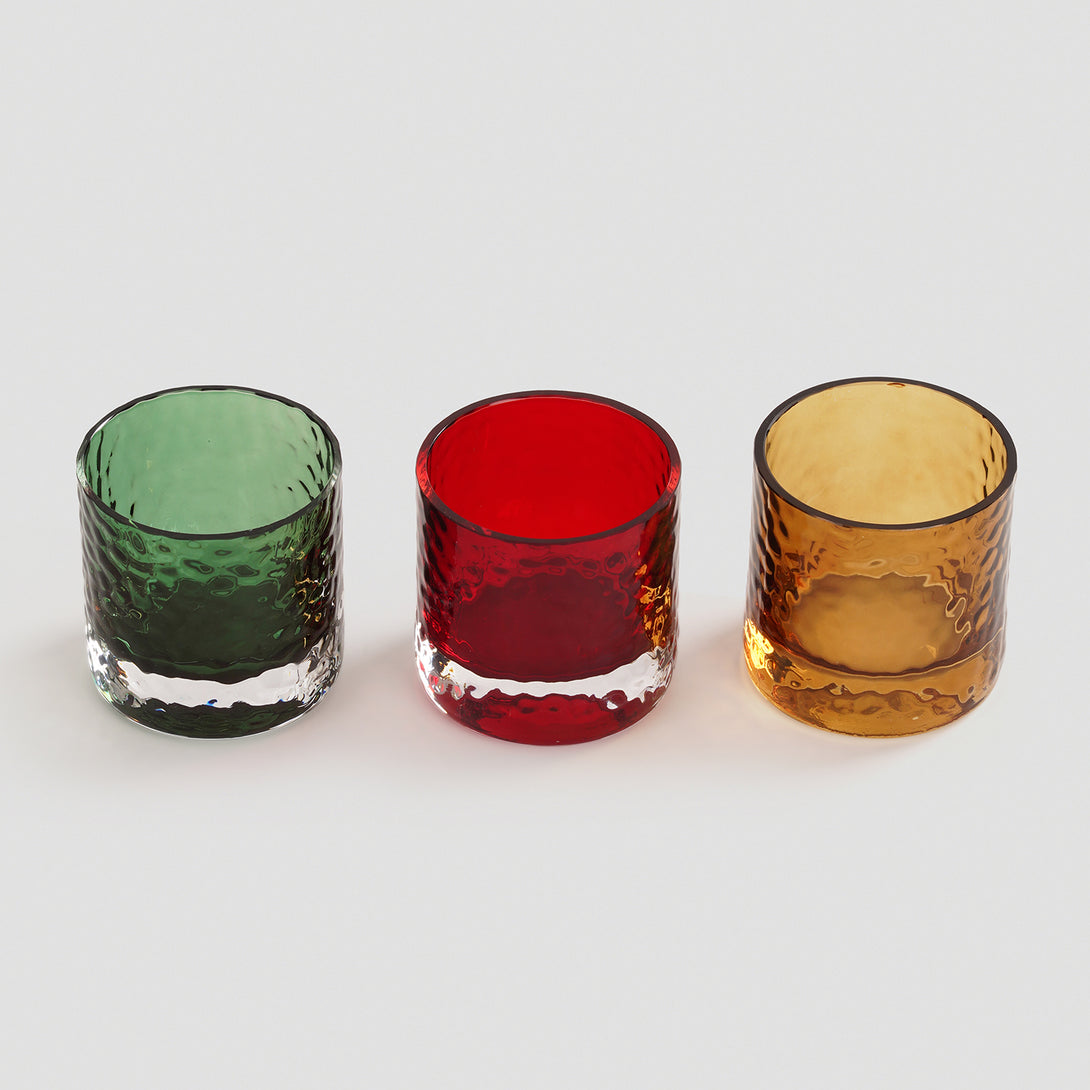Set Of 3 Green Red Amber Hammered Glass Tealight Holders