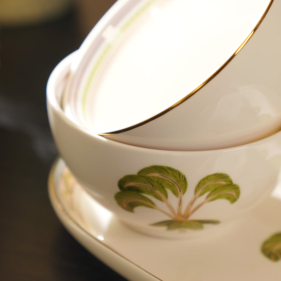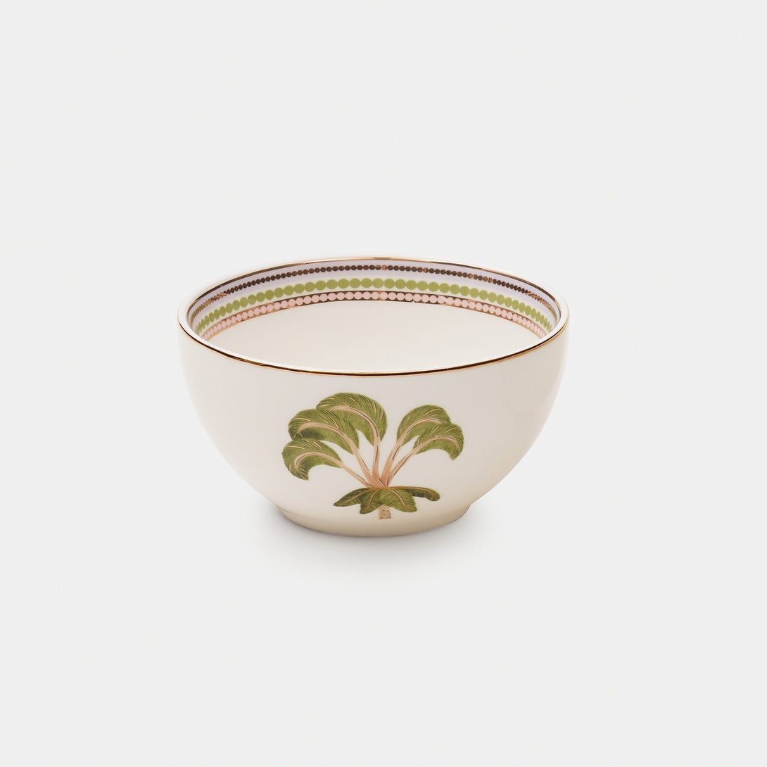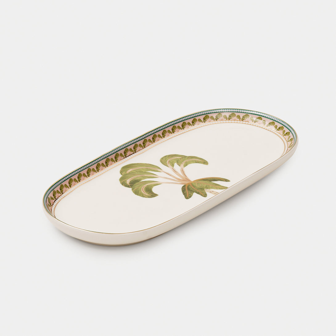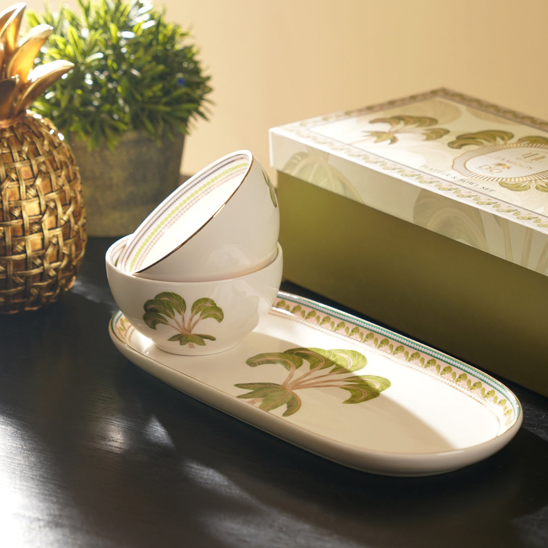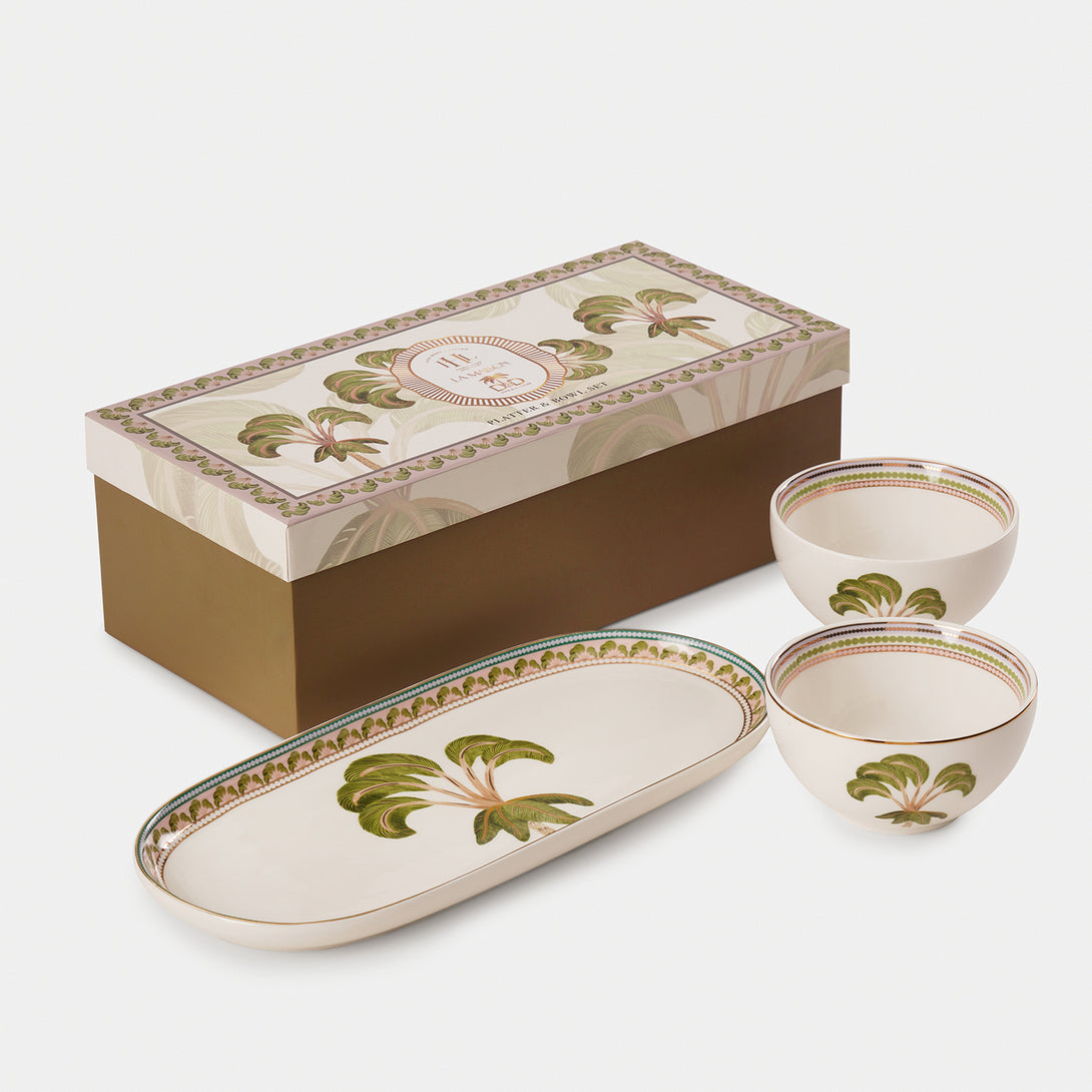 This green solen print platter and bowl set features elegant botanical motifs and fine detailing. Ideal for serving snacks, desserts, or festive treats with a touch of sophistication.