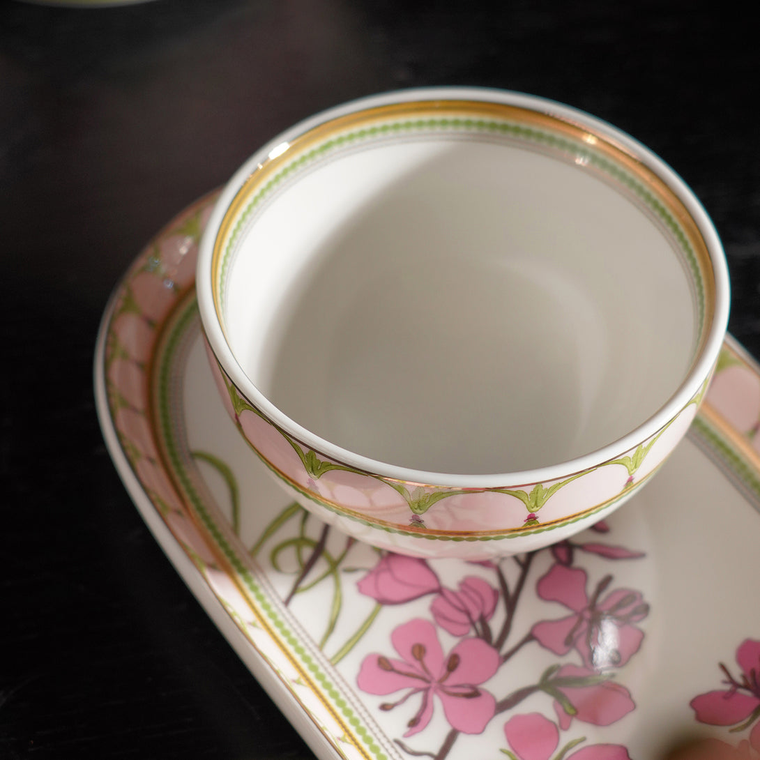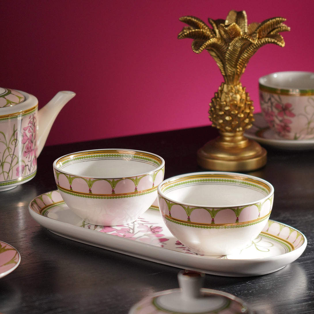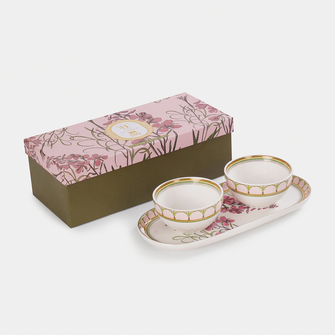 Elevate your serving style with this set of 3 pink tuileries print platters and bowls, featuring elegant floral motifs and gold accents. Perfect for serving snacks or desserts with a touch of timeless charm.