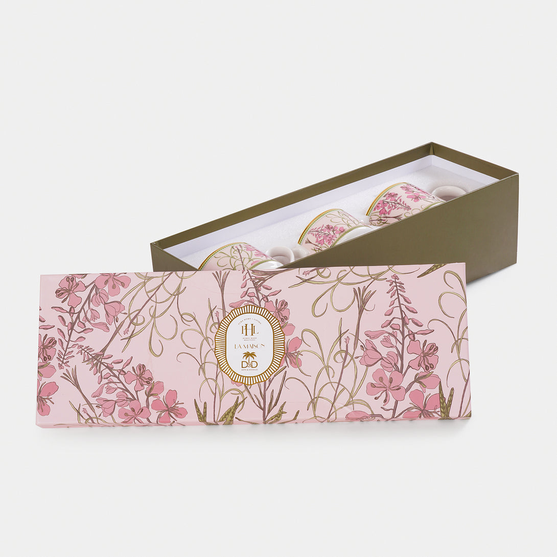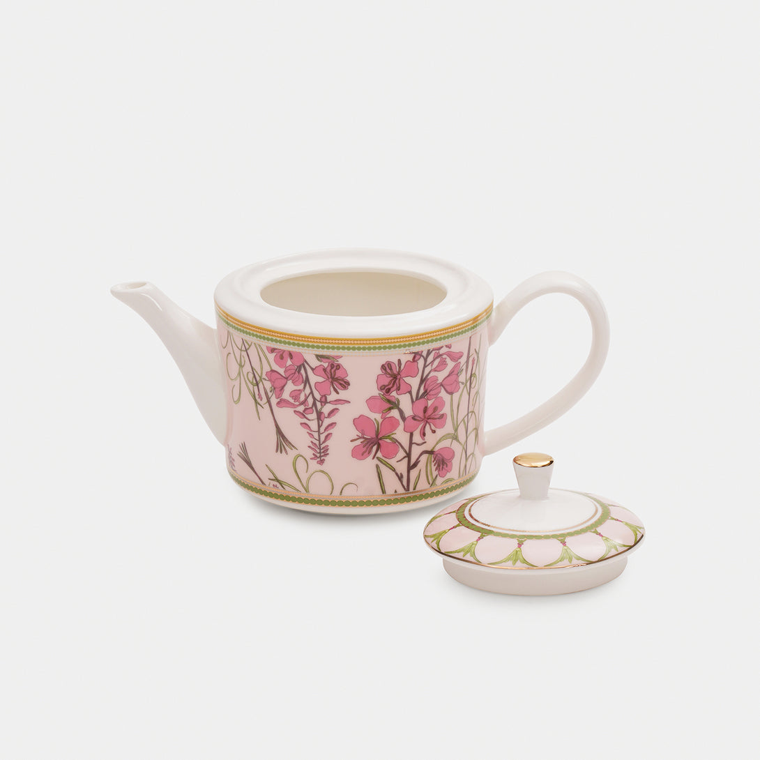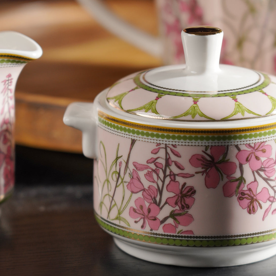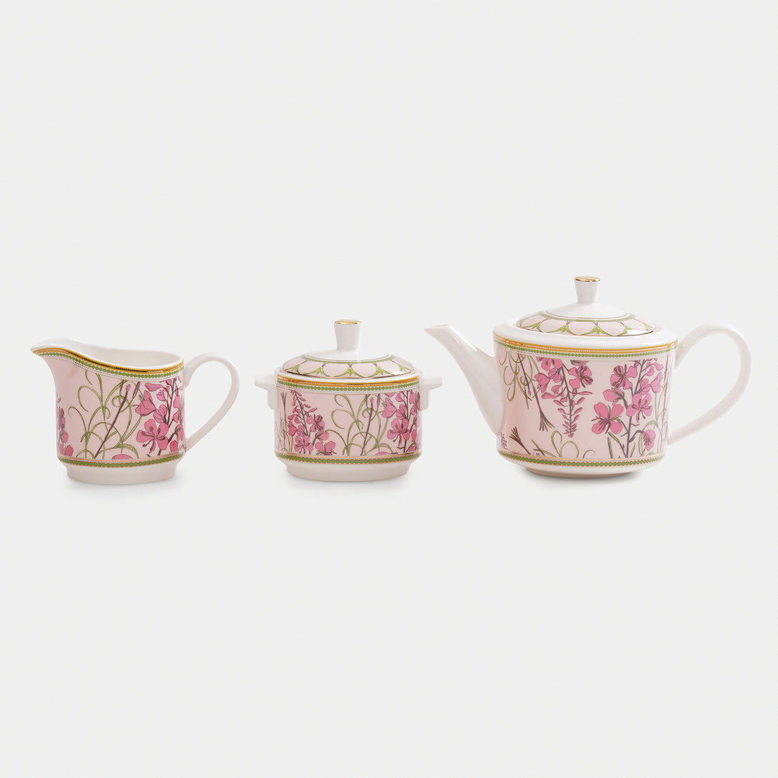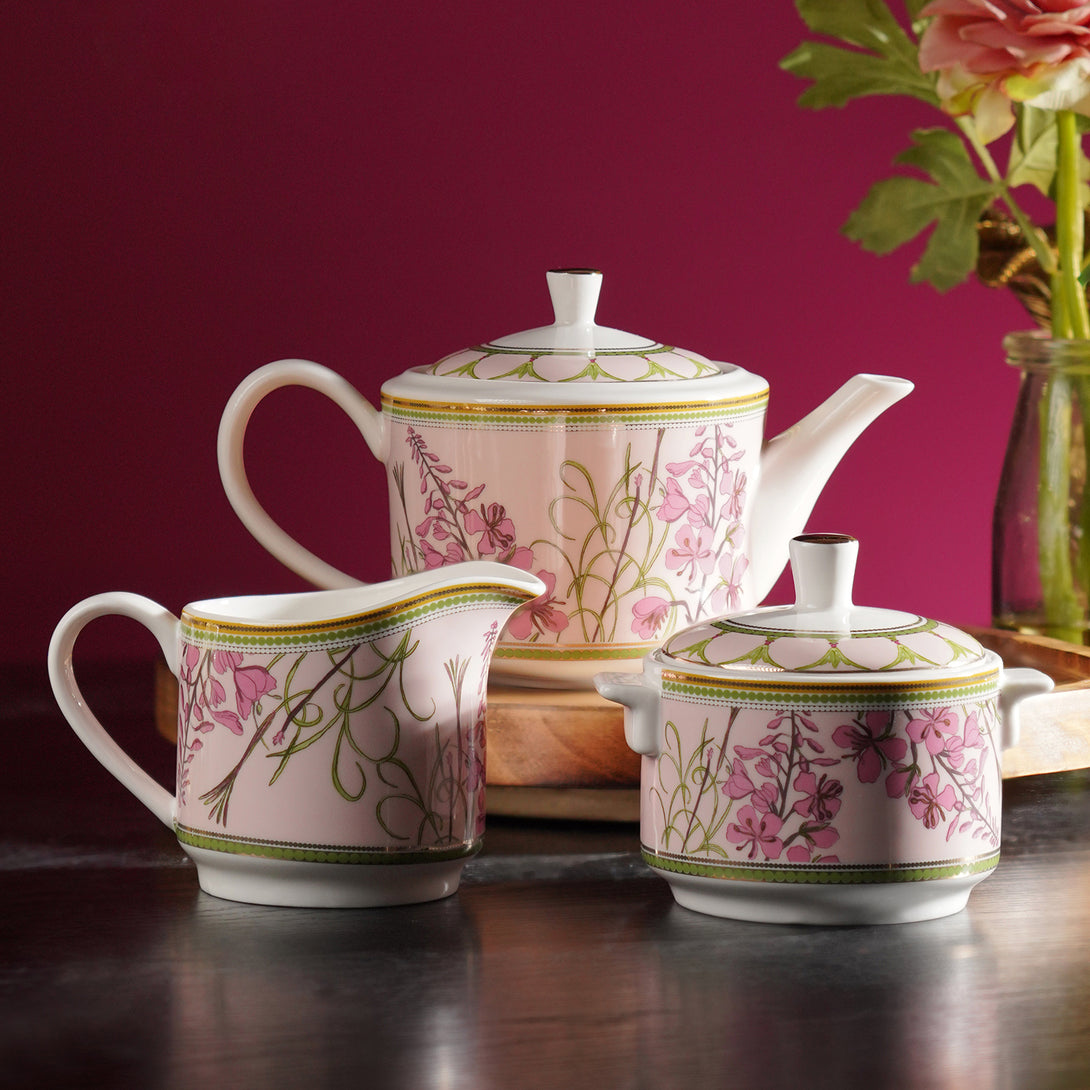 Brew and serve in style with this elegant pink tuileries print tea set, featuring a teapot, creamer, and sugar pot adorned with delicate floral motifs. A perfect blend of charm and sophistication for your tea-time rituals.