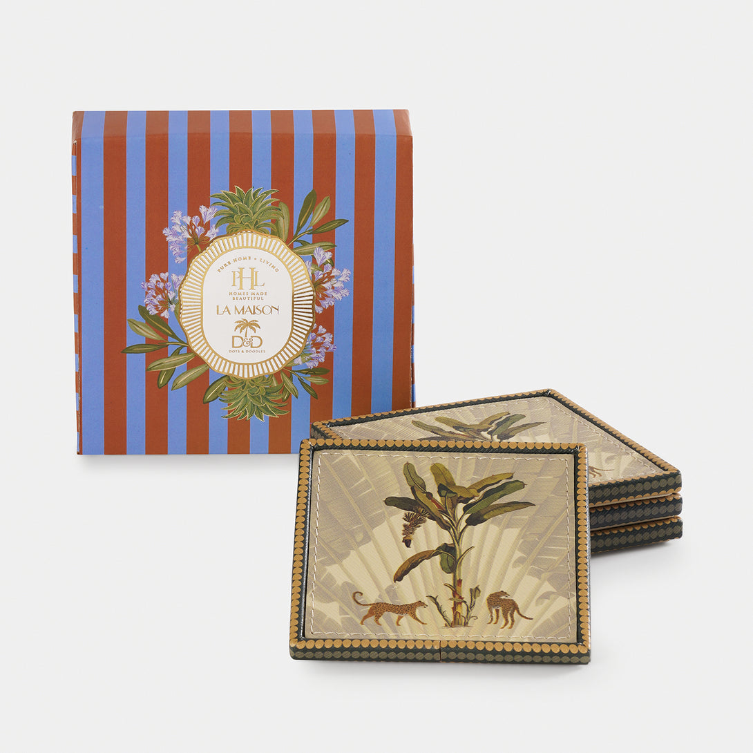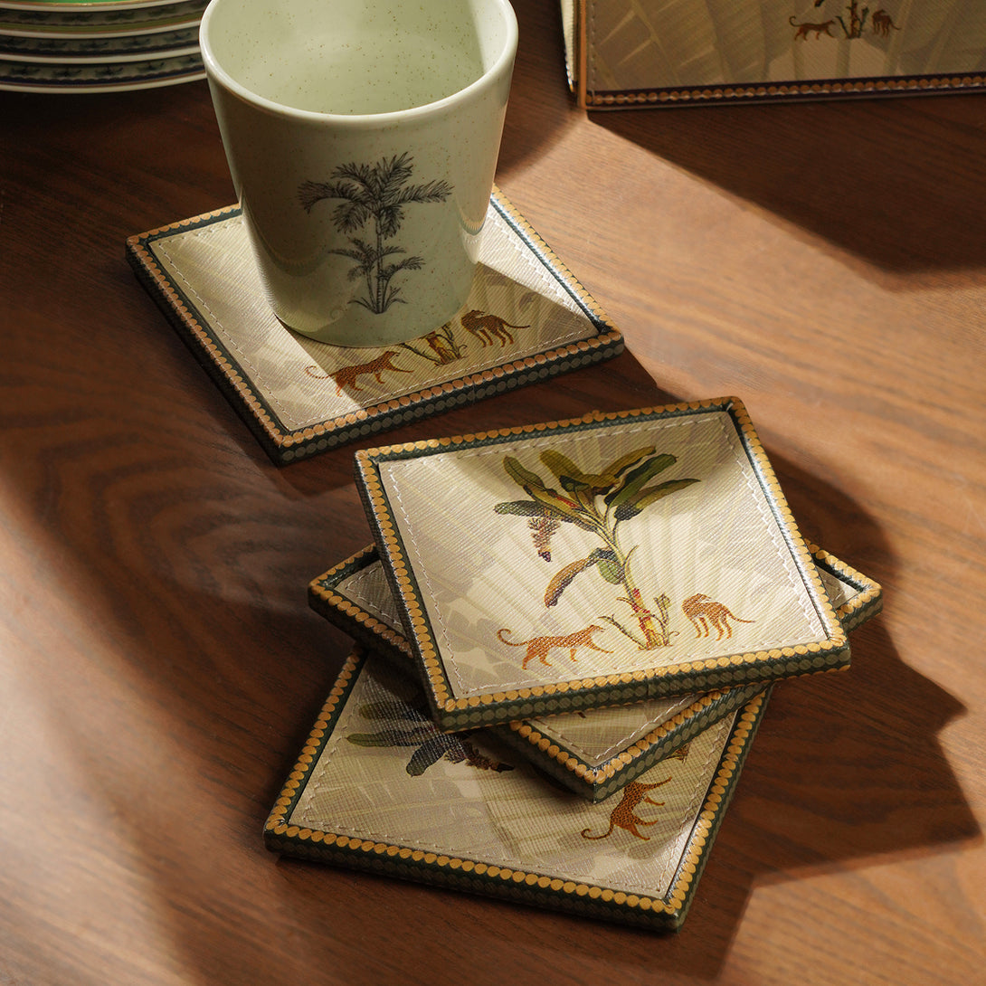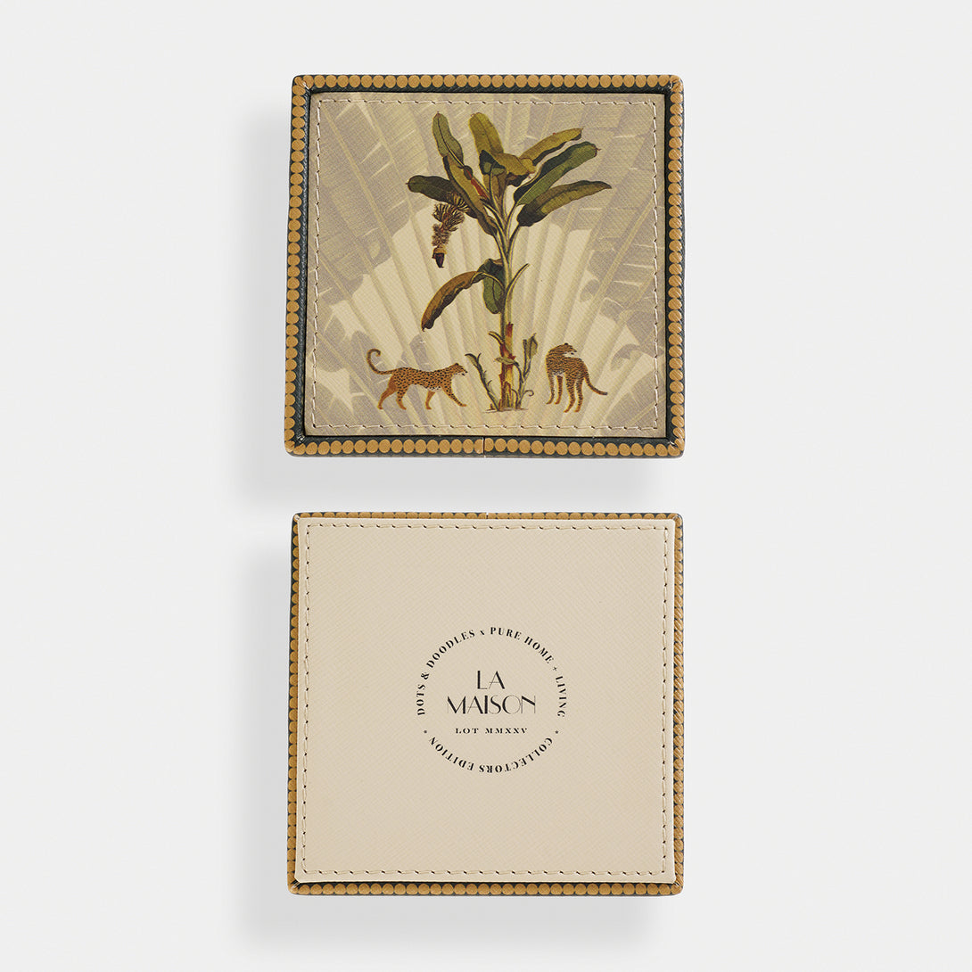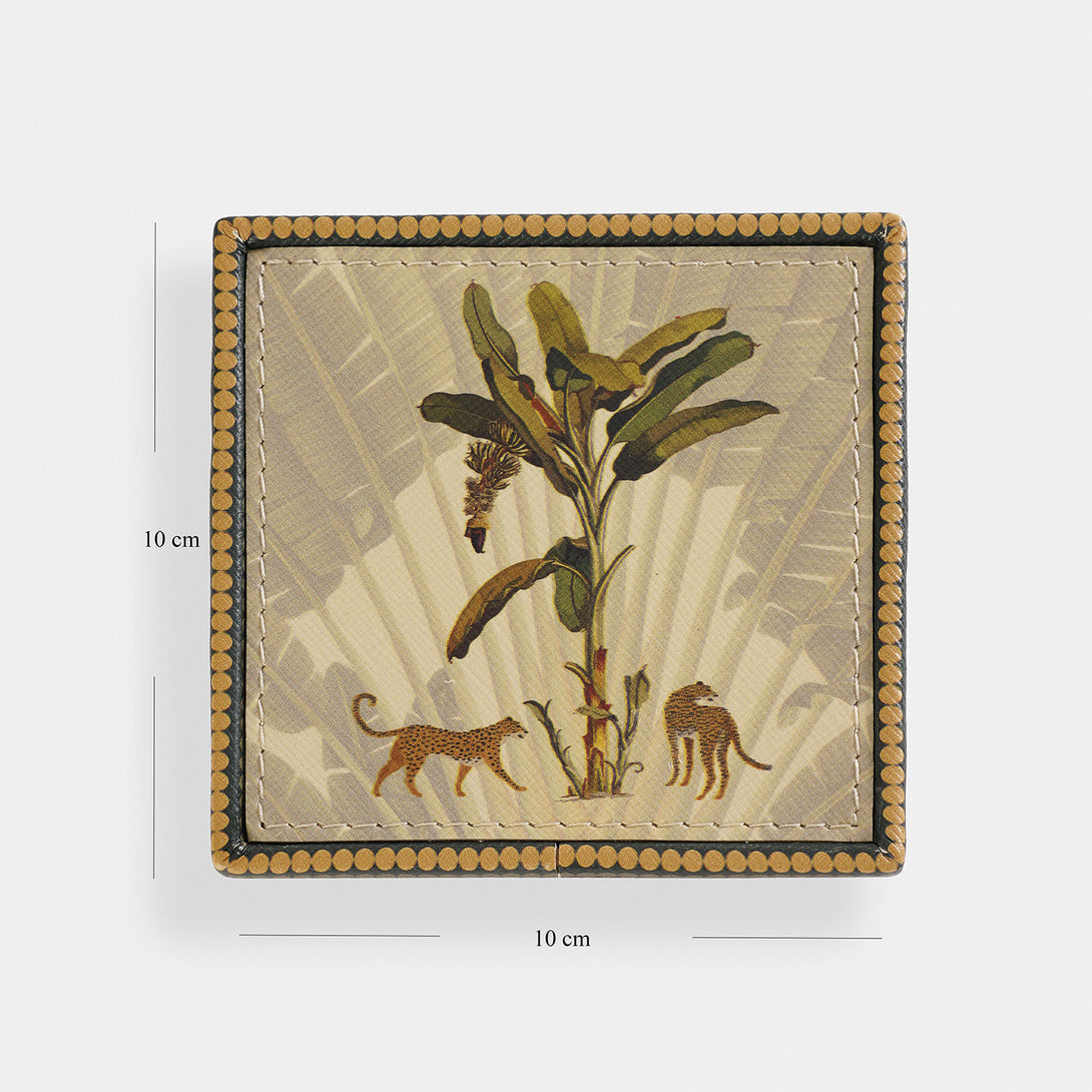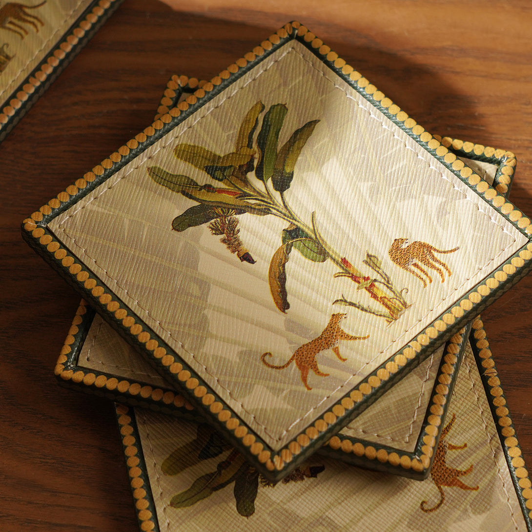These leopard print coasters feature a detailed jungle-inspired design with leopards and tropical foliage. Framed with a patterned border, these coasters add an exotic touch while protecting surfaces, making them both decorative and practical.