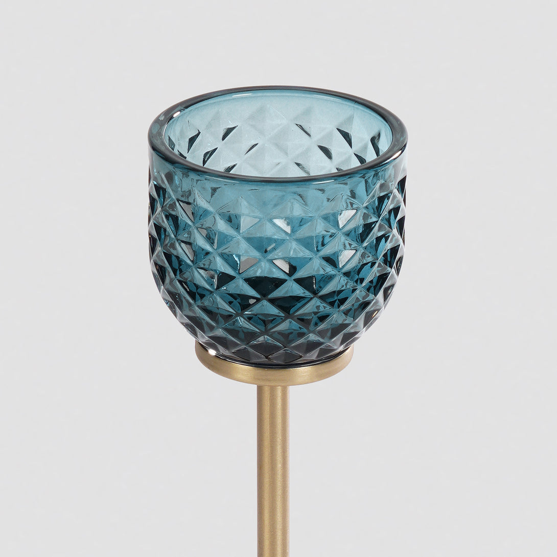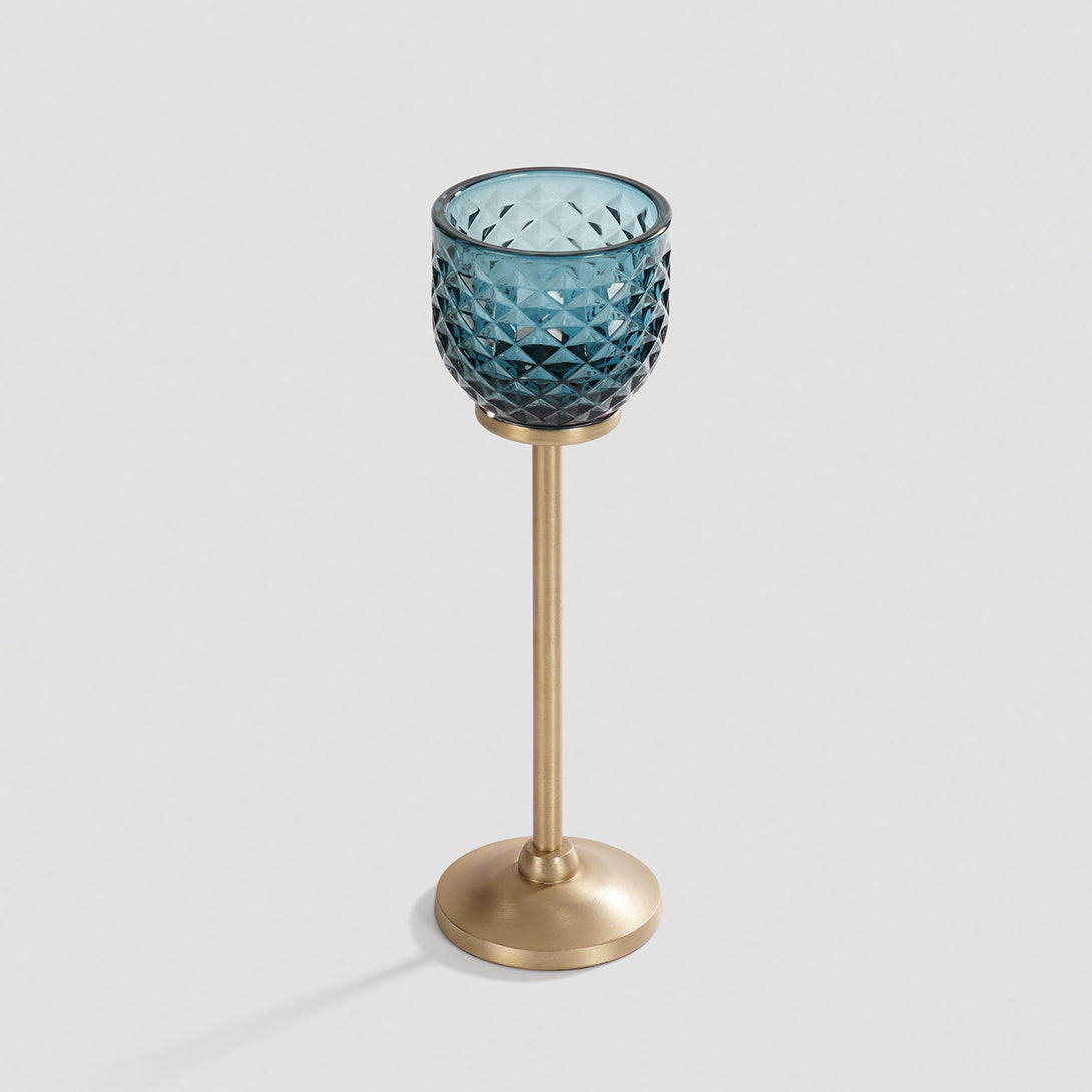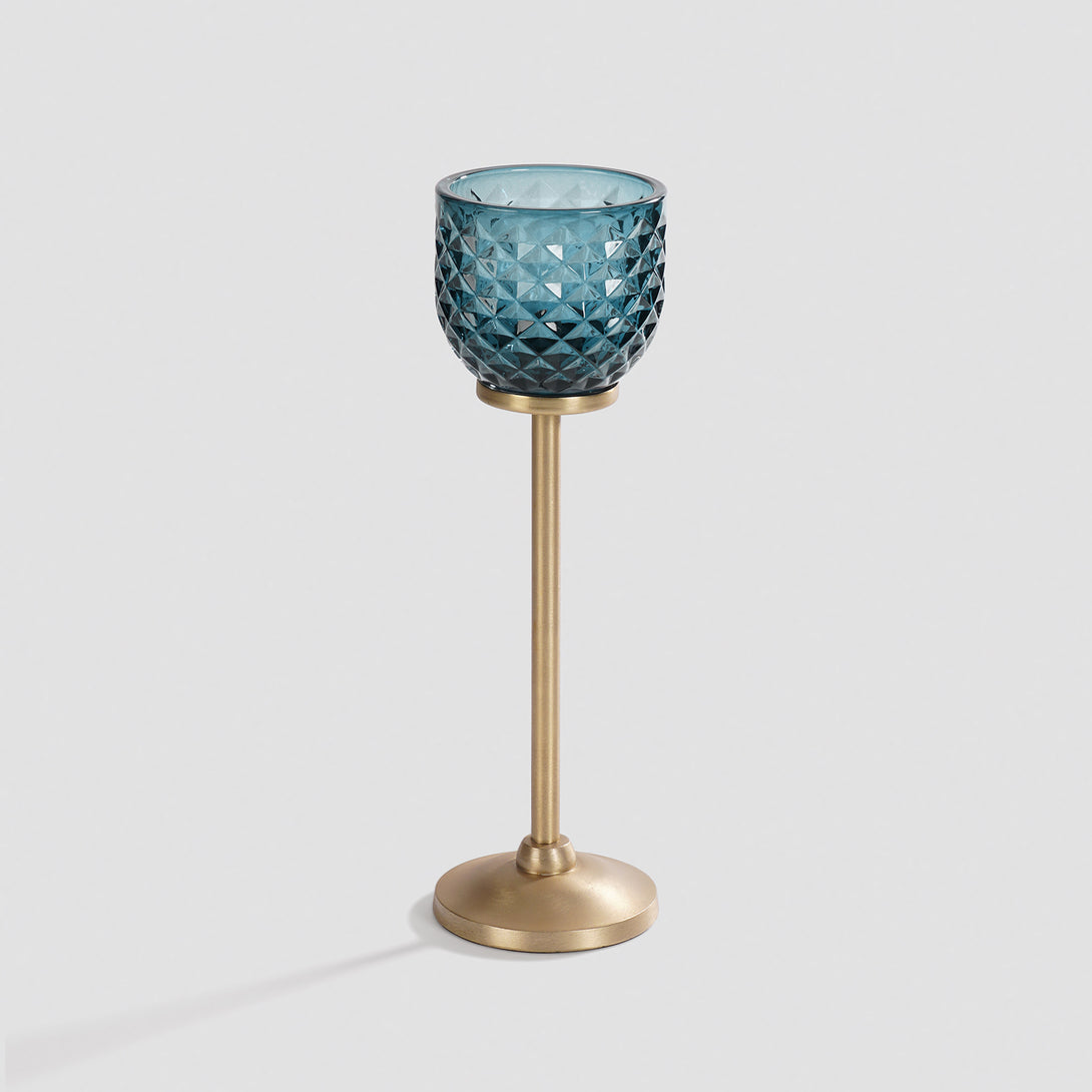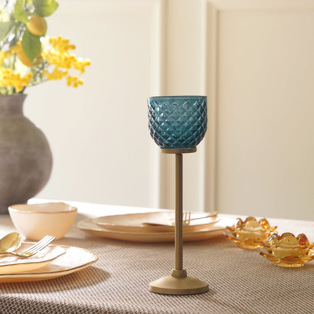 This teal glass votive holder on a tall metallic stand brings a warm, golden glow to any space. Its diamond texture beautifully reflects candlelight, creating a striking play of light and shadow that feels both modern and timeless.