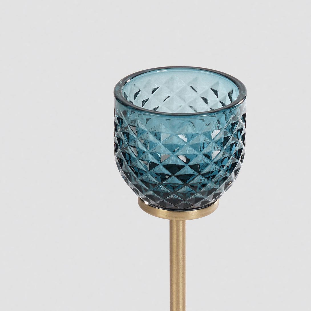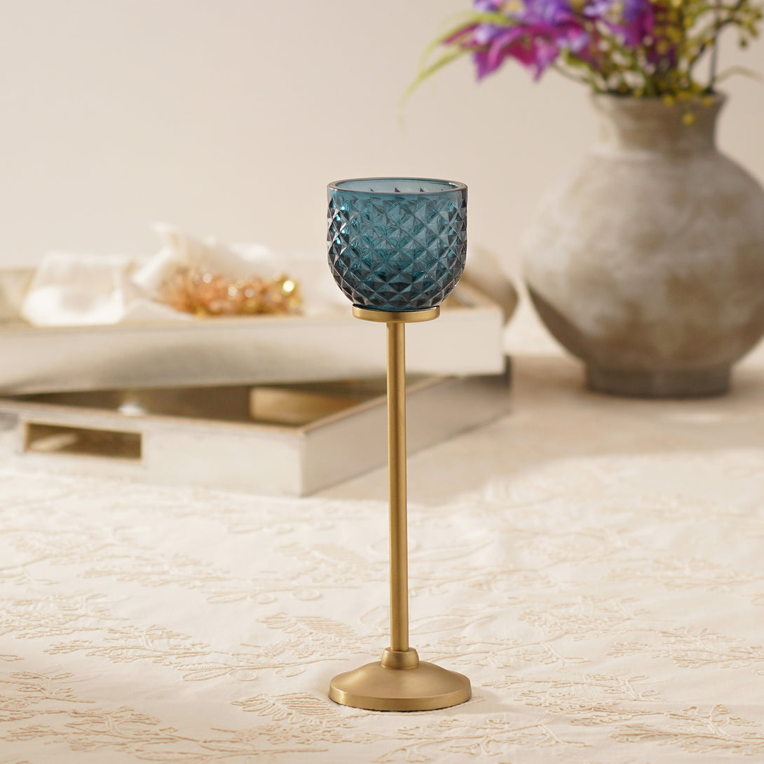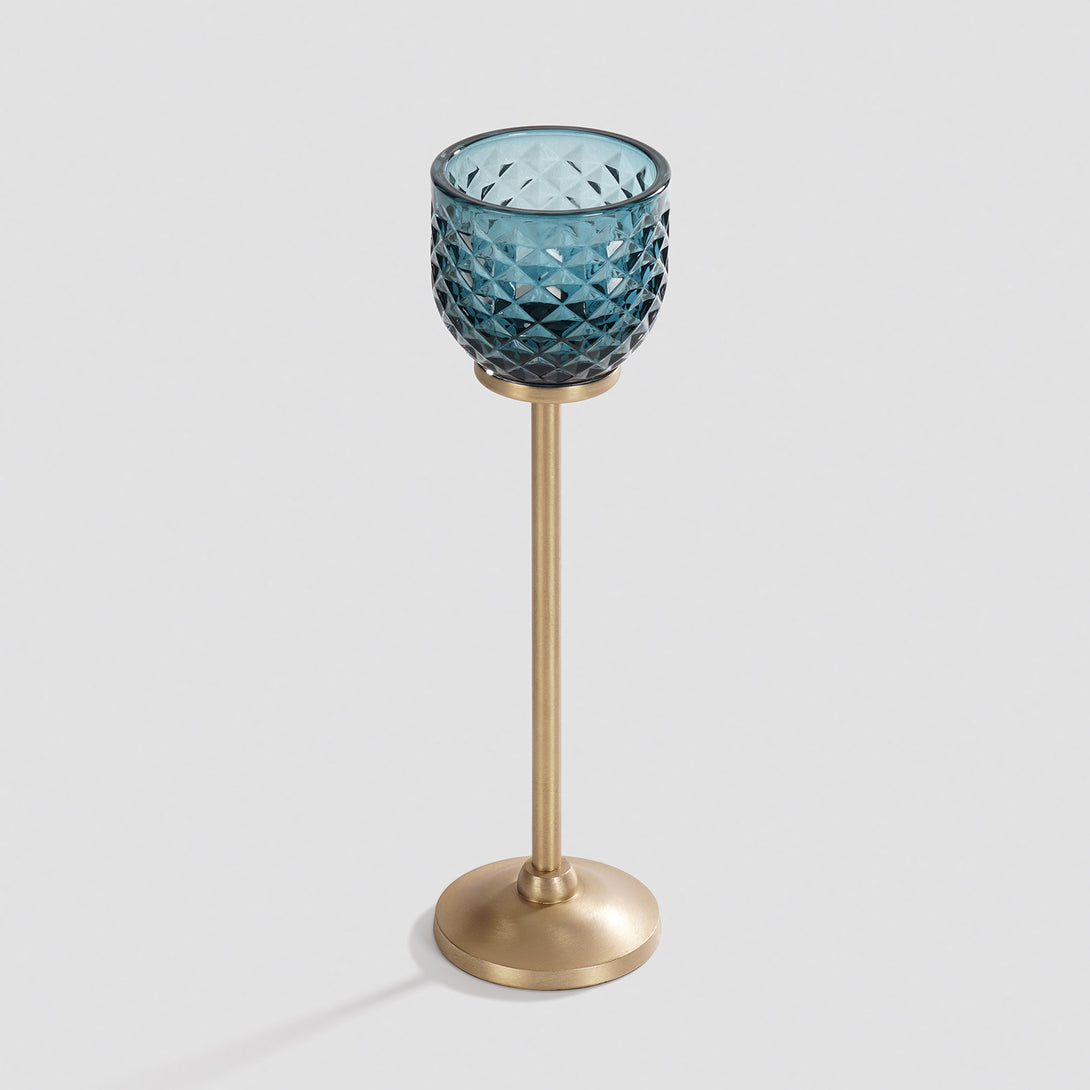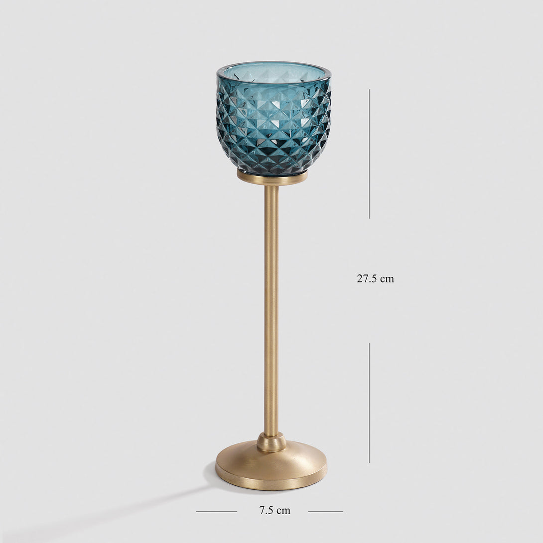 This teal glass votive holder on a tall metallic stand brings a warm, golden glow to any space. Its diamond texture beautifully reflects candlelight, creating a striking play of light and shadow that feels both modern and timeless.