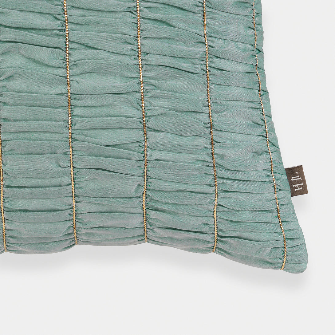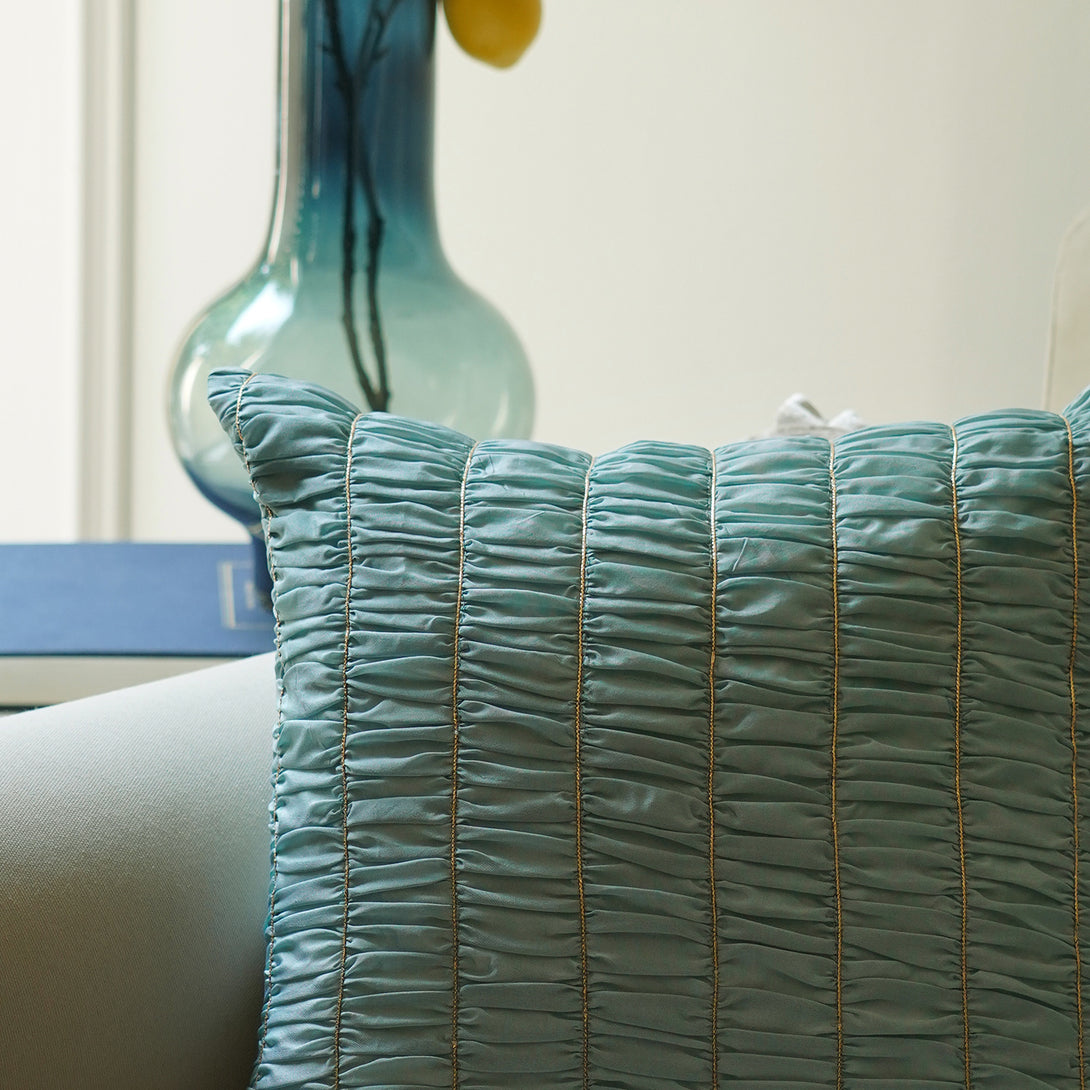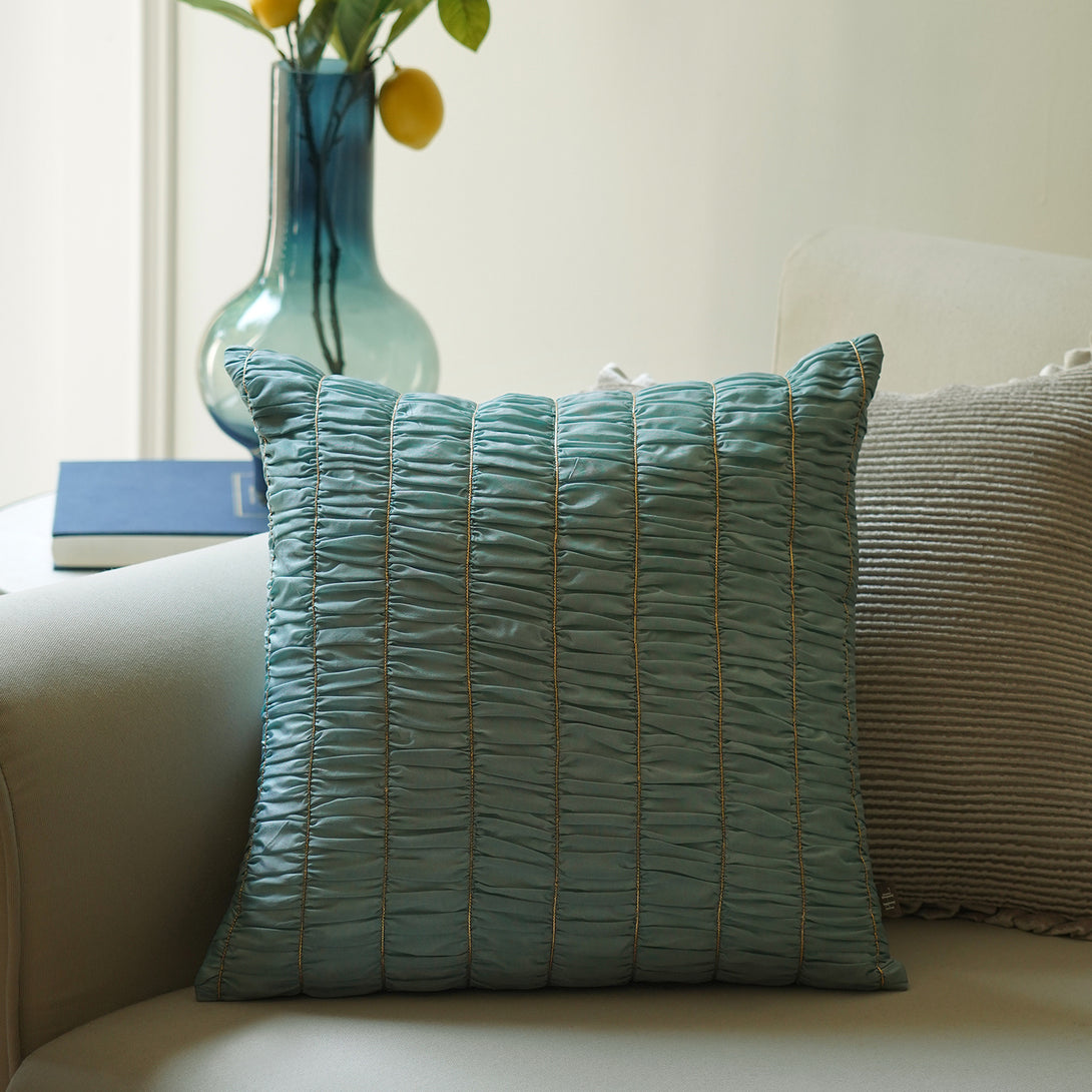 This teal cushion cover features a textured, ruched design accented with fine golden vertical stitching. Its rich tone and elegant detailing bring a touch of sophistication and depth to any modern living space.