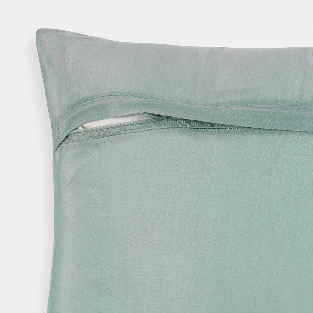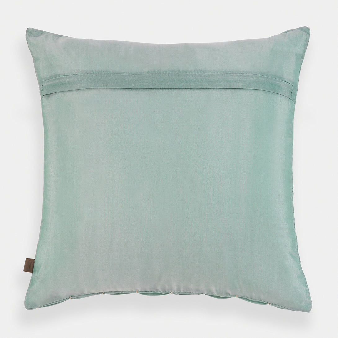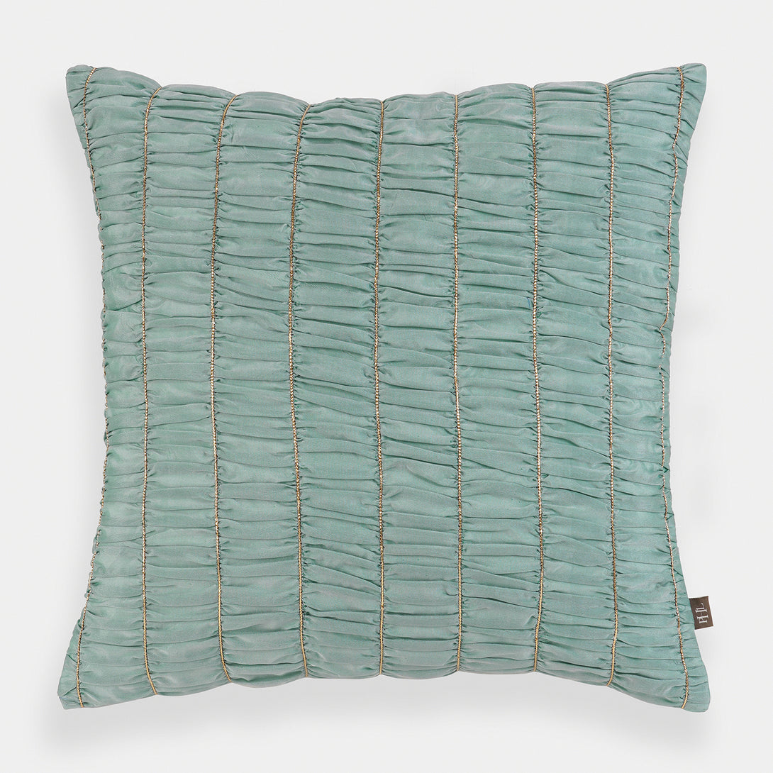 This teal cushion cover features a textured, ruched design accented with fine golden vertical stitching. Its rich tone and elegant detailing bring a touch of sophistication and depth to any modern living space.
