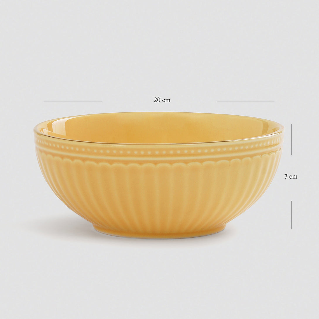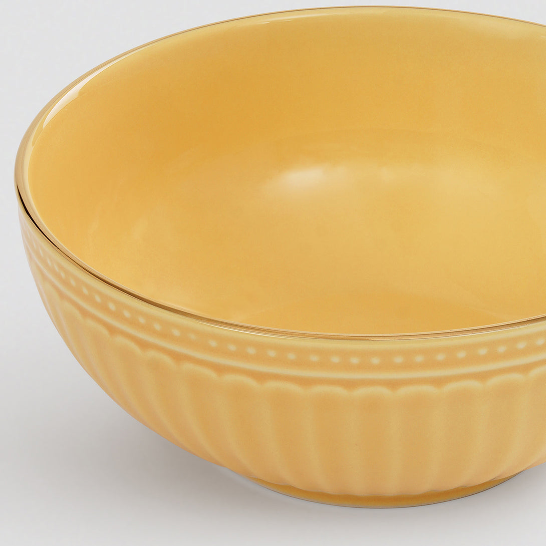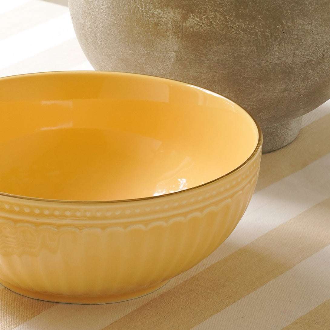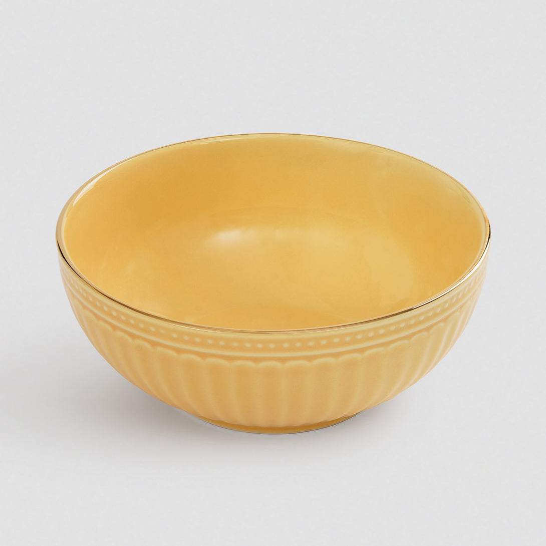 Crafted with precision and detailed with a 24-karat real gold rim, this yellow serving bowl features a calming shade and wide ribbed detail that will turn ordinary dinners into exquisite feasts.